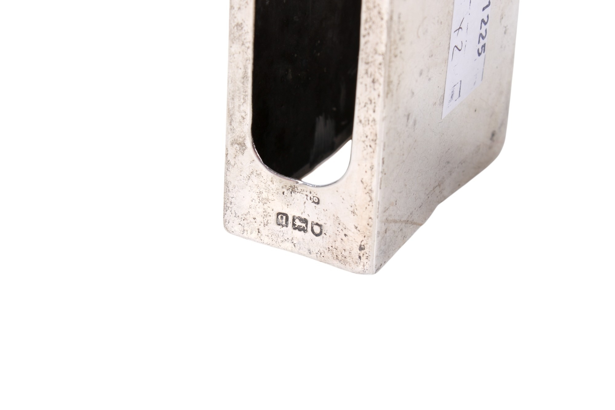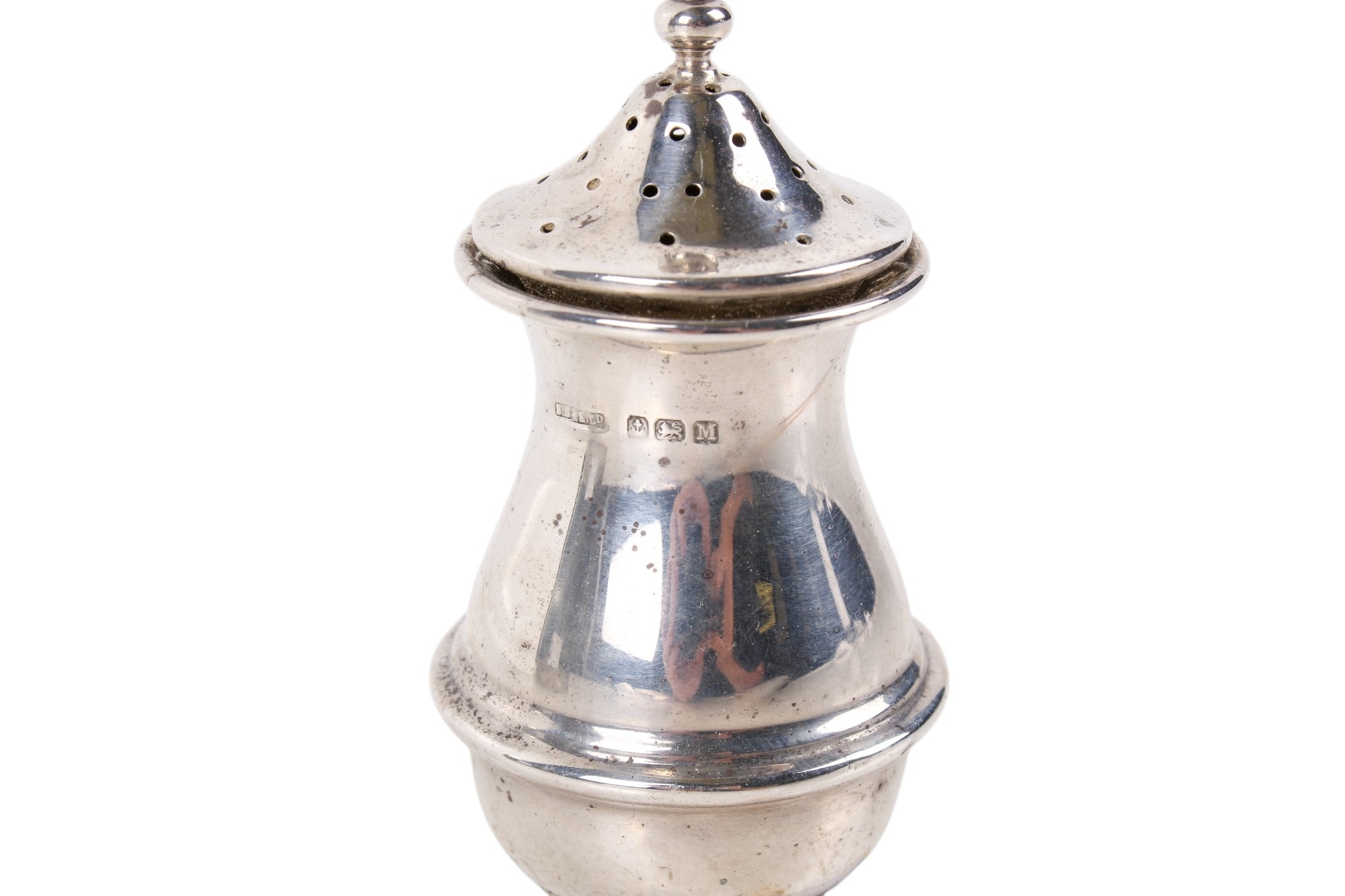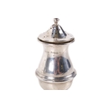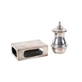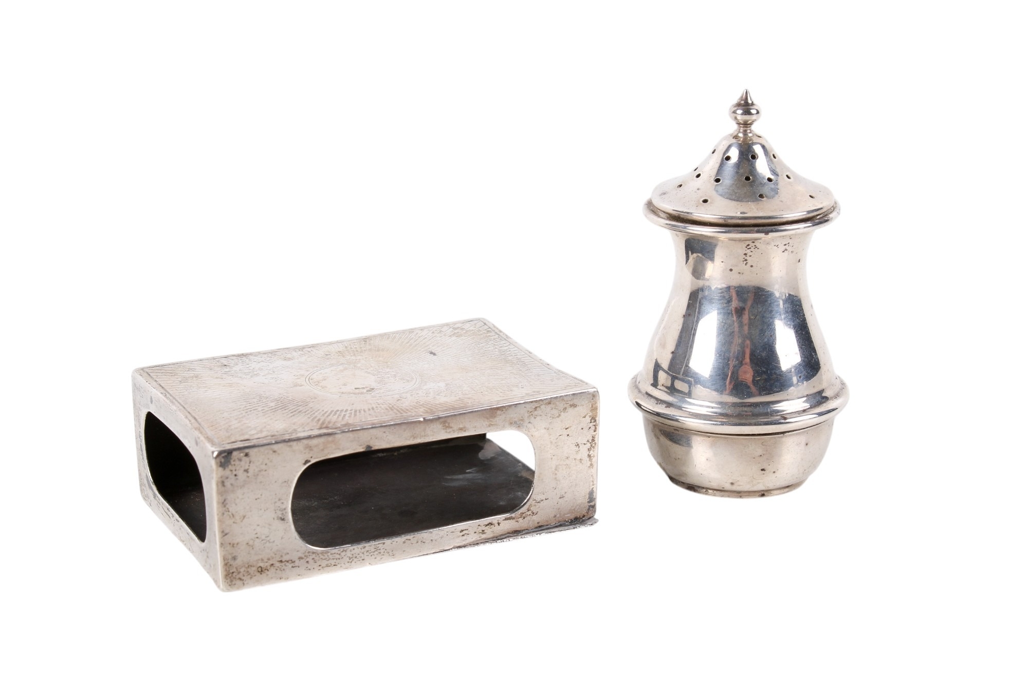 A silver matchbox cover and a pepper pot. The cover with engraved sun ray pattern, hallmarks for London 1911, 7.5cm x 5.1cm x 2.5cm, the pot of squat form, Birmingham 1936, gross weight 80.9g.
