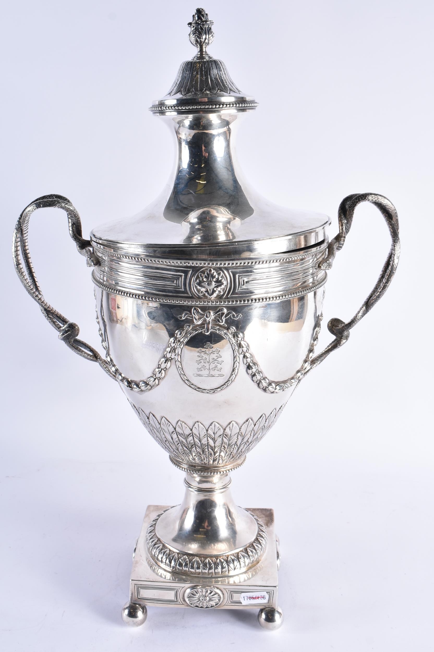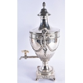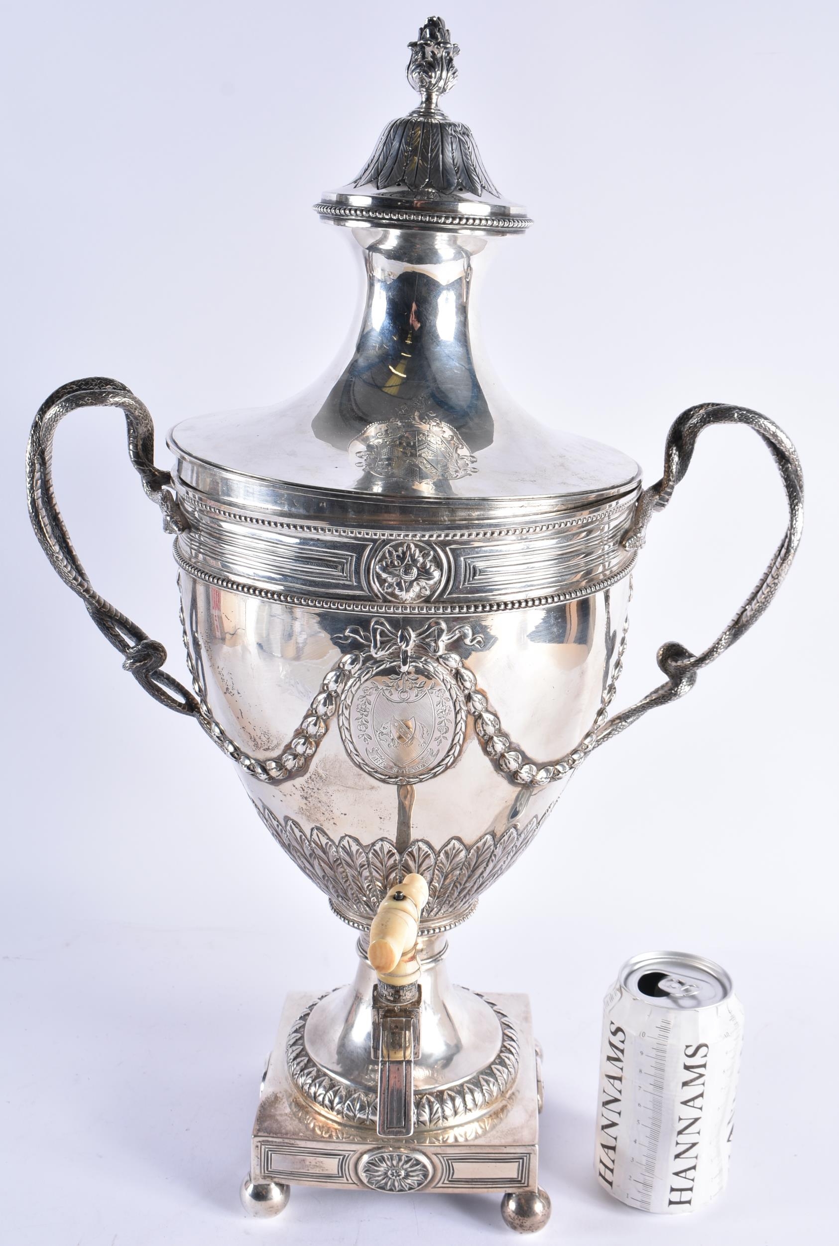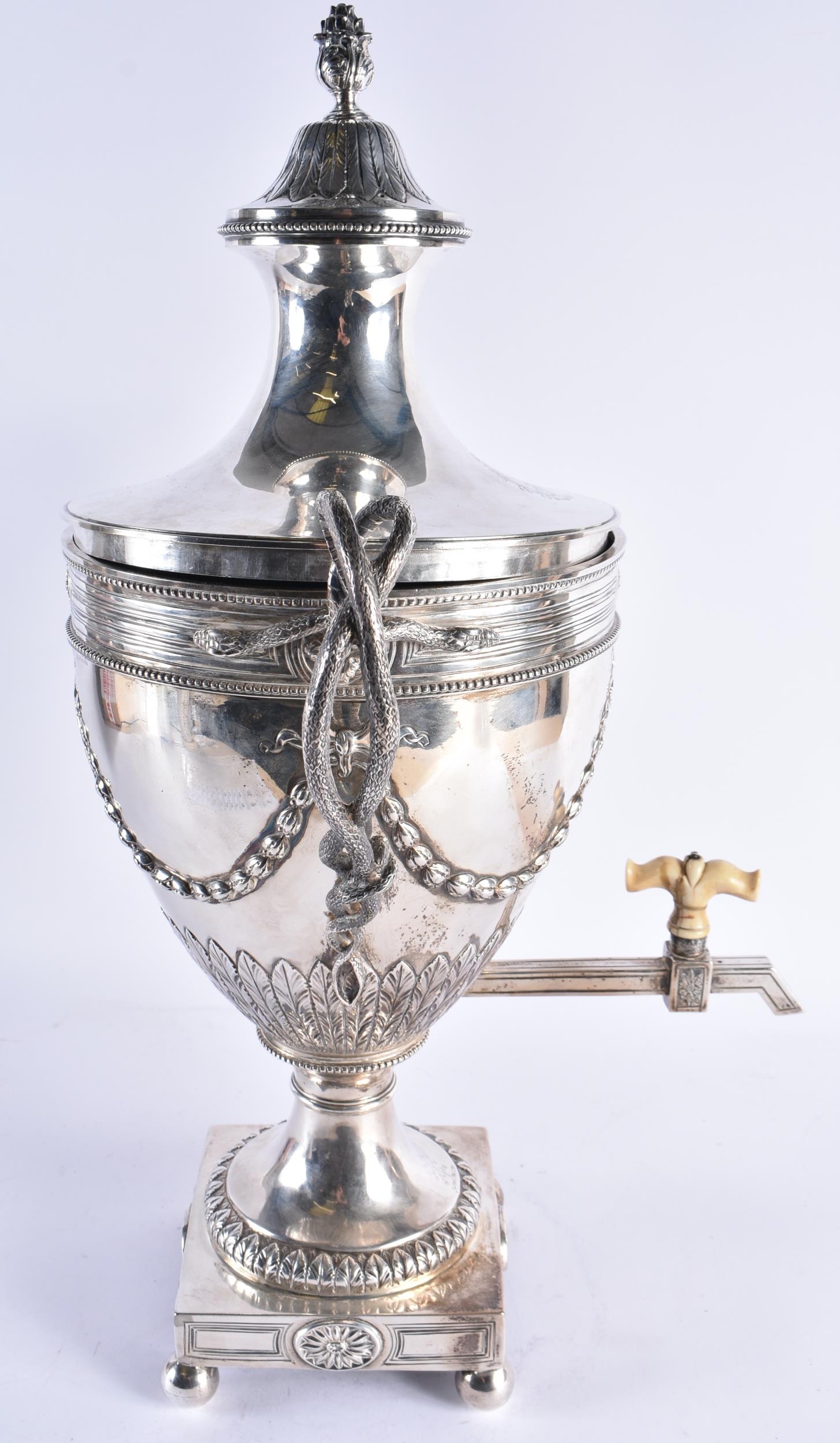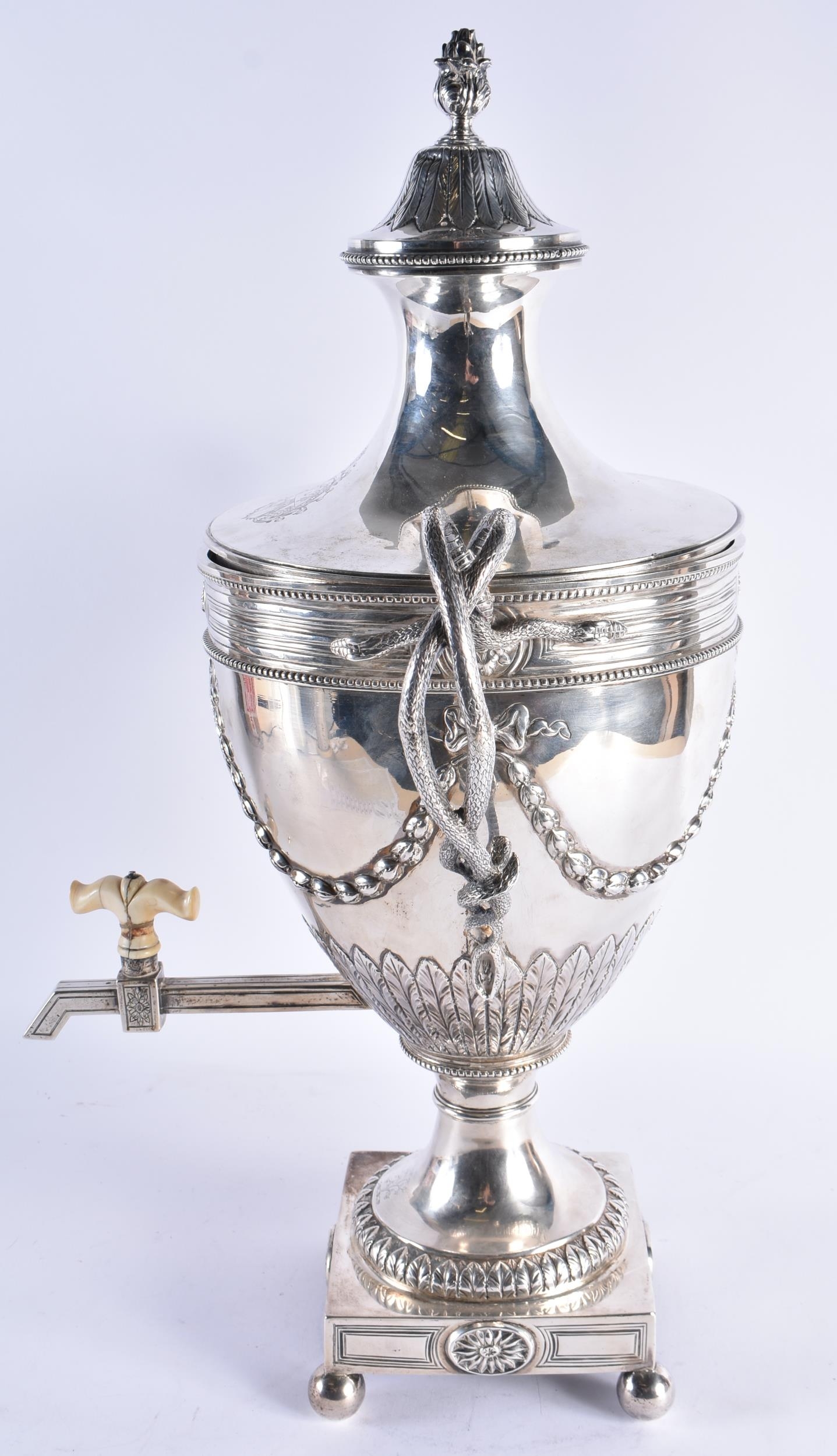 A GOOD GEORGE III SILVER ADAM-STYLE TEA URN with leaf cast finial and coat of arms to the lift of lid above a urn shaped body with swag work and serpent side handles, with twist handle; raised on a square plinth base - London 1774, 3372 grams. Reference: H4BDTHHY. 50 cm x 30 cm.