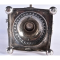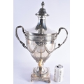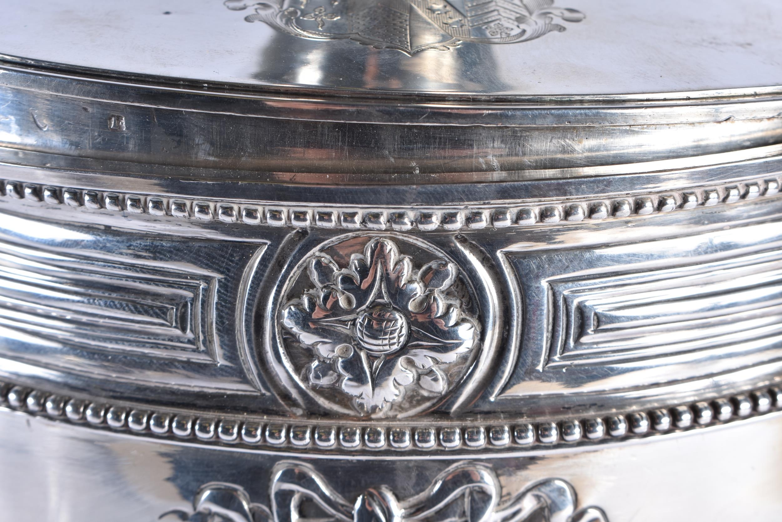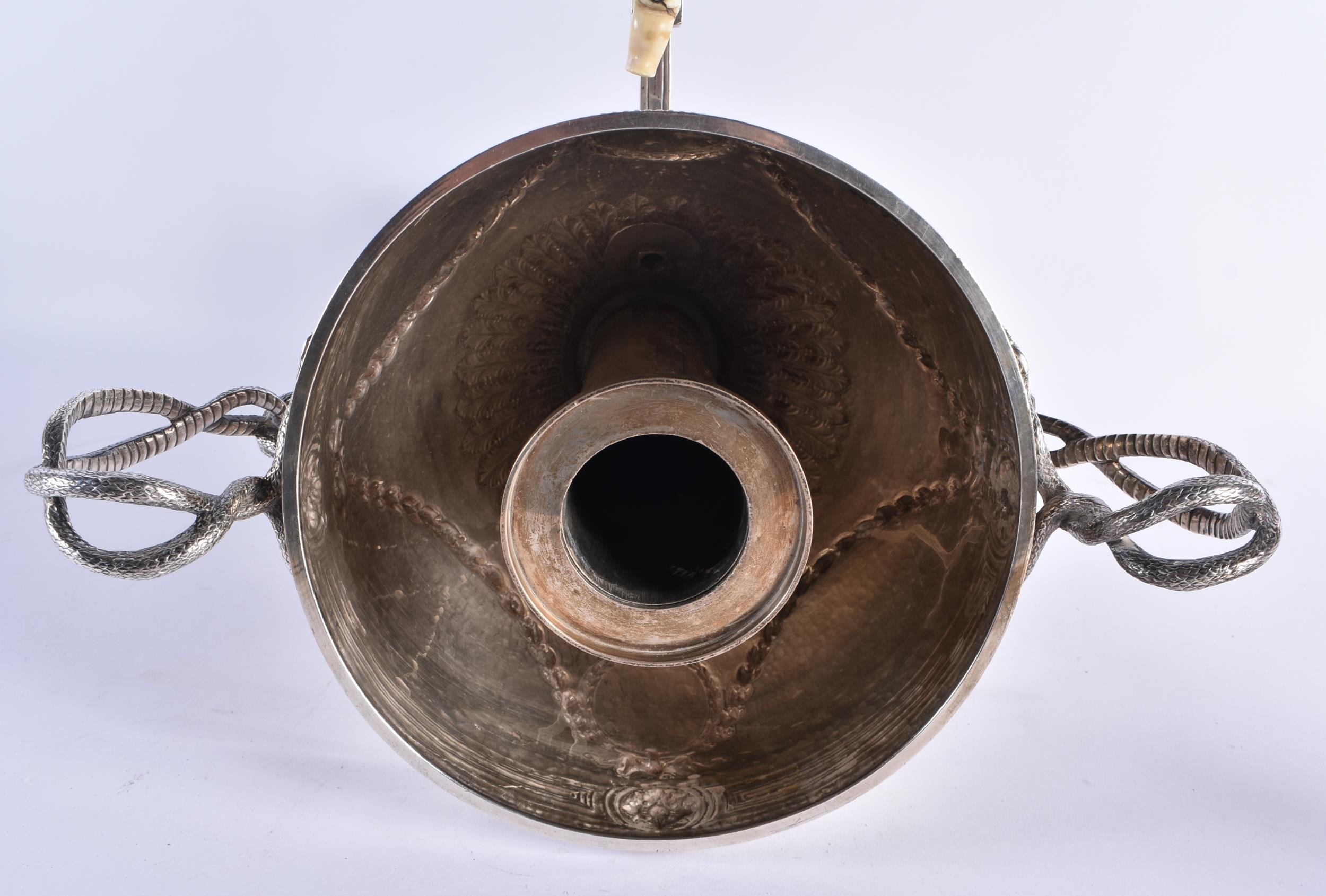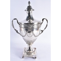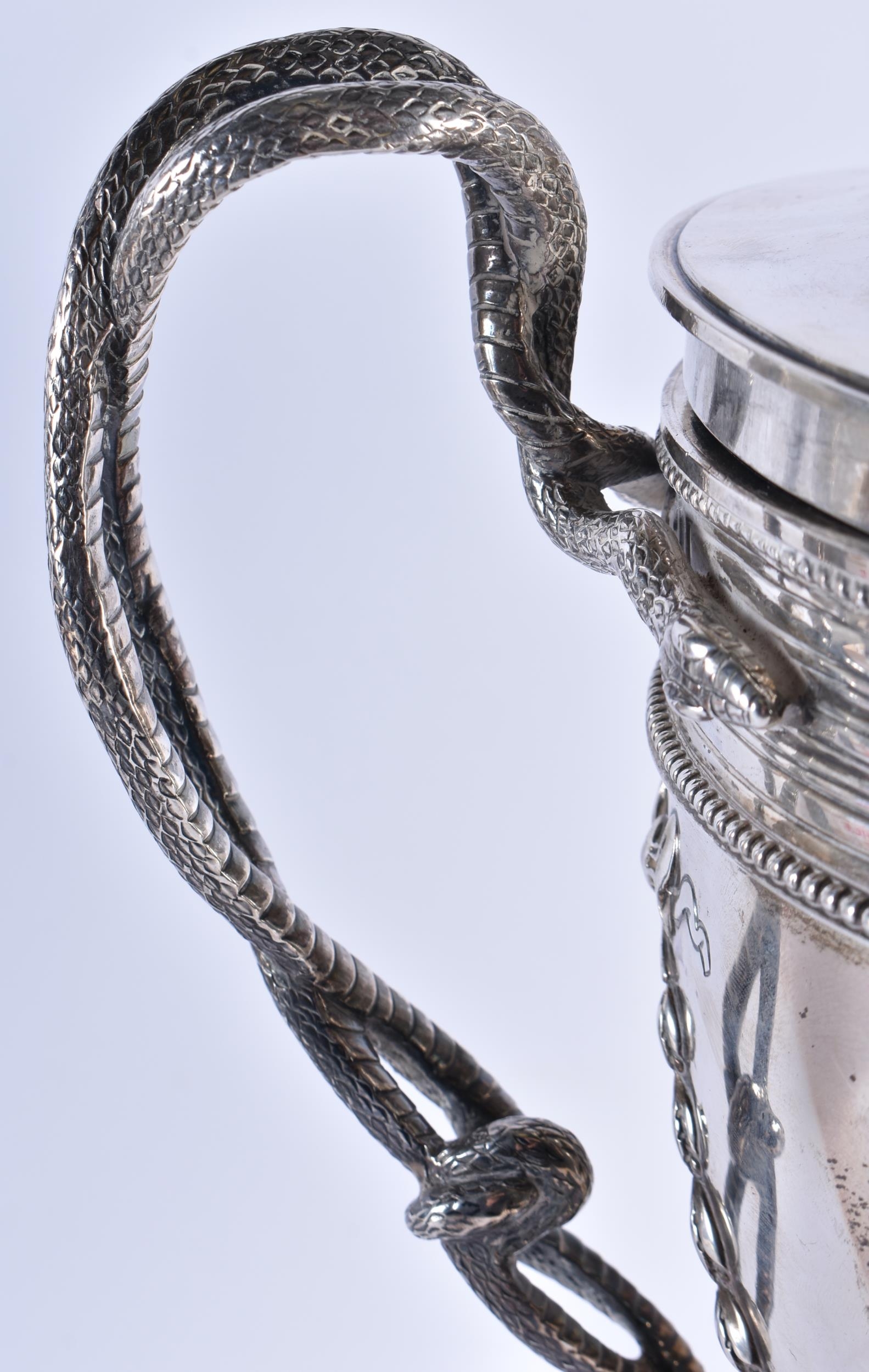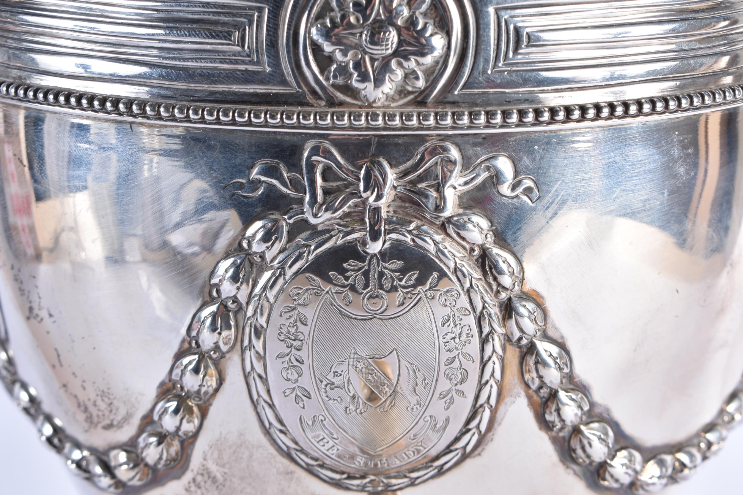 A GOOD GEORGE III SILVER ADAM-STYLE TEA URN with leaf cast finial and coat of arms to the lift of lid above a urn shaped body with swag work and serpent side handles, with twist handle; raised on a square plinth base - London 1774, 3372 grams. Reference: H4BDTHHY. 50 cm x 30 cm.