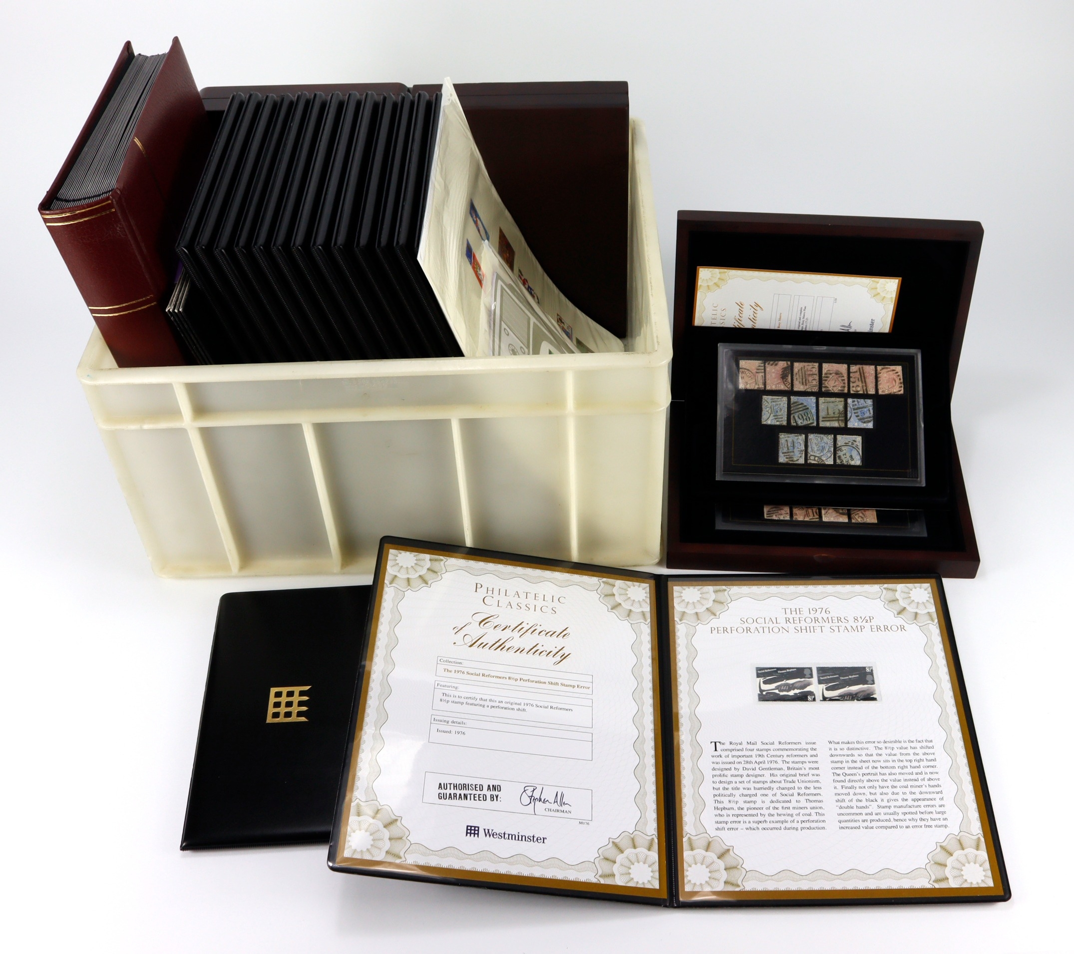 GB - large collection of material in luxury Westminster folders and 3x wooden cases, much QV Surface printed, plate No's, QE2 errors incl 1966 missing Blackbird legs, etc. 1955 Waterlow Castles set mint. QV Essays, QV Penny red Plates in stockbook. Worth viewing (Qty)