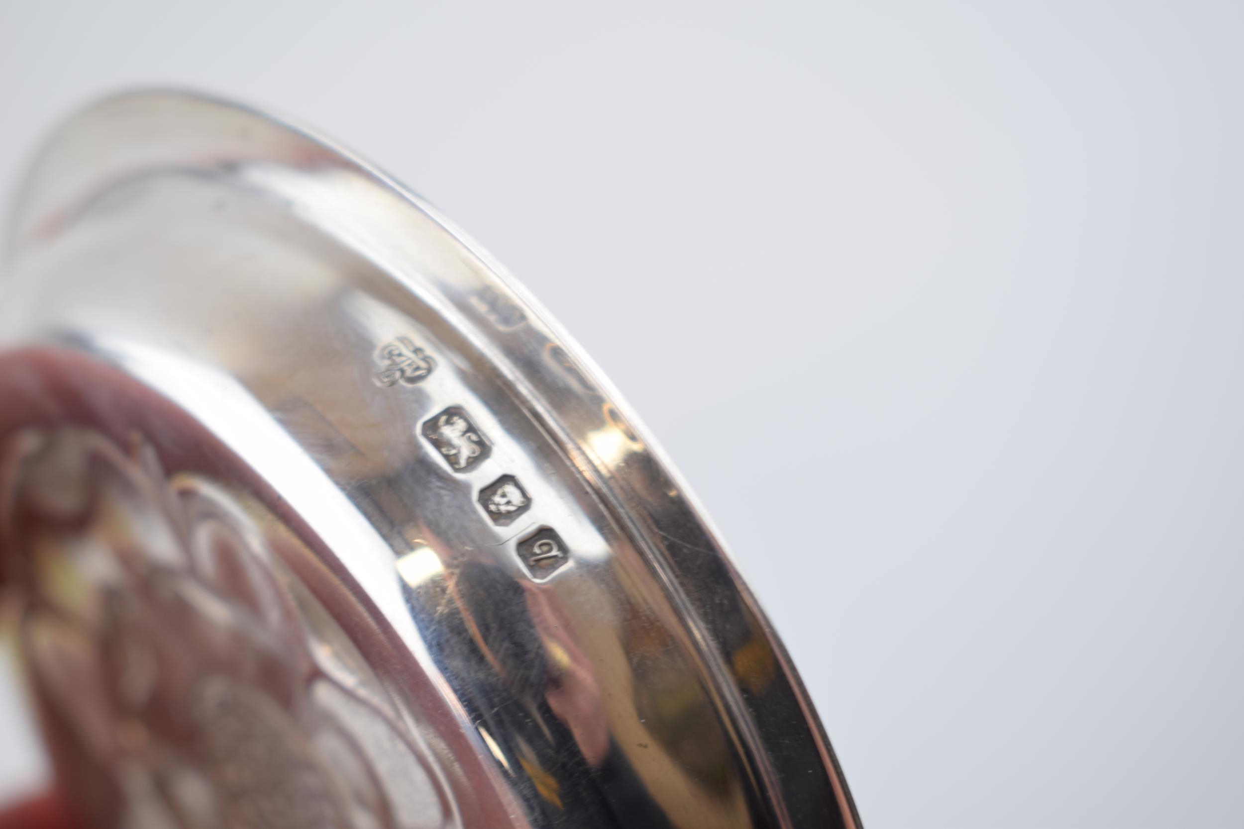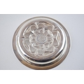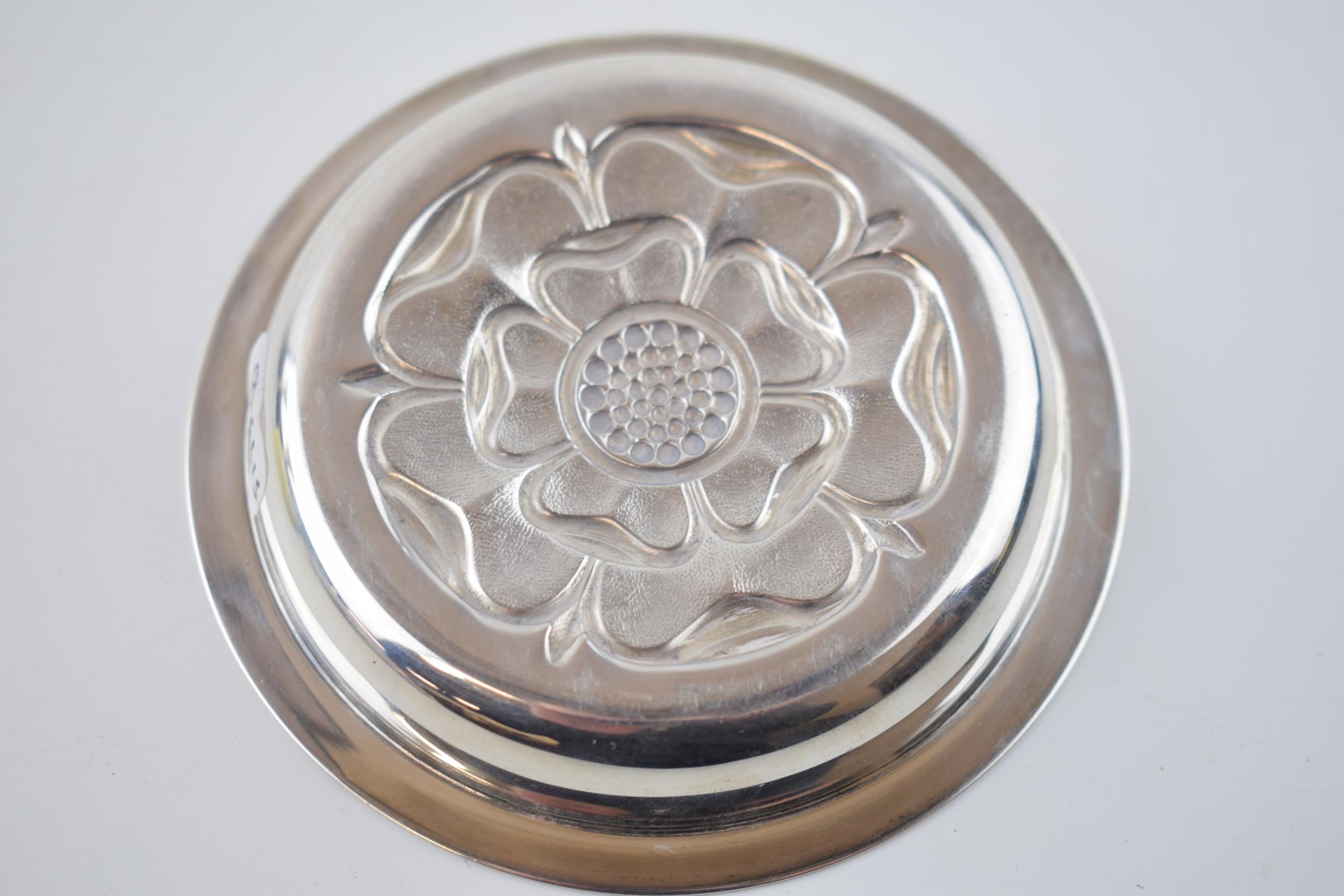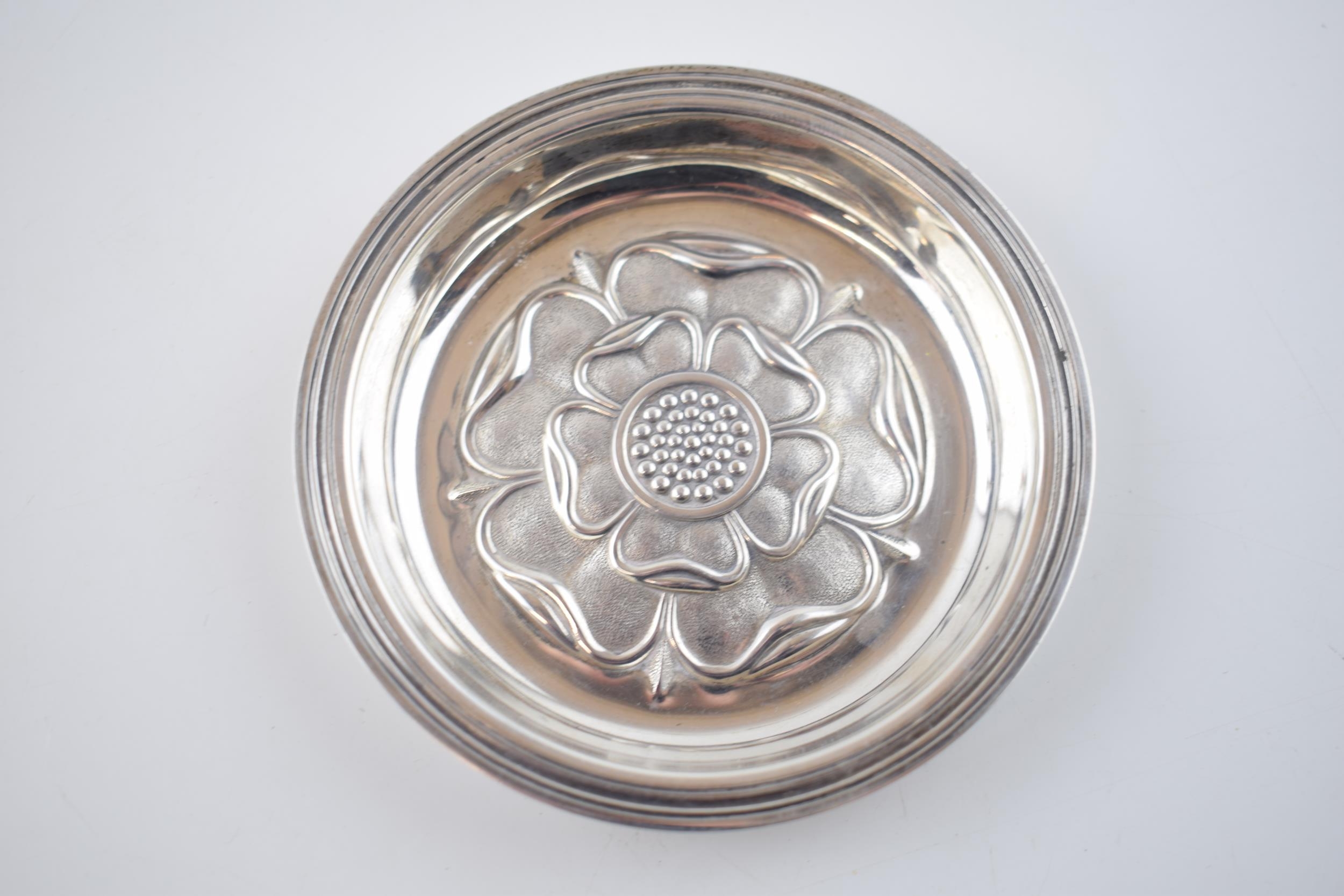 Silver pin tray with repousse Tudor rose design to centre. Hallmarked London 1971. Diameter 9.5cm. 59.2 grams.