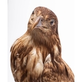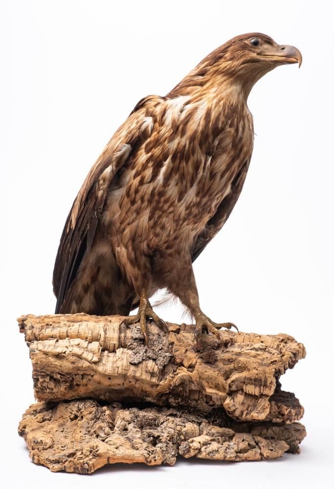 An early 20th century taxidermy Golden Eagle, (Aquila chrysaetos): full mount set on a cork base, 72cm high, together with a note of provenance. *Notes- This specimen was acquired off the Channel Island of Alderney in 1886 and was at one point in the possession of Colonel Lionel Langlois, Crown Agent for the Island of Alderney who had it on his office desk. During WWII just before German forces were about to take occupation Colonel Langlois evacuated the island taking the eagle with him. Billeted with the vendors parent in Woodbury, Devon, the eagle was gifted to the vendors family as a 'Thank you' when Colonel Langlois retuned to Alderney