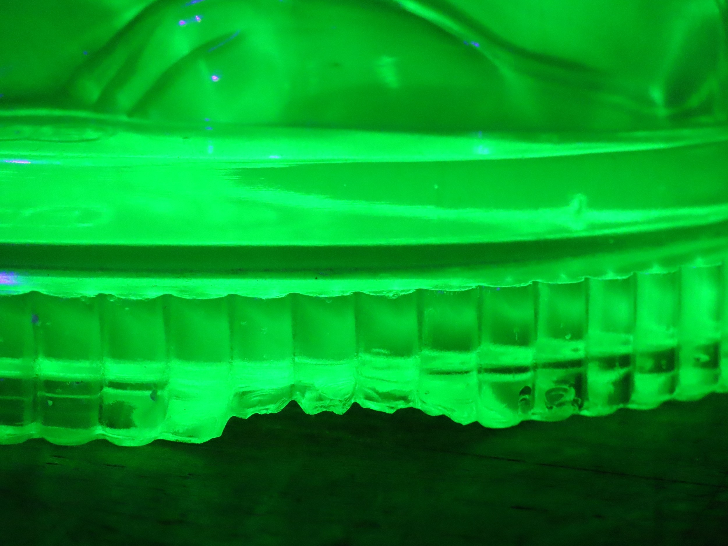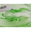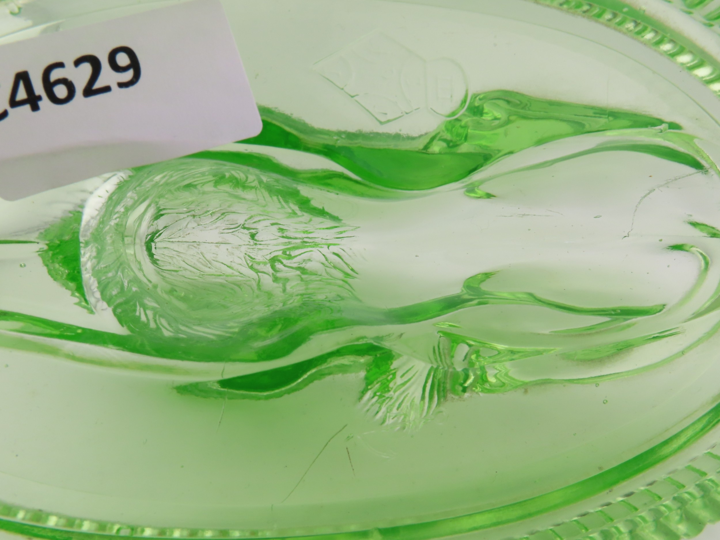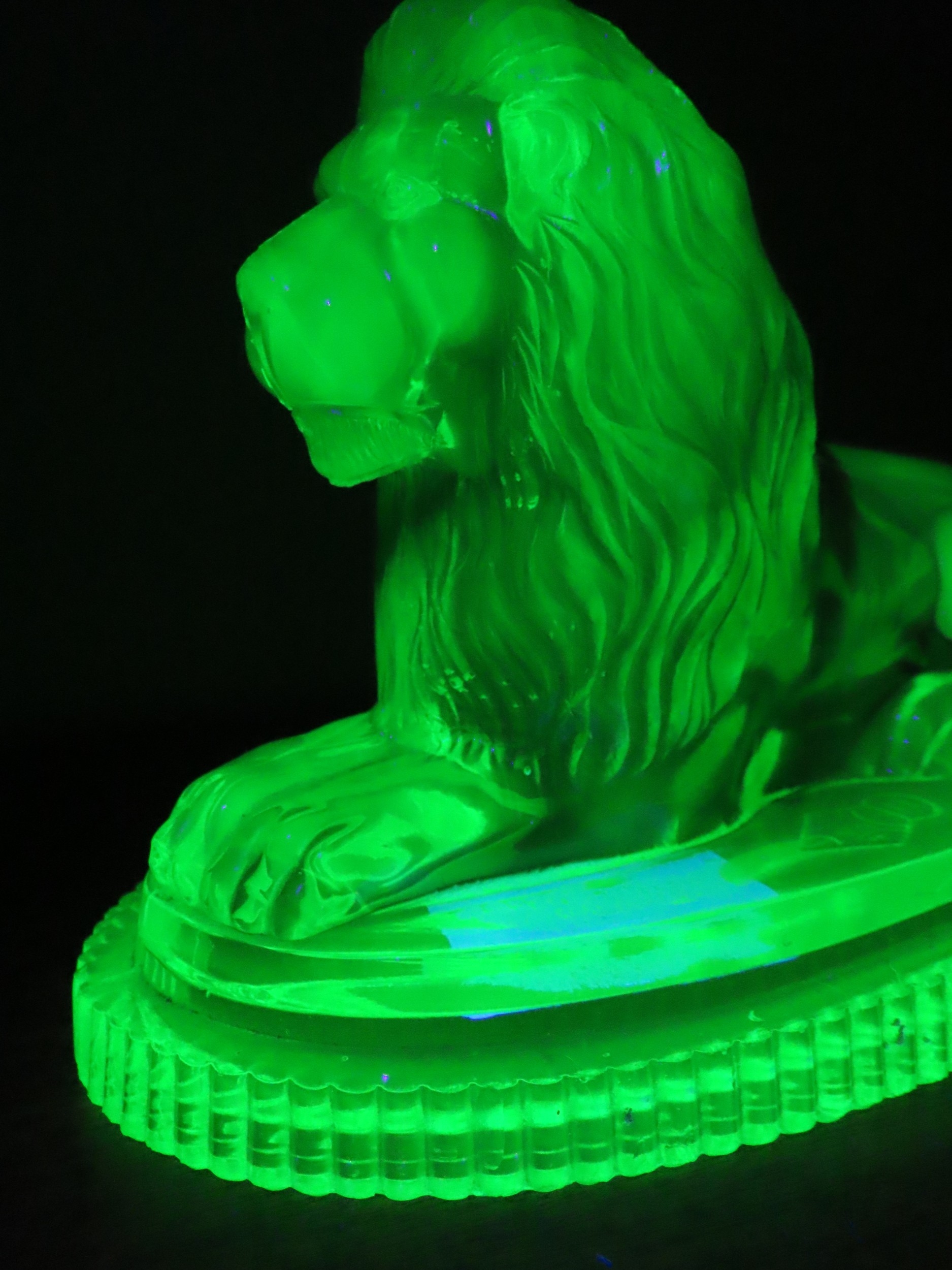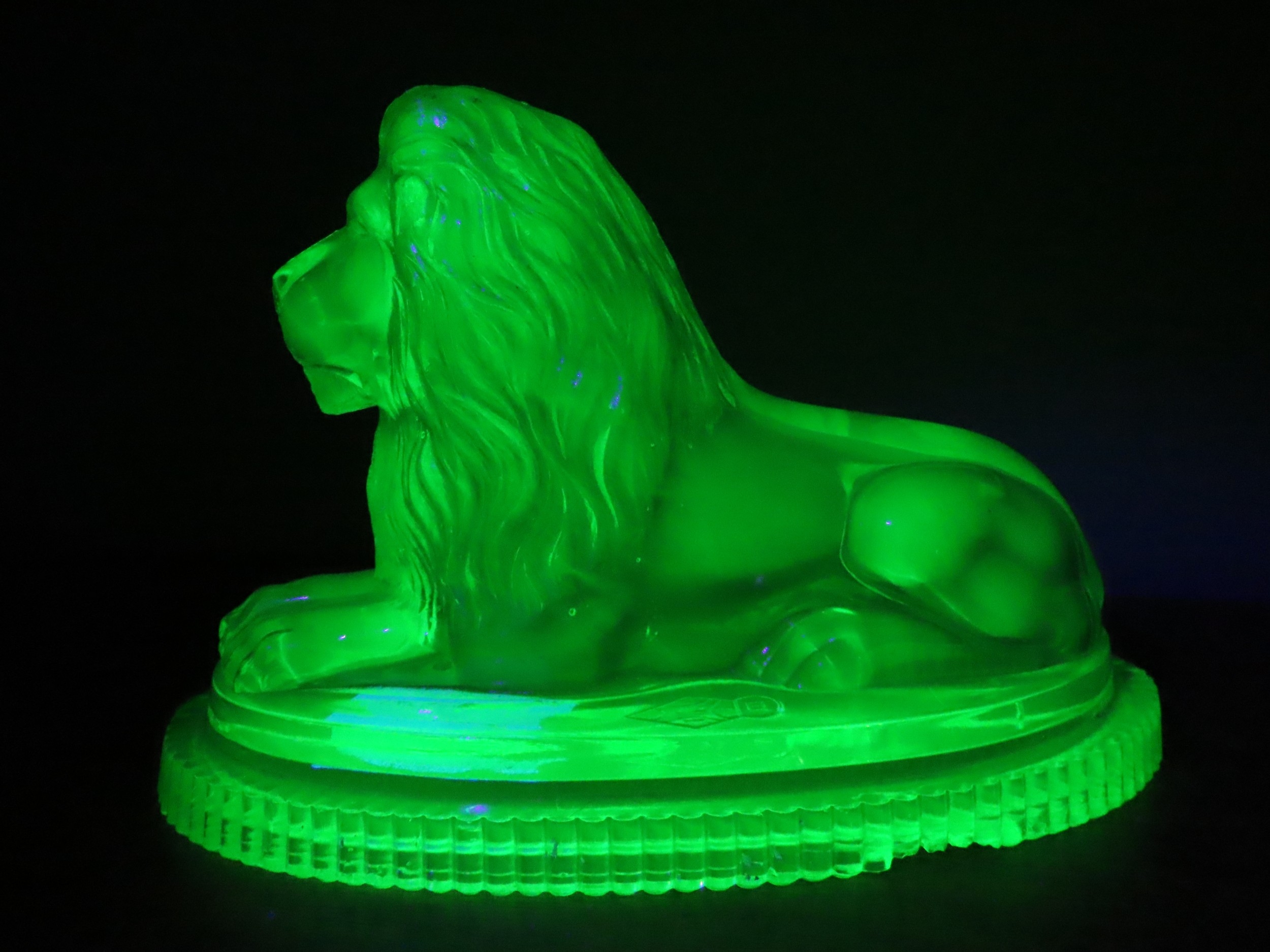 Victorian John Derbyshire moulded Uranium glass lion with registration lozenger to the base. (chip to the rim)