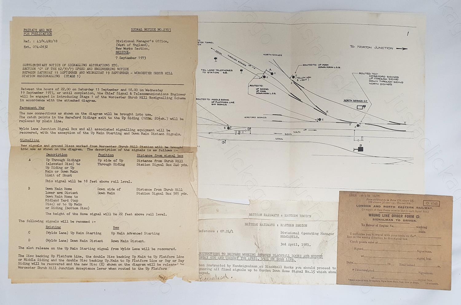 Railway. A B.R. signalling notice. No 2703, signalling alterations around Worcester Shrub Hill and Station resignalling. 1973. With 2 associated signalling diagrams.