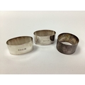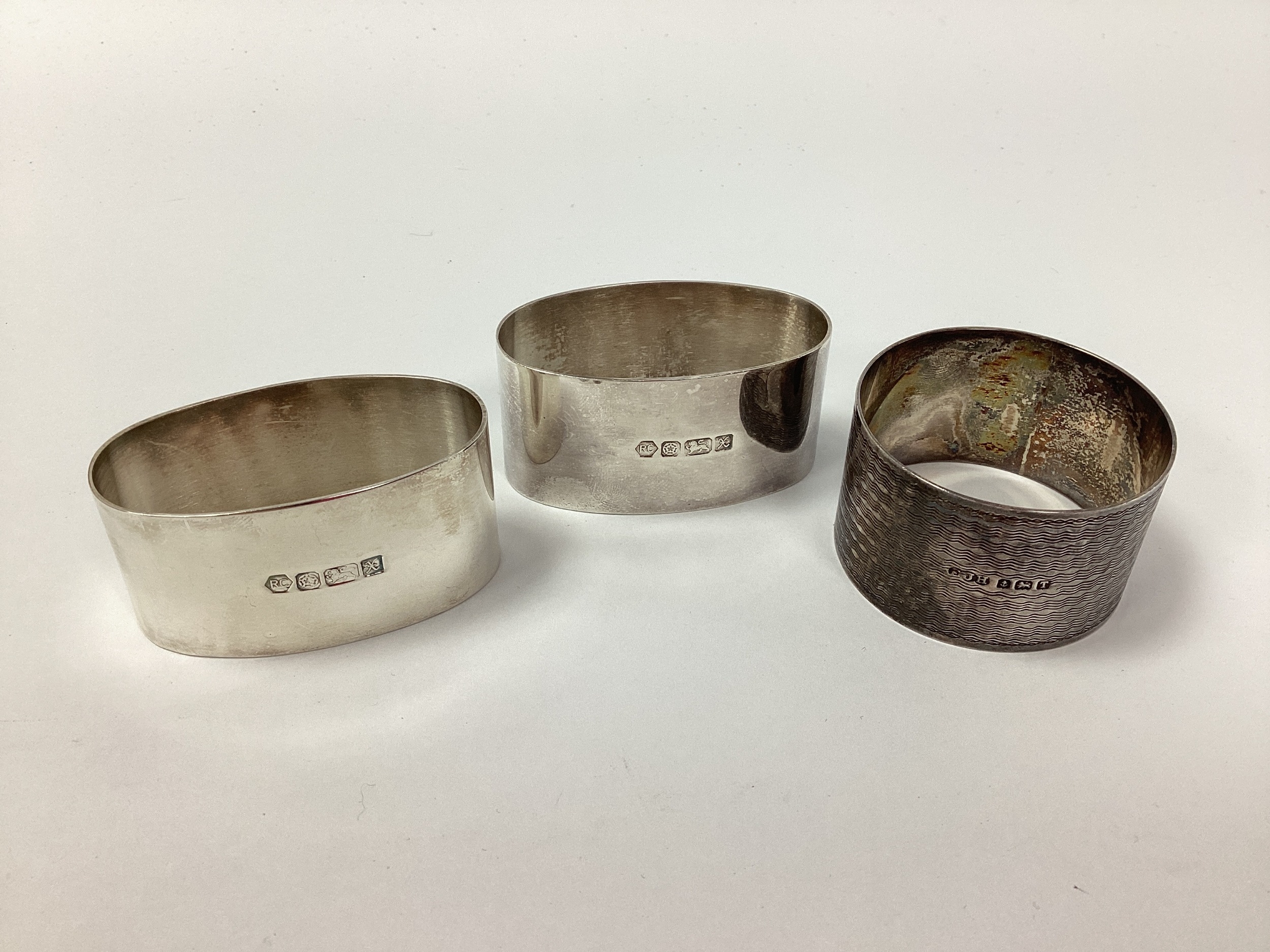Carr's of Sheffield Ltd; A Matching Pair of Hallmarked Silver Oval Napkin Rings, of plain design, Sheffield 1997; Together with Another Hallmarked Silver Napkin Ring, of engine turned finish, with vacant cartouche, E J Houlston Ltd, Birmingham 1943. (3)