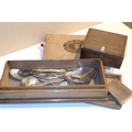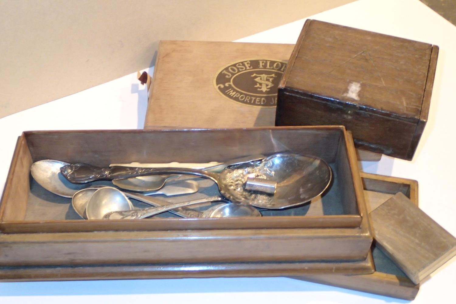 Four antique wooden boxes and a small quantity of silver plated flatware. Not available for in-house P&P, contact Paul O'Hea at Mailboxes on 01925 659133