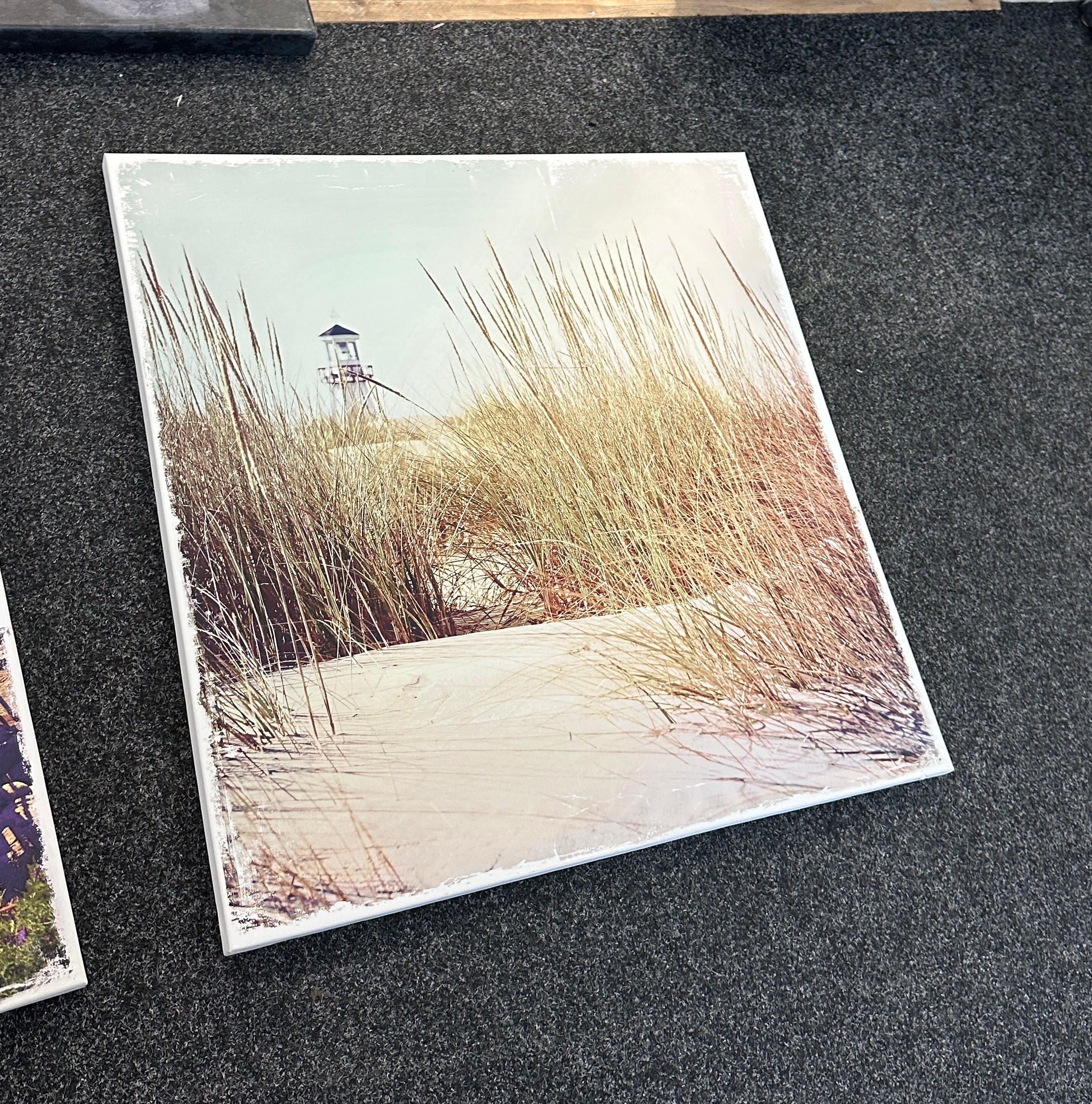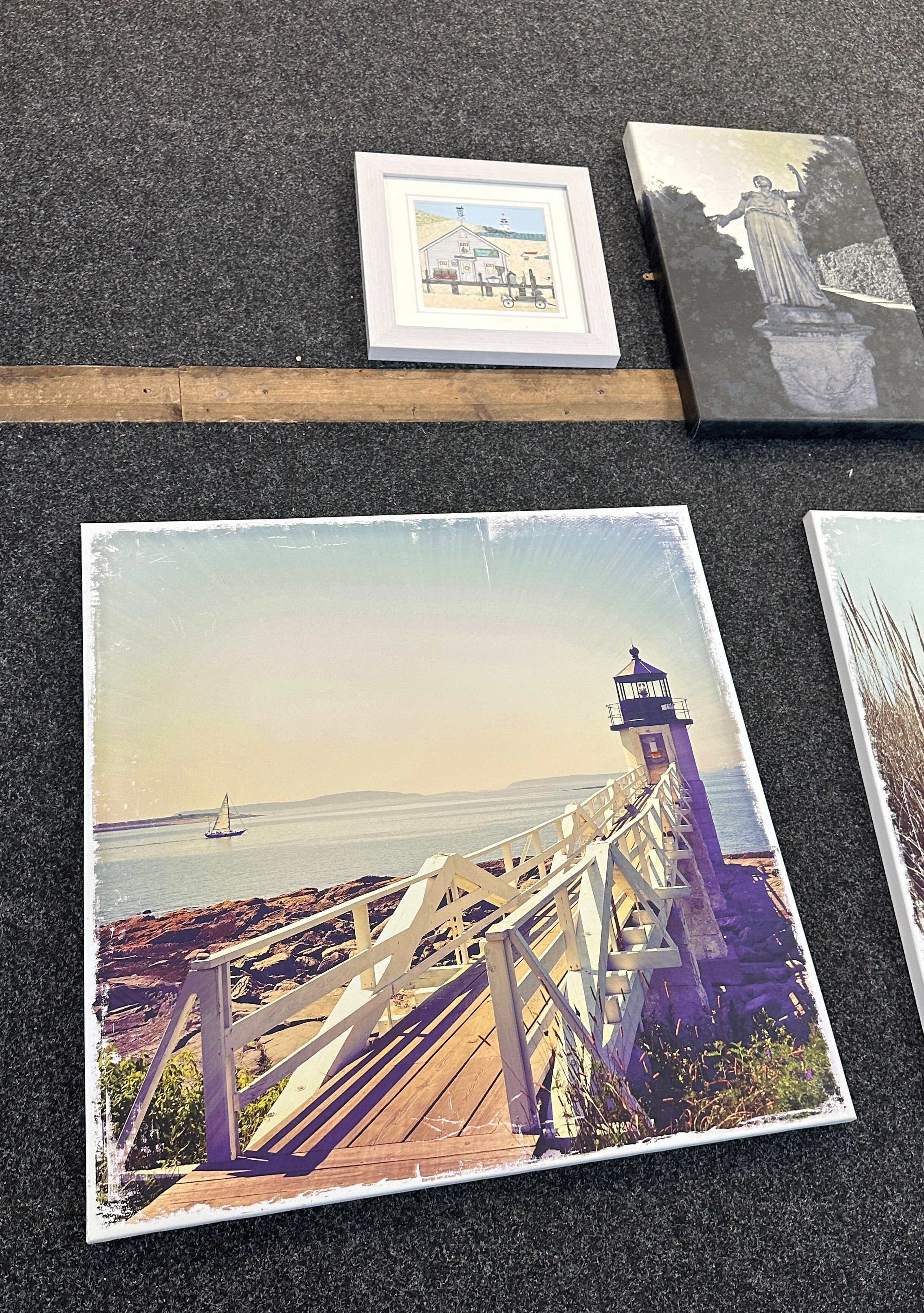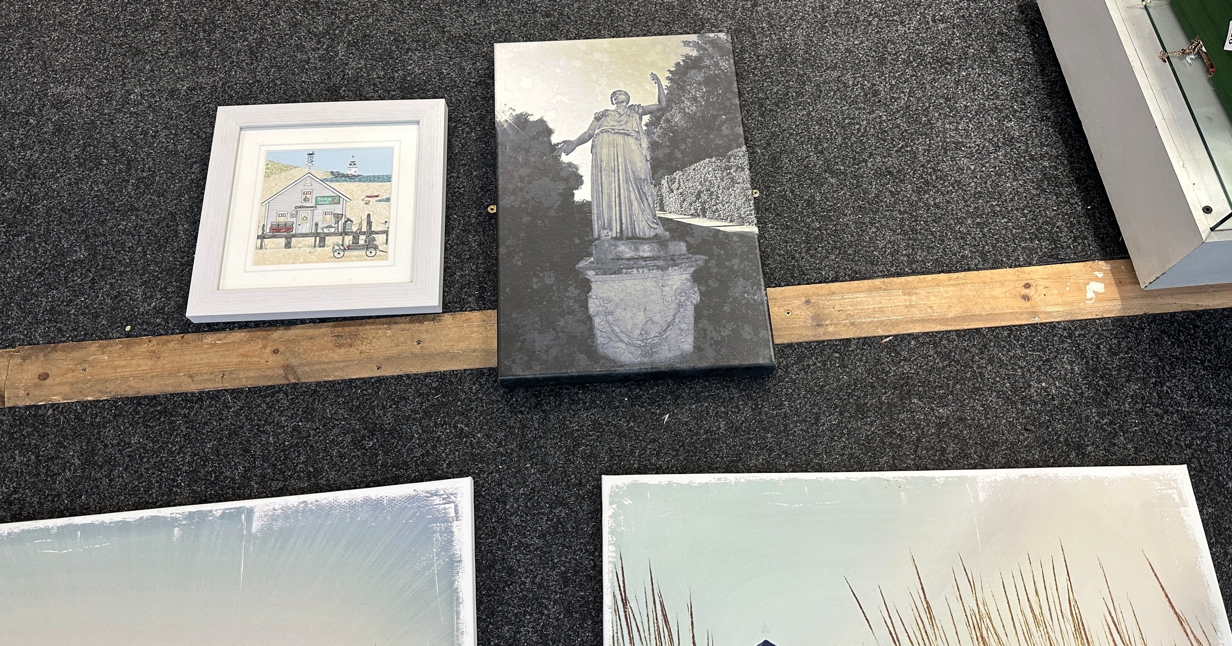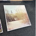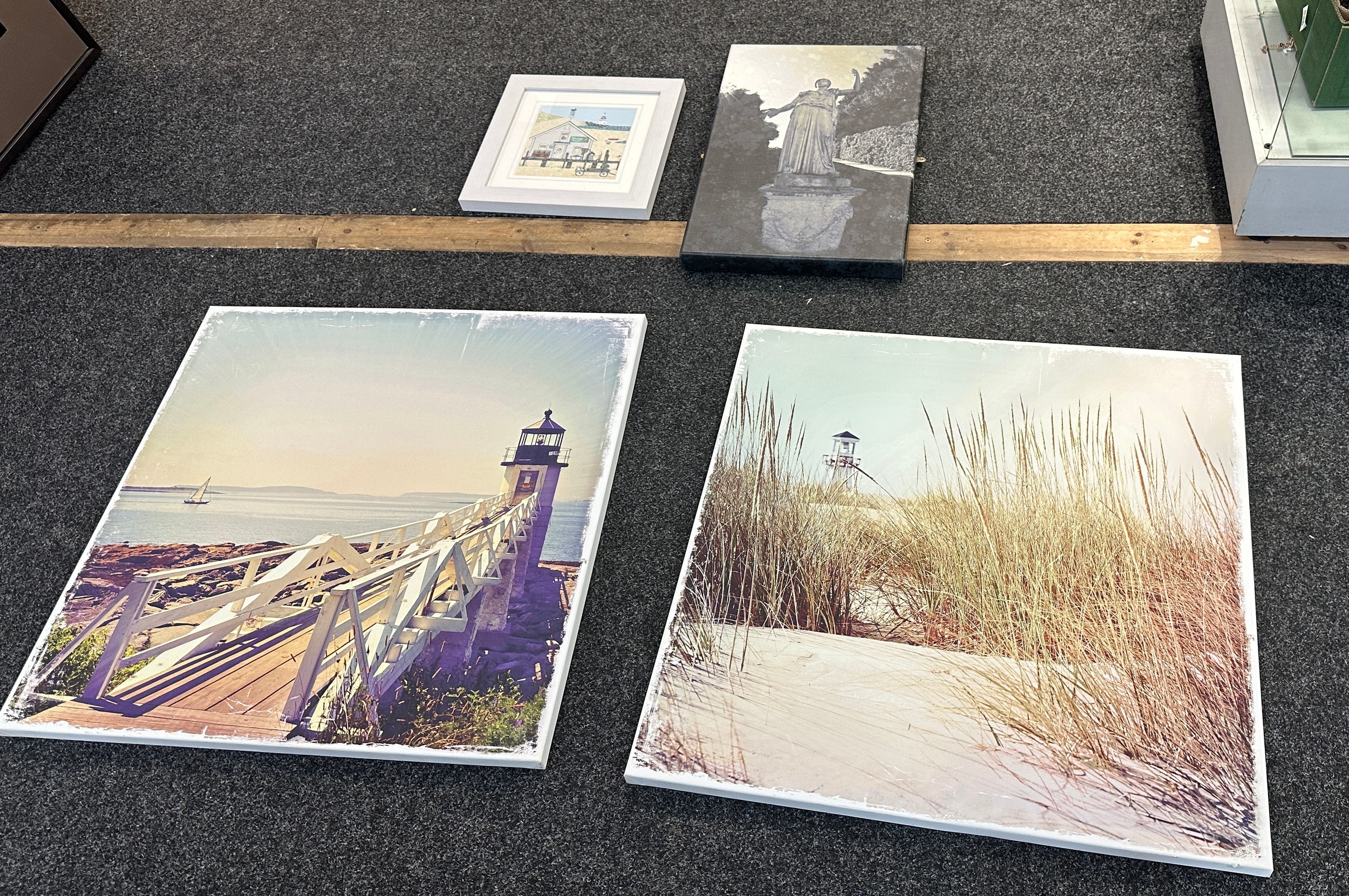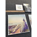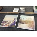 Selection of three canvas art work depicting sandy beach scenes etc and one picture largest measures approximately 31 inches tall x 31 wide