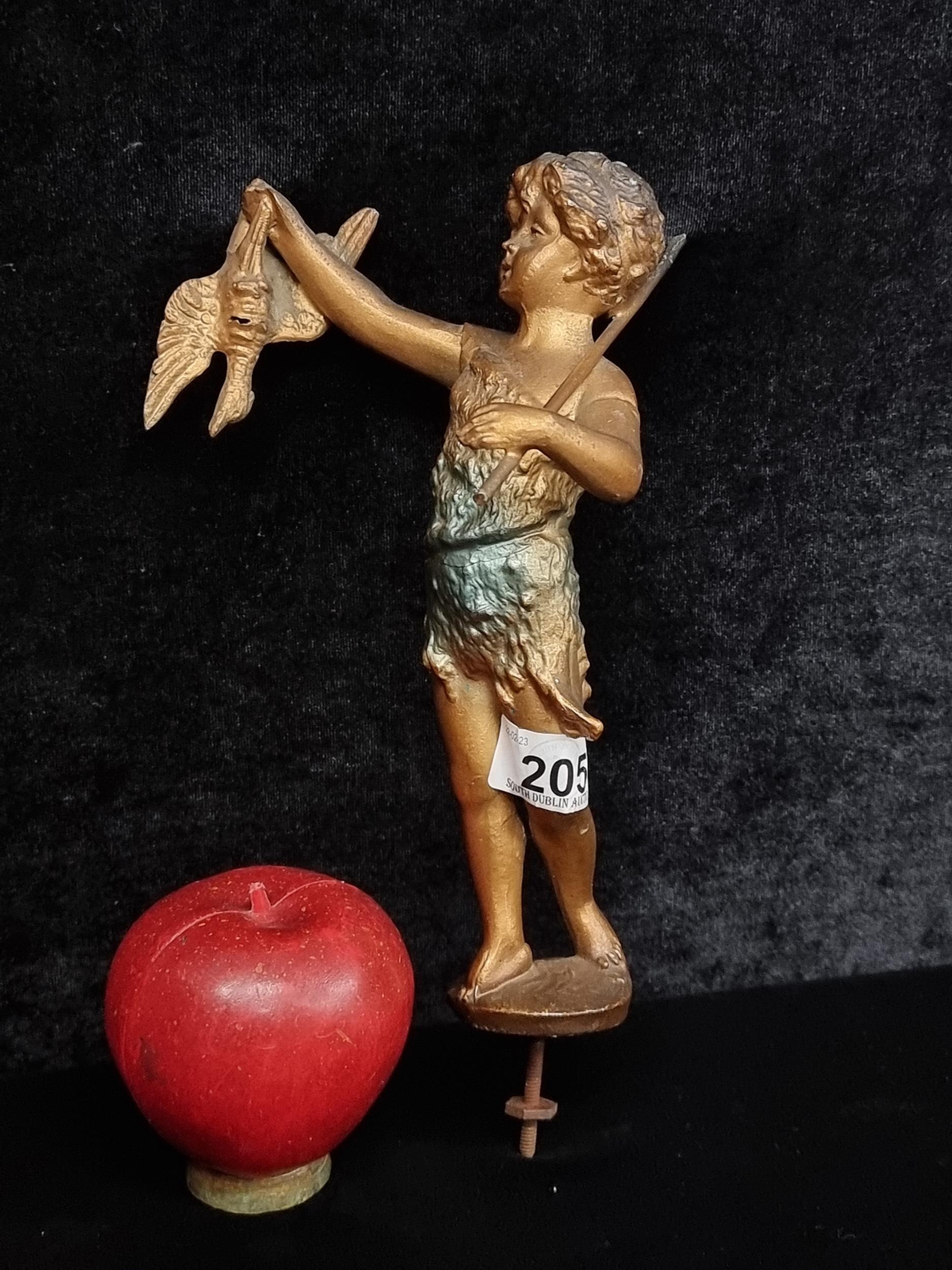 A fabulous a antique cold painted spelter figure of a young boy holding his prey aloft. With screw to base, allowing it to function as a finial. H: 25cm