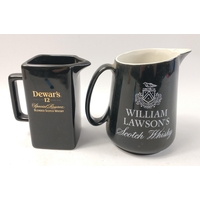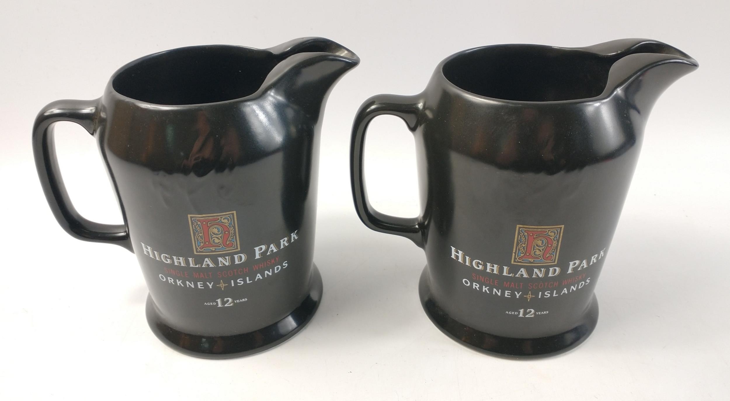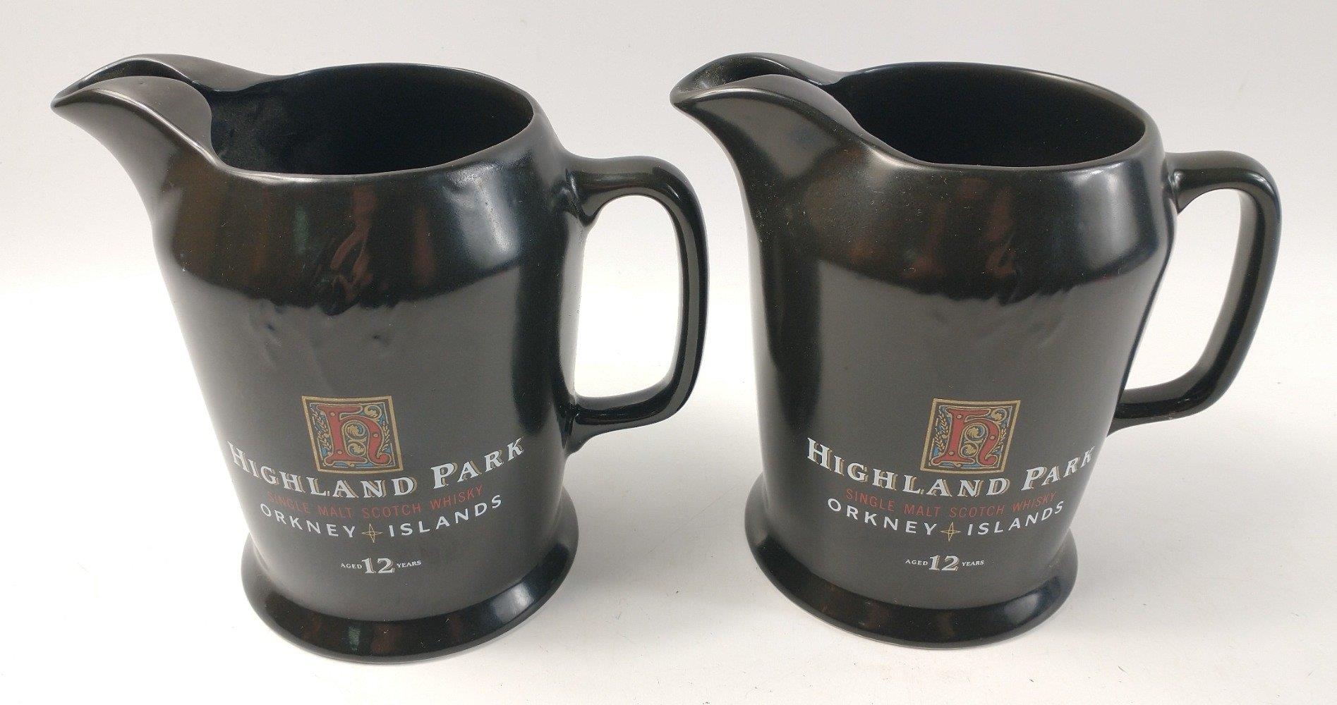 HIGHLAND PARK Orkney Islands 12 year old large whisky water jugs x2qty in black stamped WADE PDM - both in good condition with no cracks chips or signs of damage repair