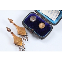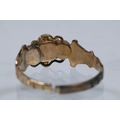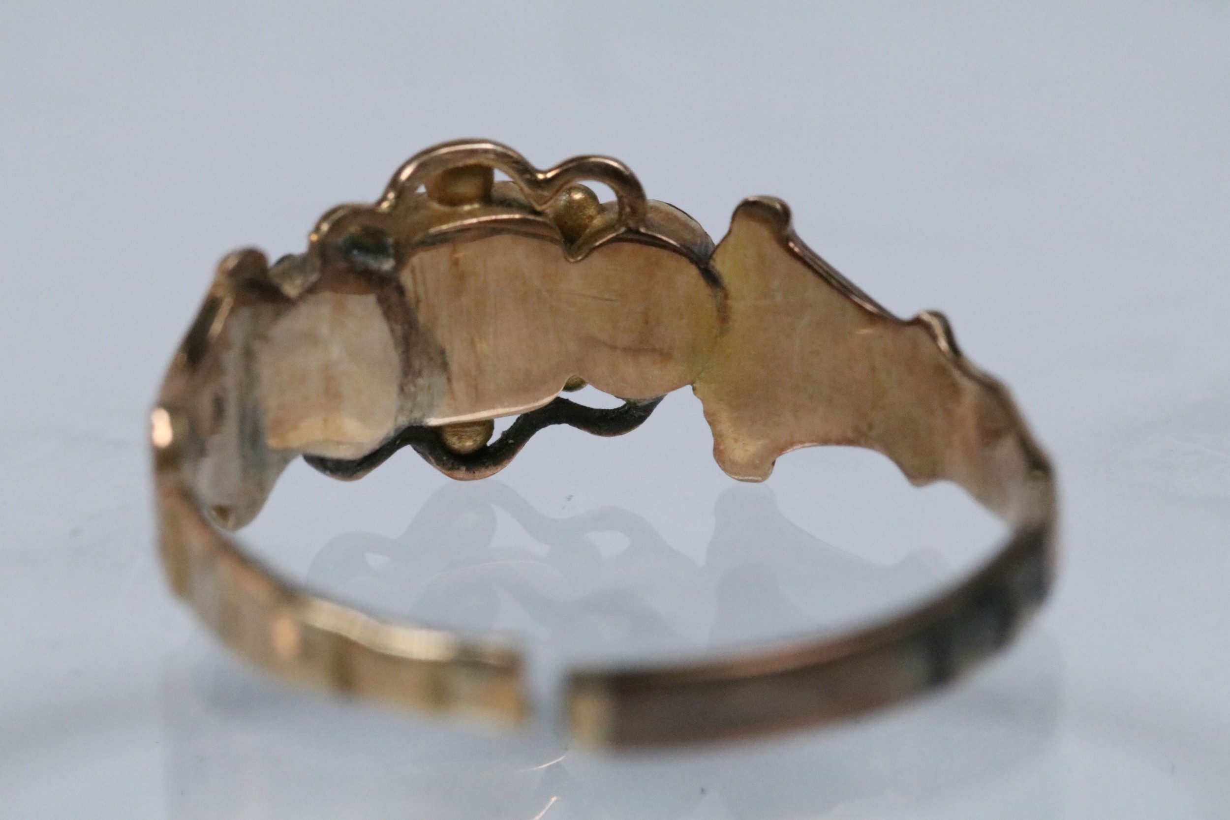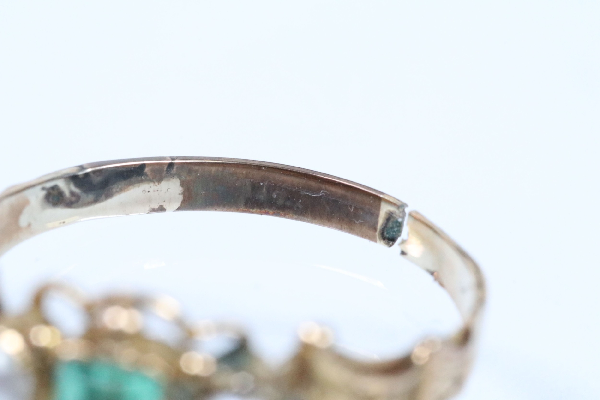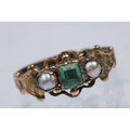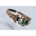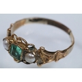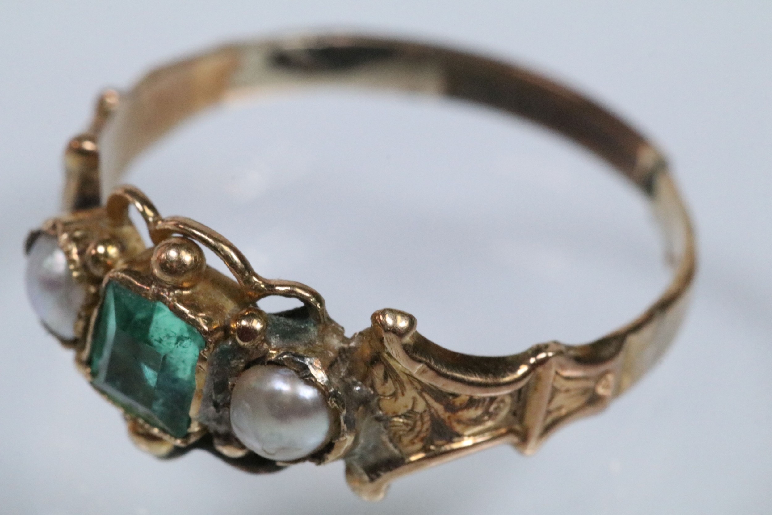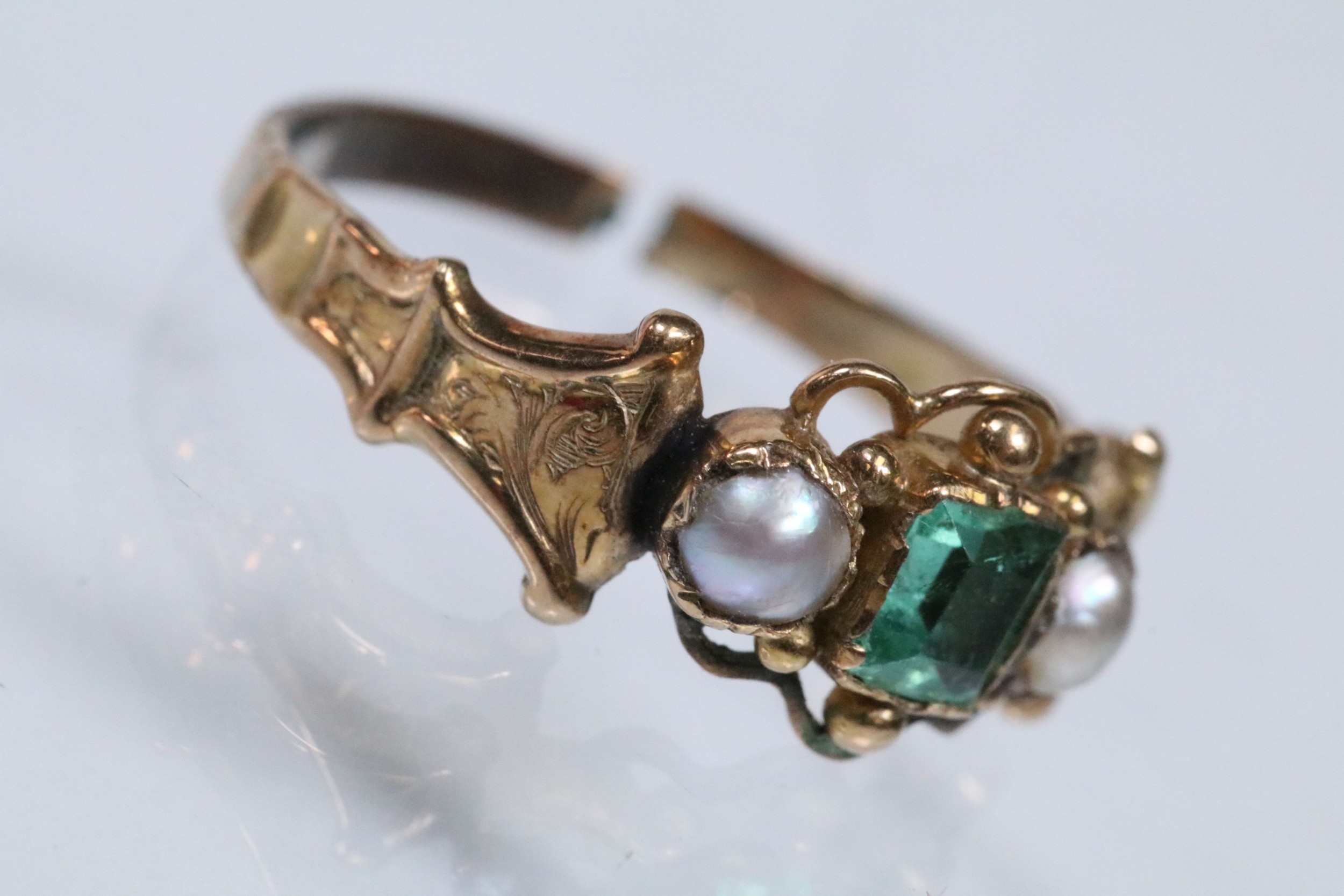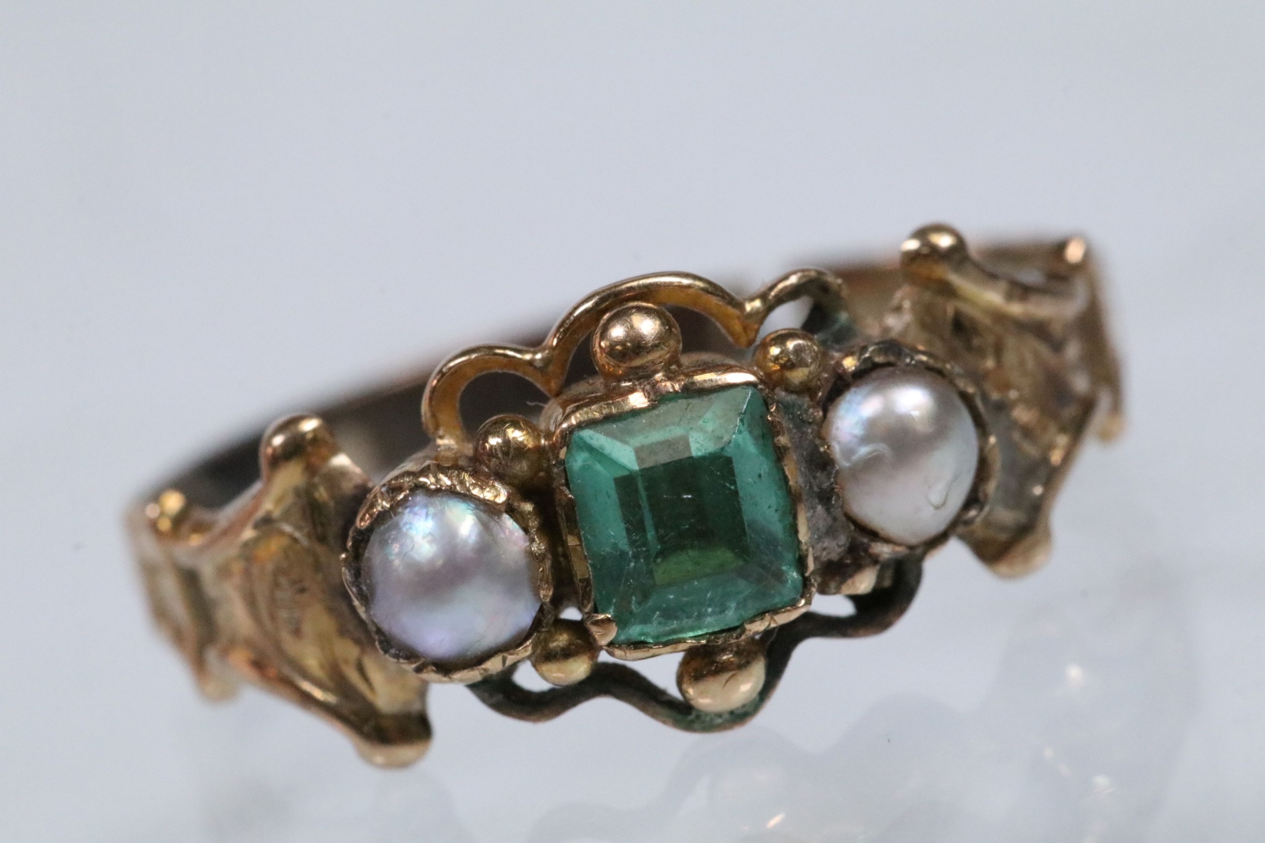 19th Century green paste and pearl ring. The ring being set with a step cut green stone flanked by two half pearls. Stones set into yellow metal, unmarked, tests indicate gold. Break to shank. Approximate size P.5.
