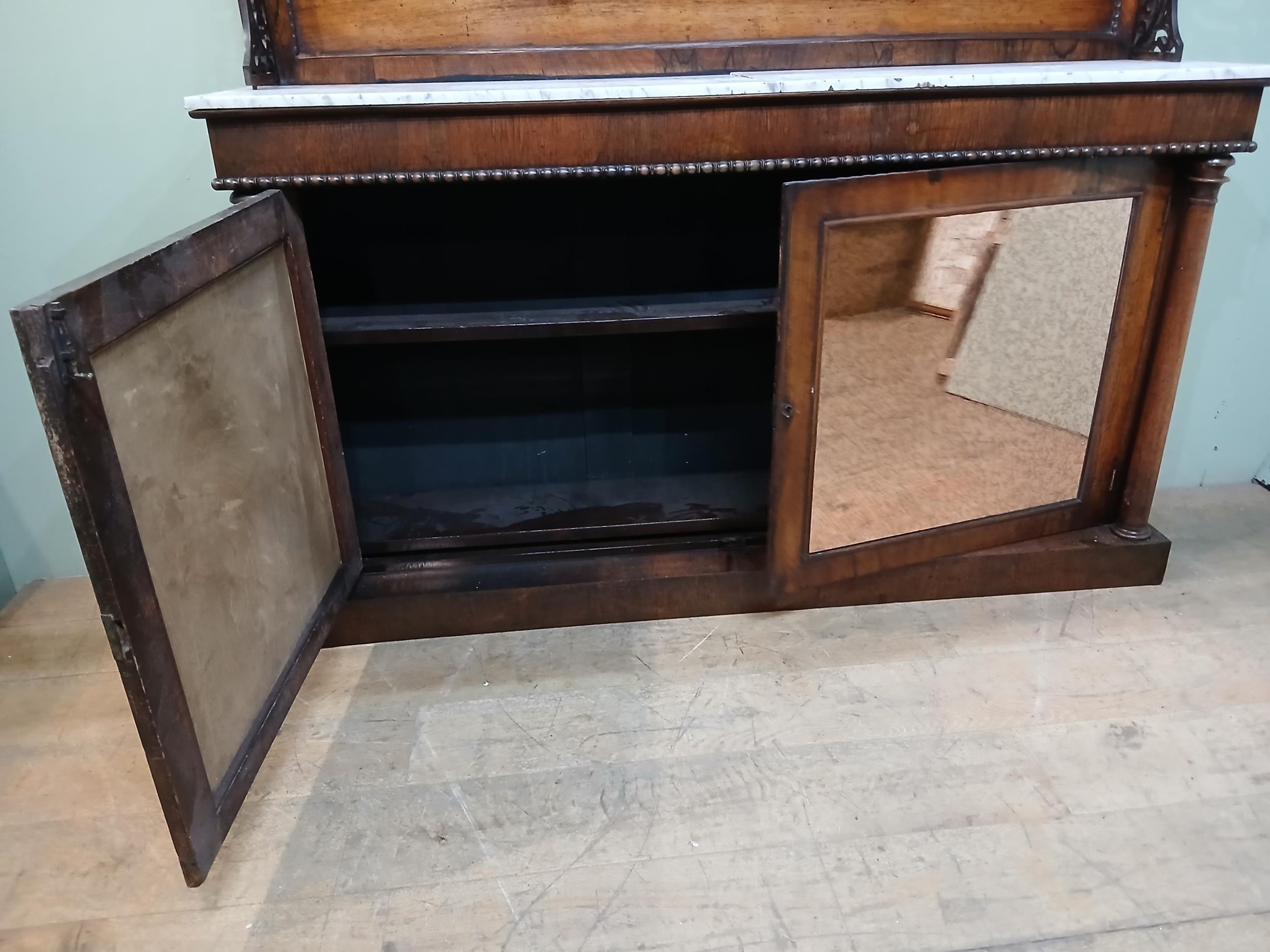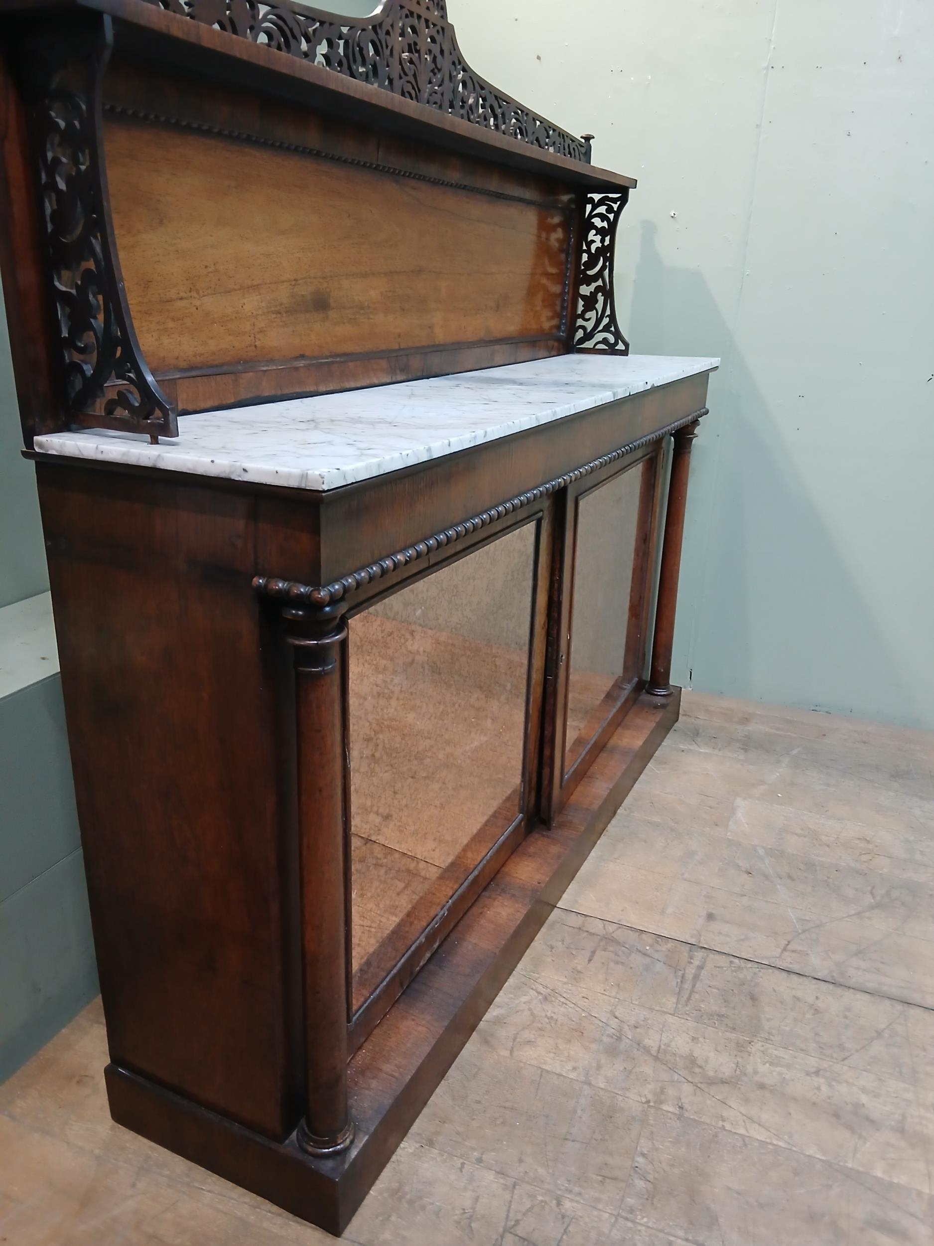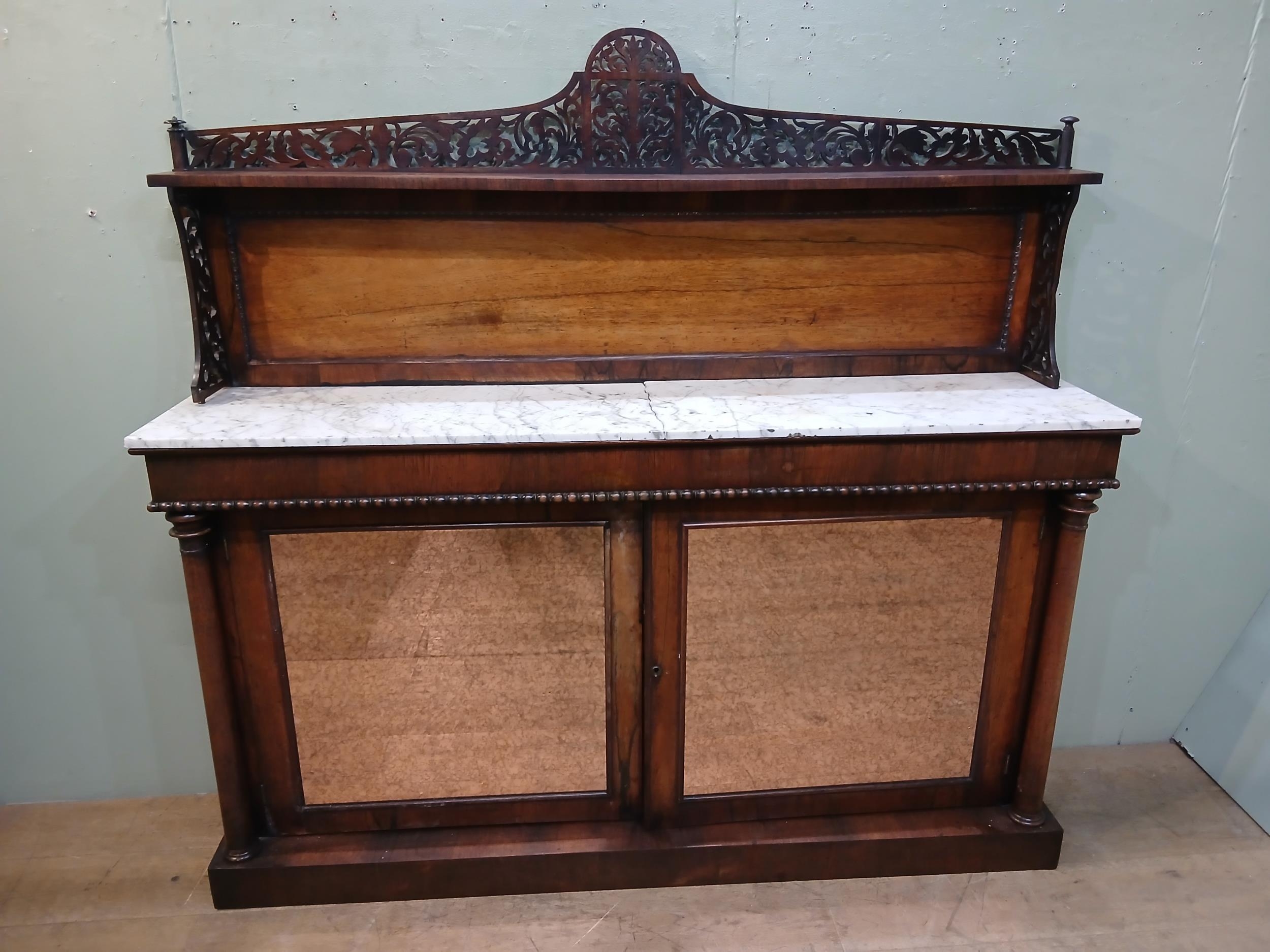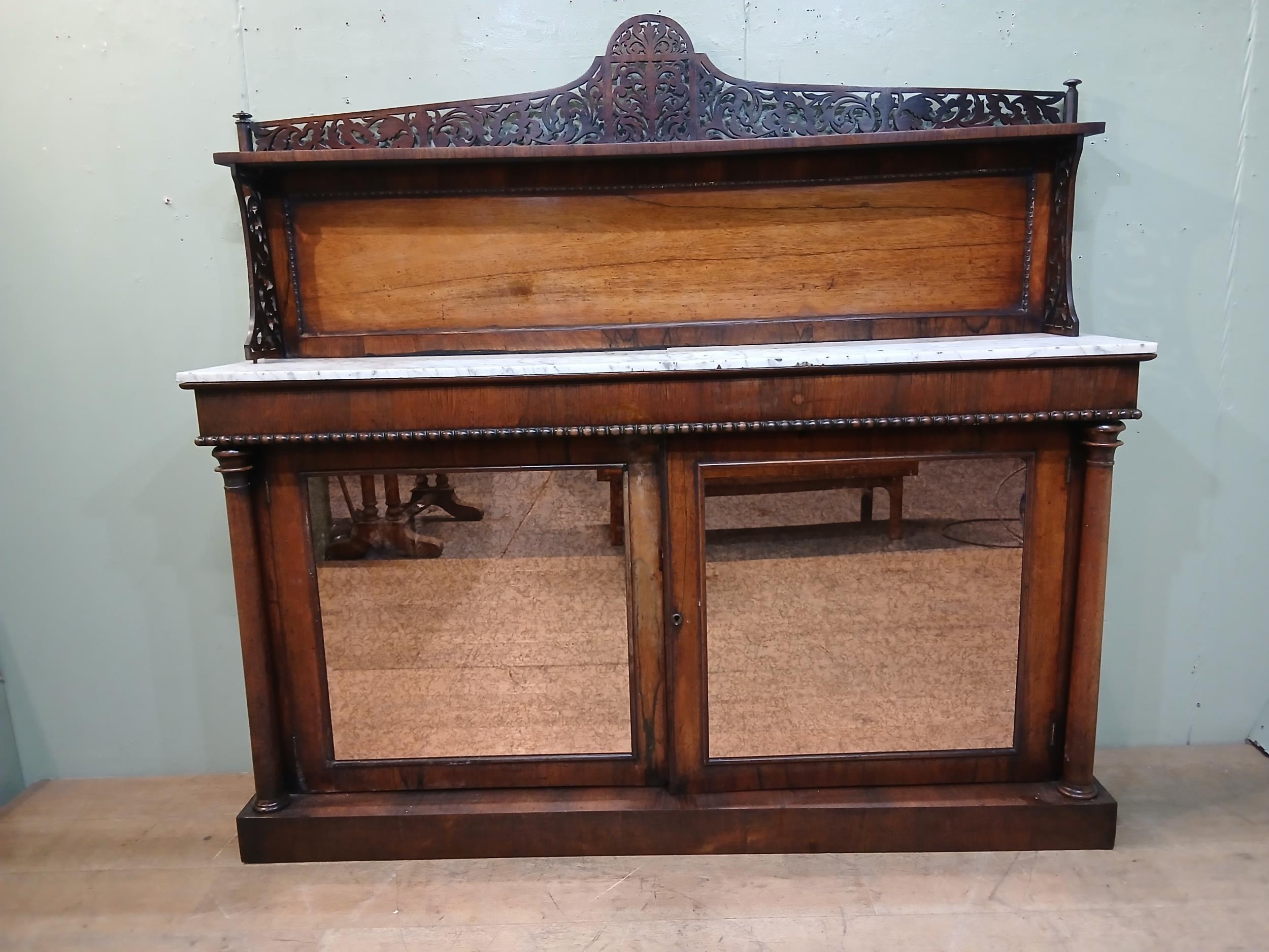 Rosewood chiffonier sideboard featuring a marble top and antique mirrored doors. {H 160cm x W 168cm x D 39cm }. NOT AVAILABLE TO VIEW IN PERSON.