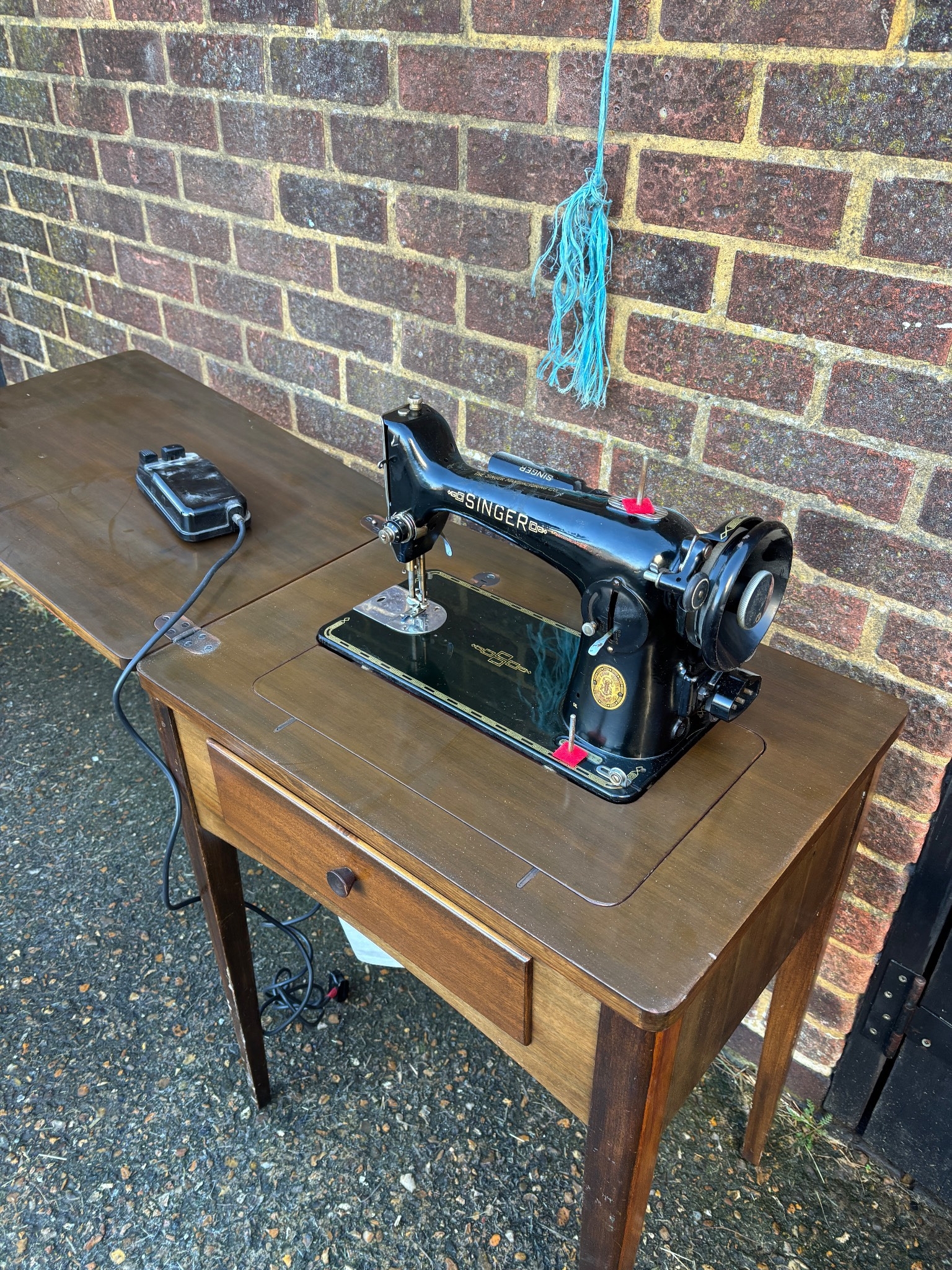 Singer sewing machine in a wooden table with a pedal, plug-i...