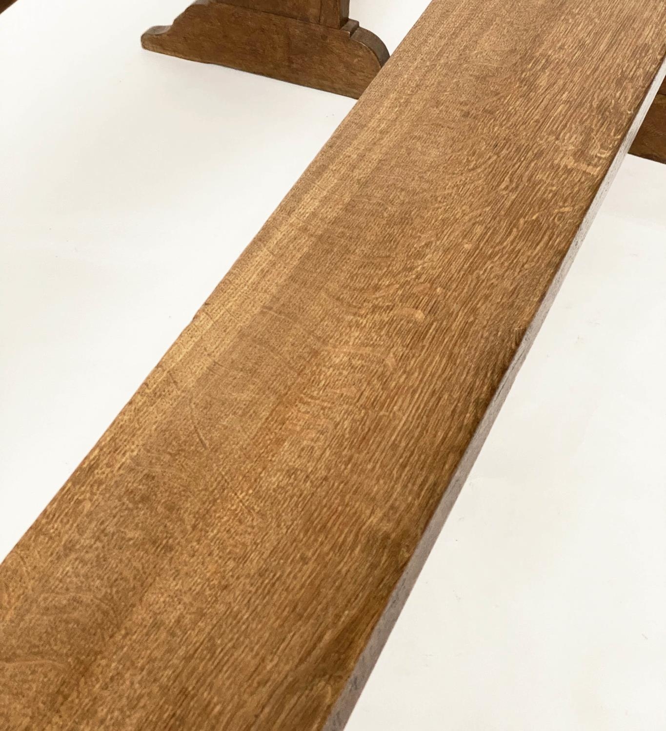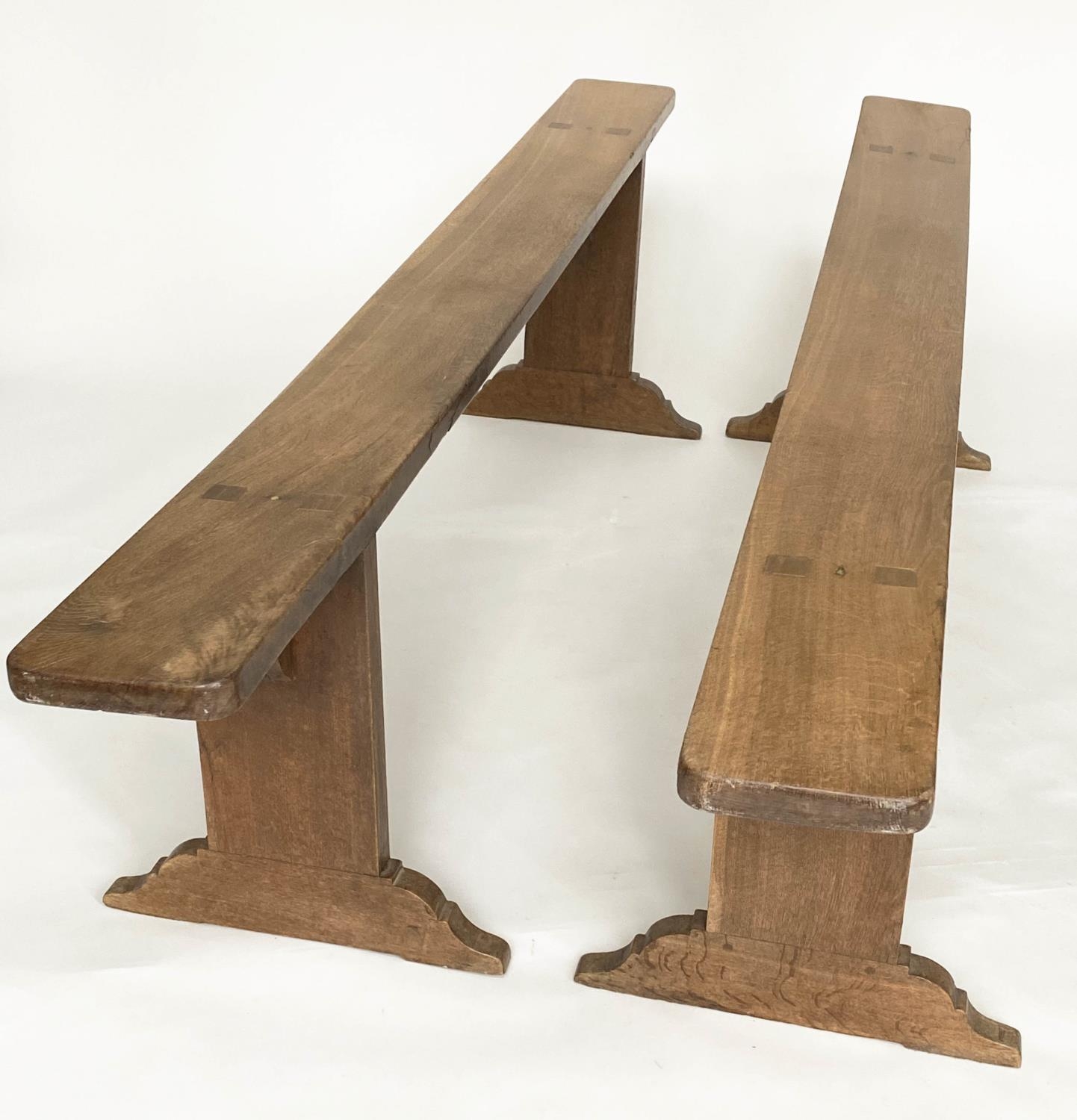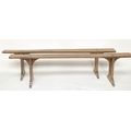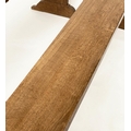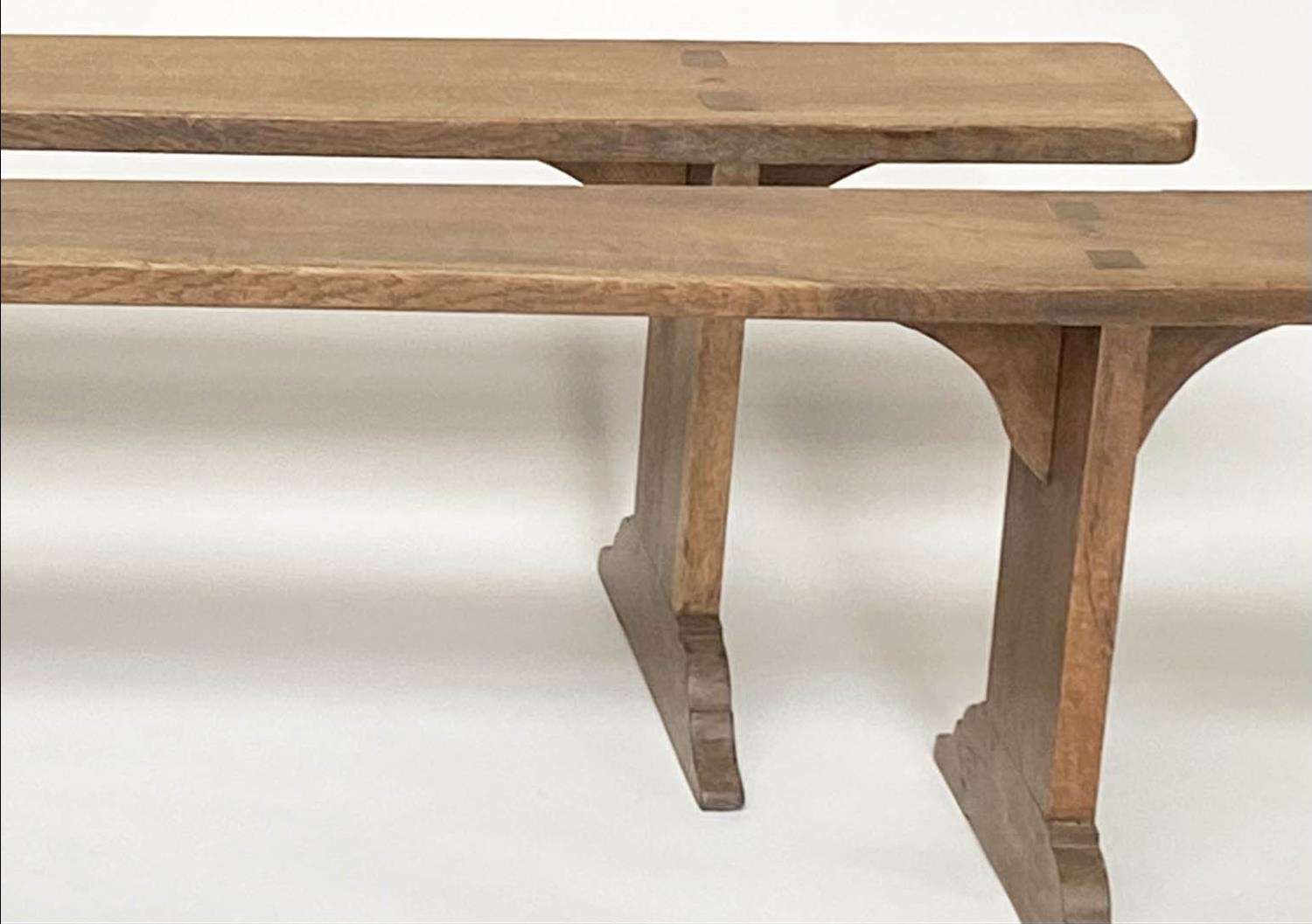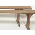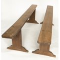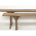 BENCHES, a pair, 19th century English oak rectangular with trestle supports, 194cm W x 46cm H x 40cm D. (2)