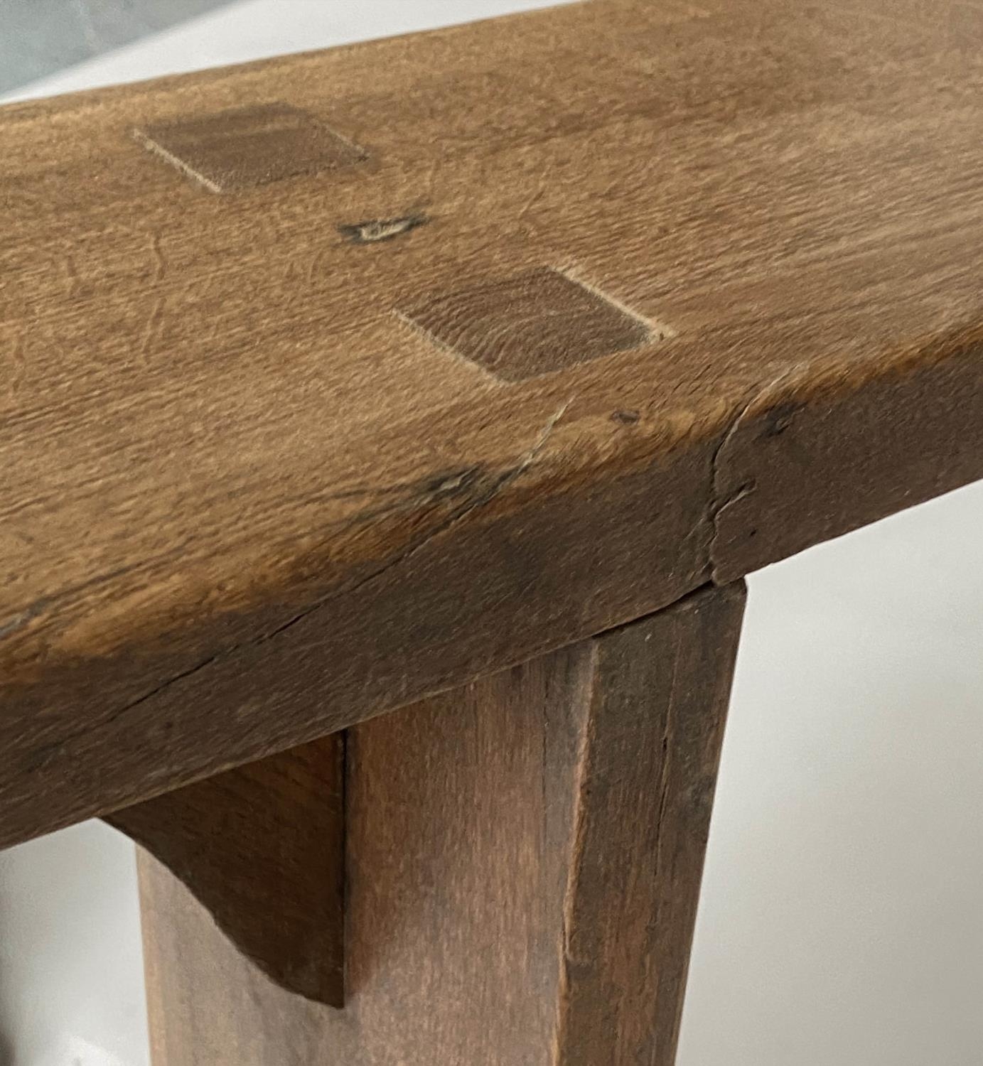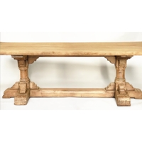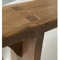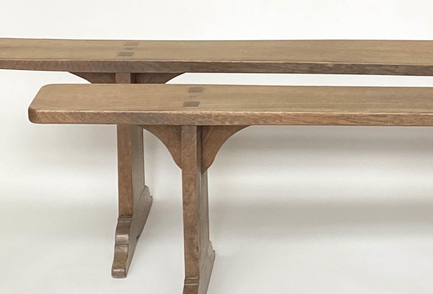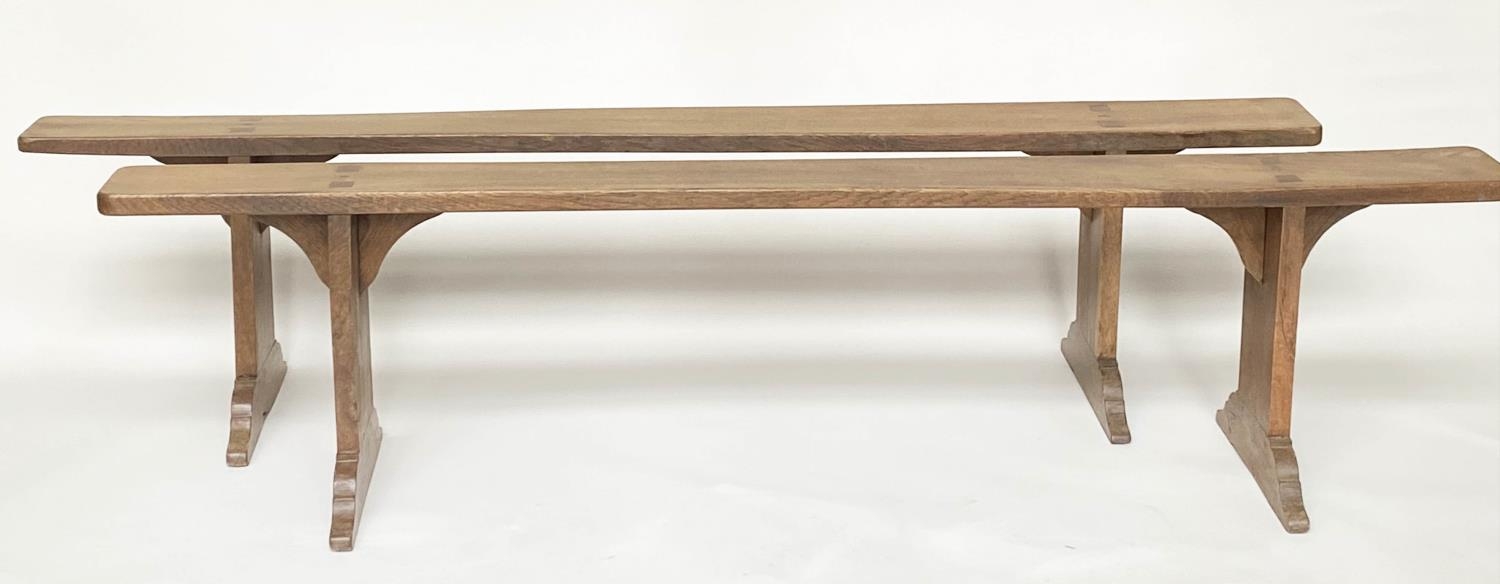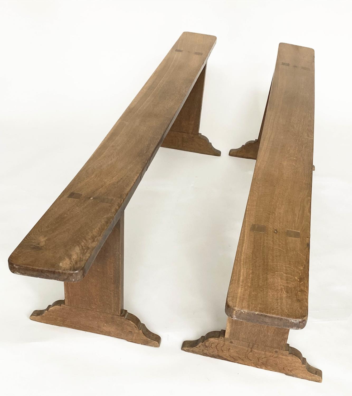 BENCHES, a pair, 19th century English oak rectangular with trestle supports, 194cm W x 46cm H x 40cm D. (2)