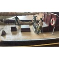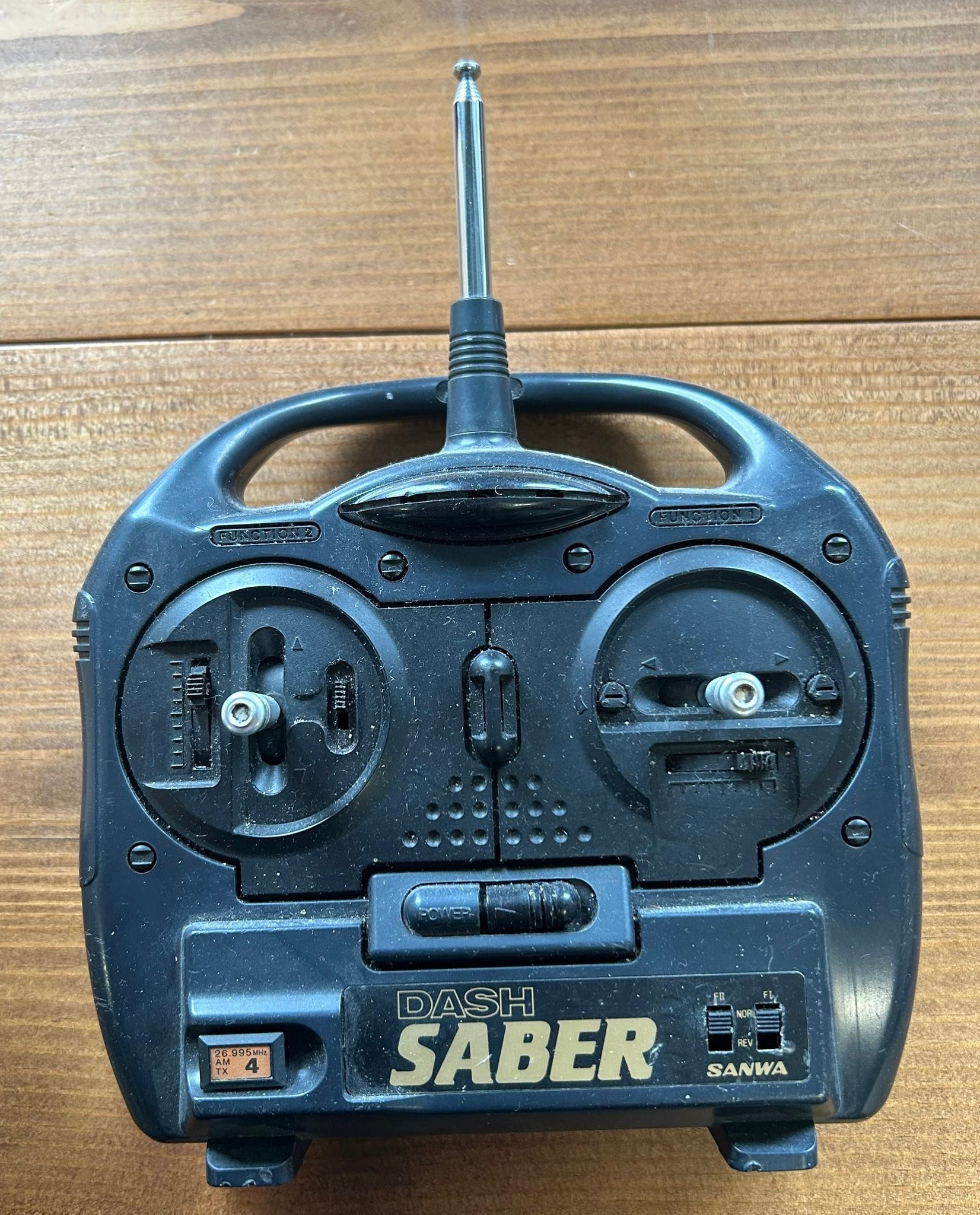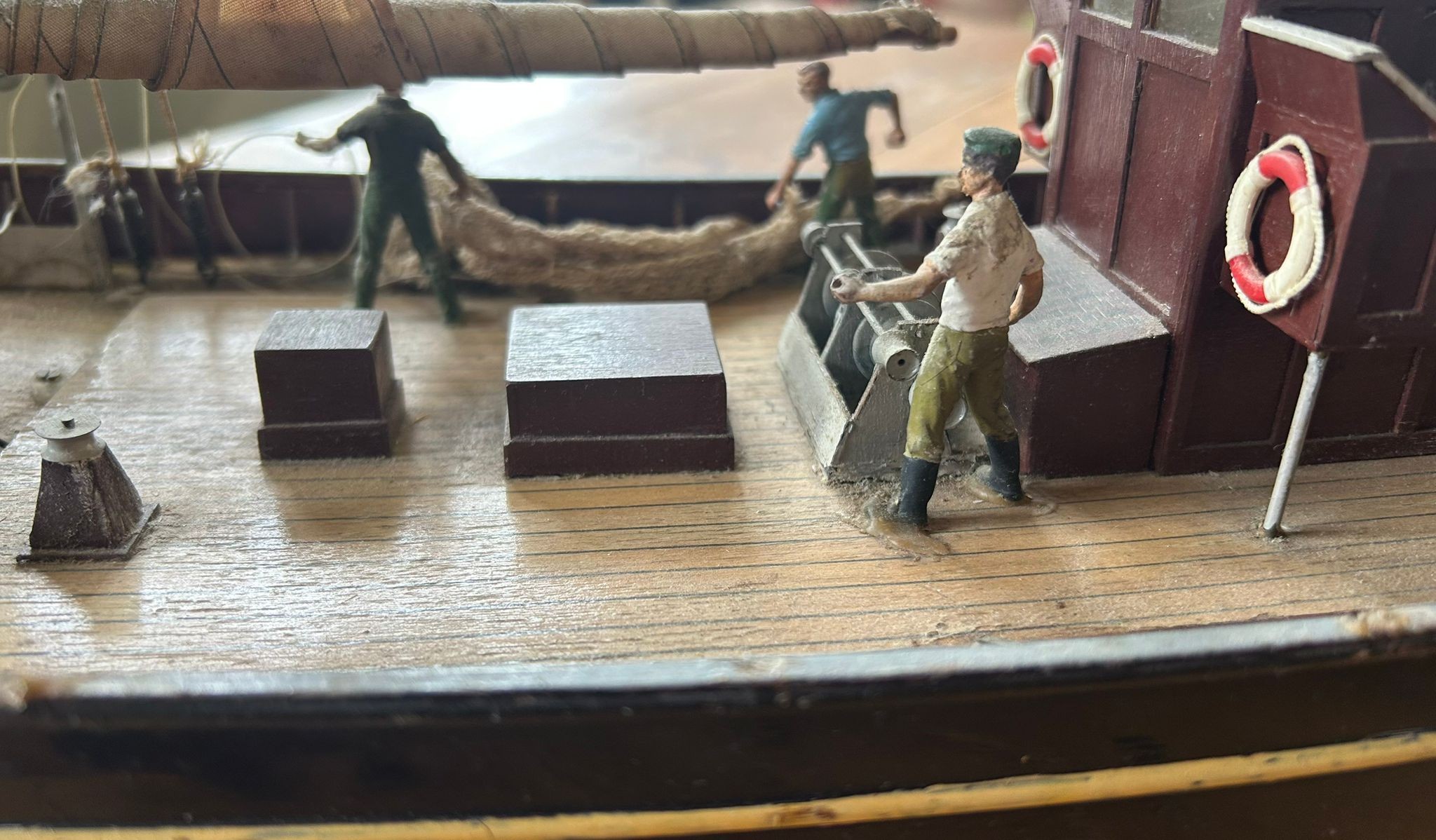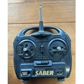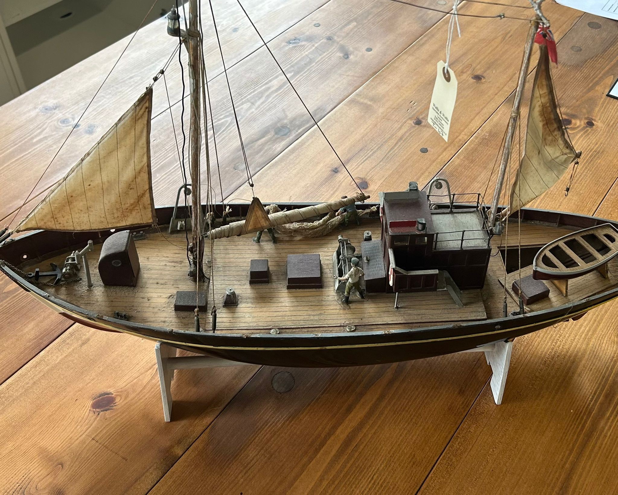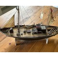 A lovely built model of a fishing schooner, HF408. Built from wood and plastic, cloth sails, life boat. Comes with a DASH SABER radio control unit. Overall length is 24". Requires cleaning from display. (untested). Might have some minor damage, or parts missing. GC.