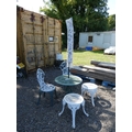 A pierced aluminium circular garden table together with a pair of similar chairs, a pair of similar stools and a parasol