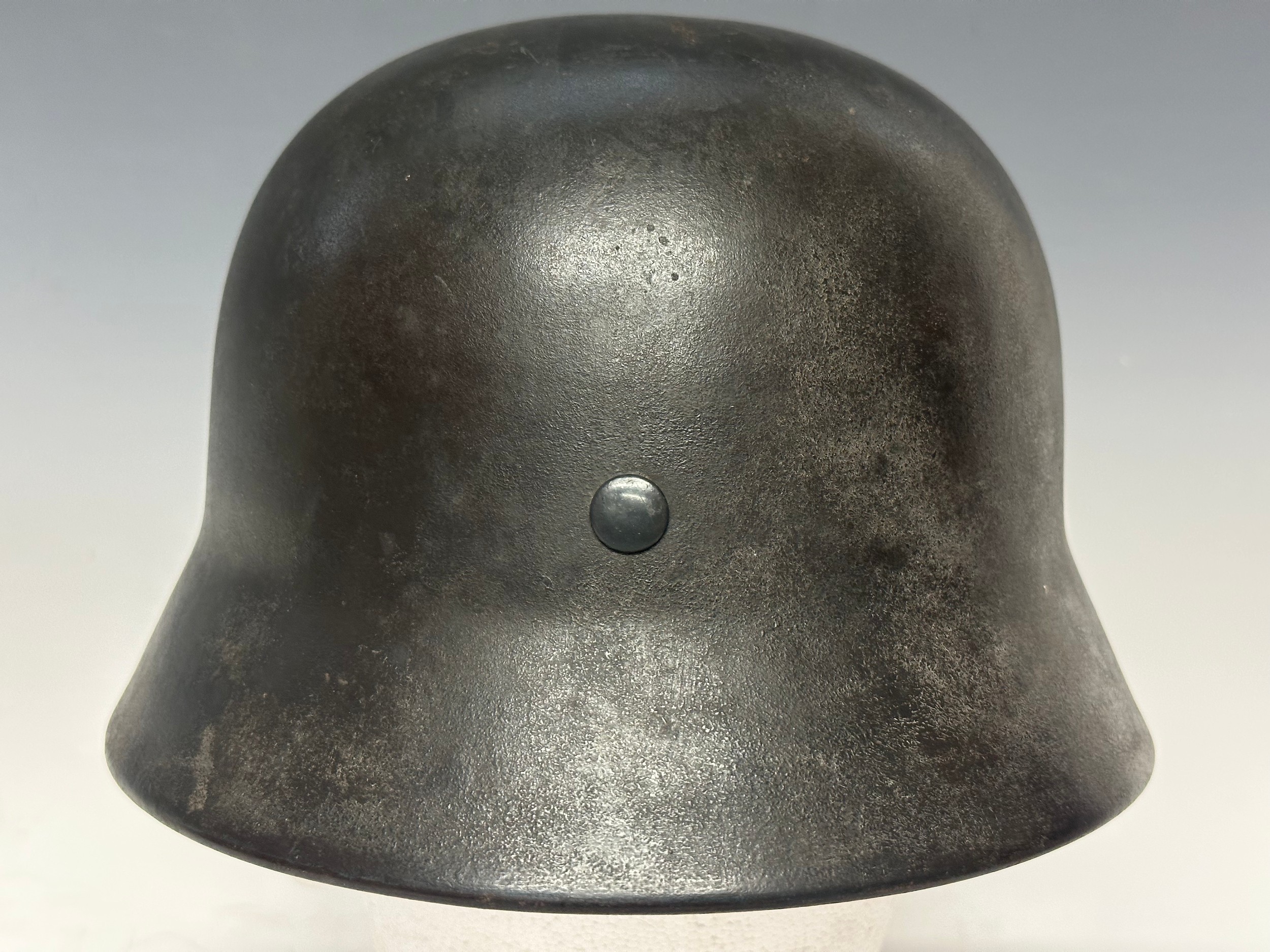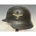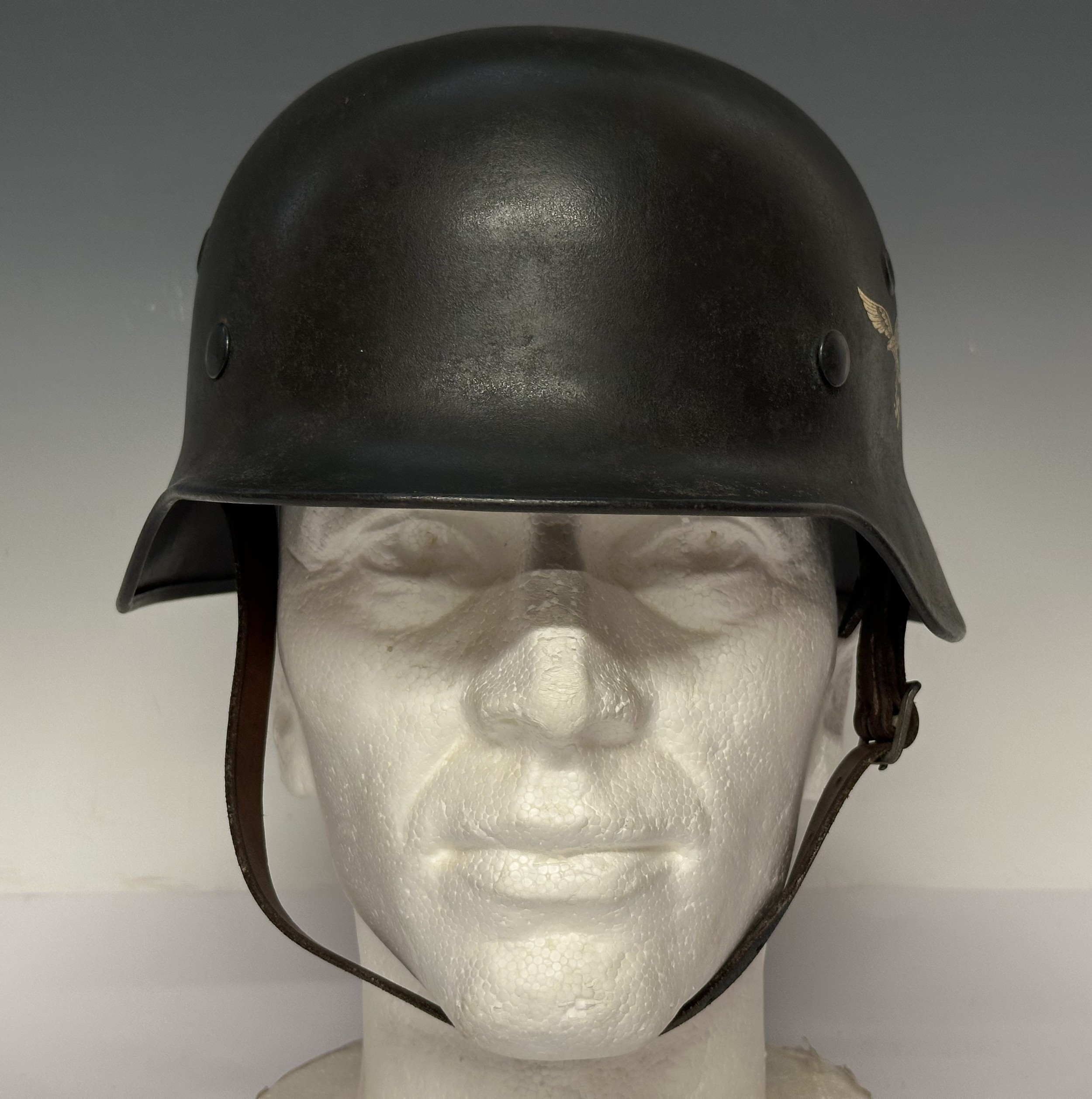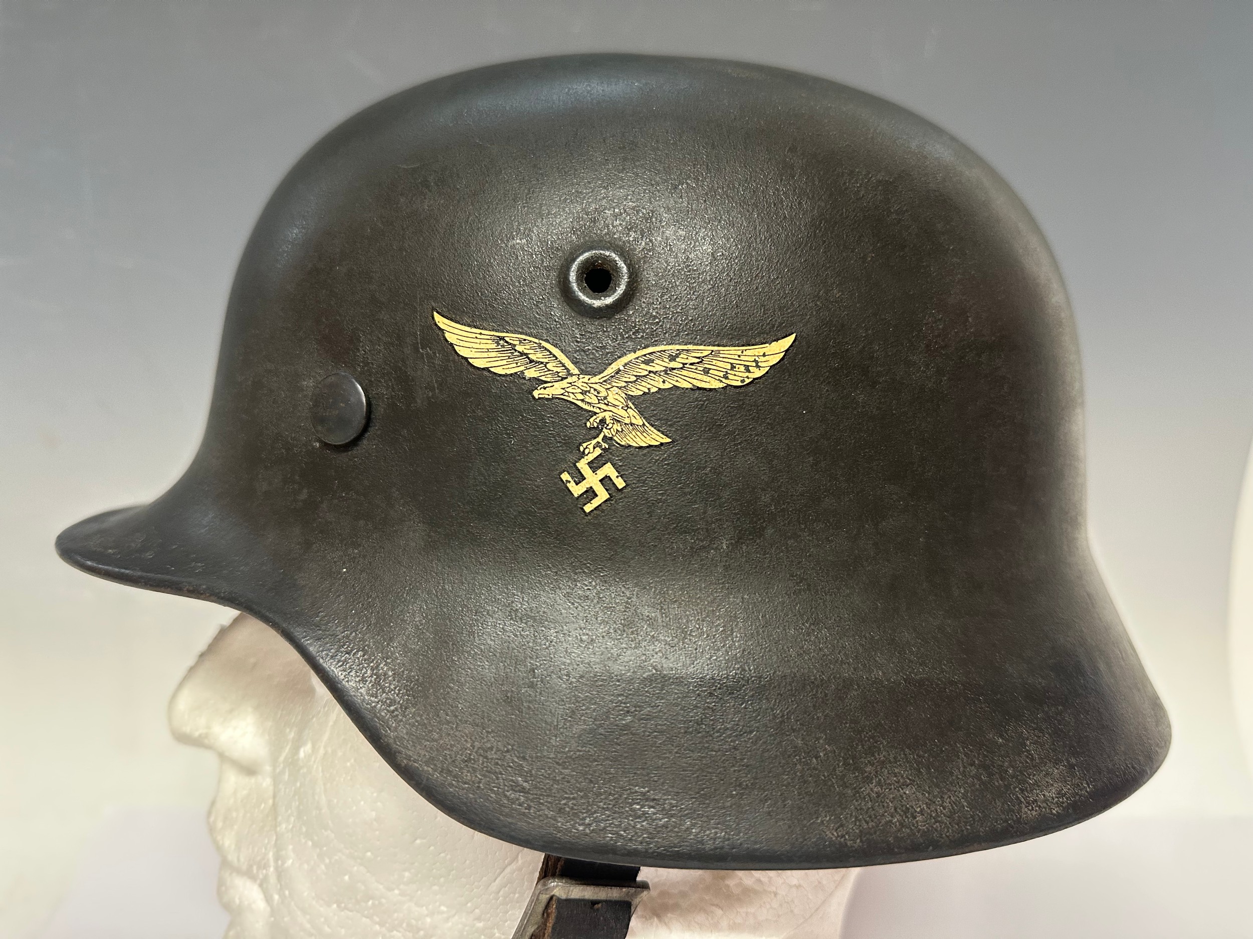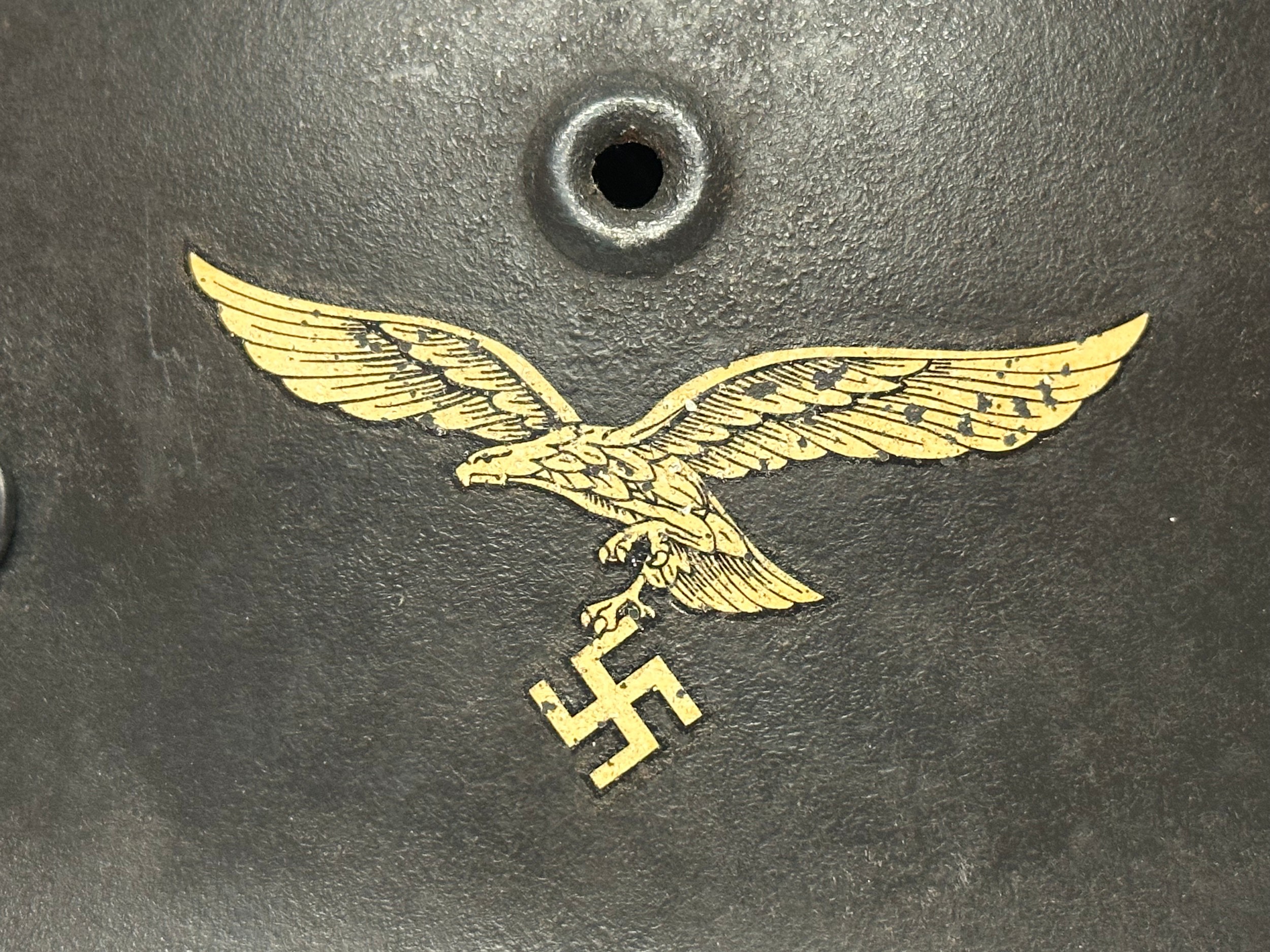 WW2 Third Reich Luftwaffe Single Decal M40 Steel Helmet. Shell is maker marked "ET64". Lot number marked 5157. Complete with liner size approx. 58. with original drawstring and with chinstrap. Original paint internally and externally. Decal 95% intact just with minor surface wear.