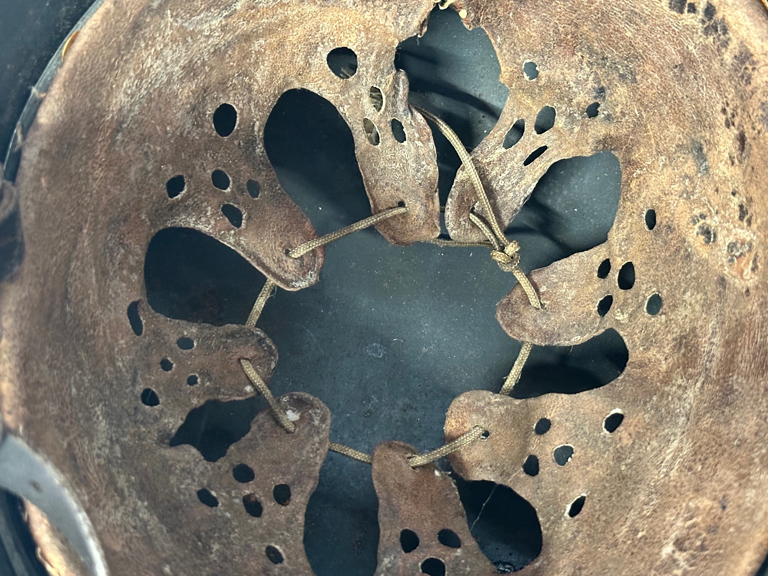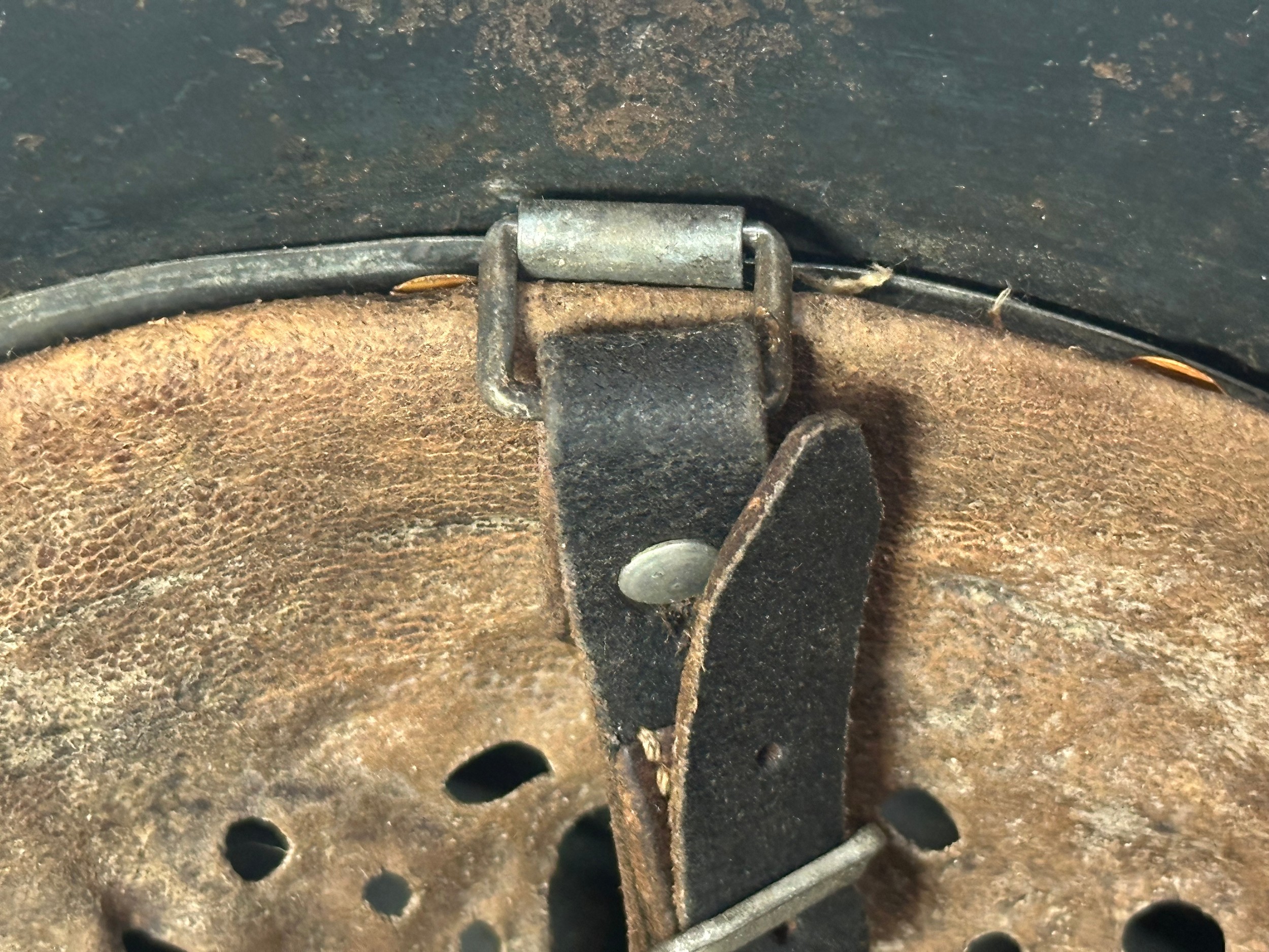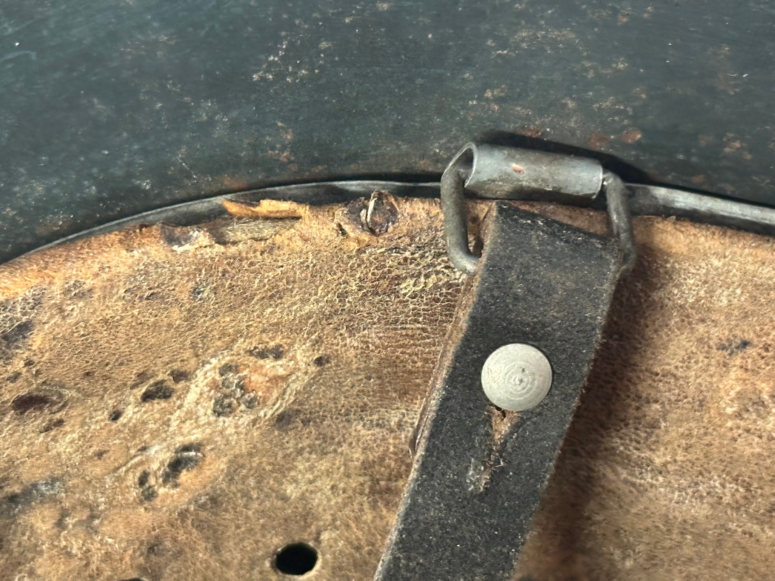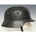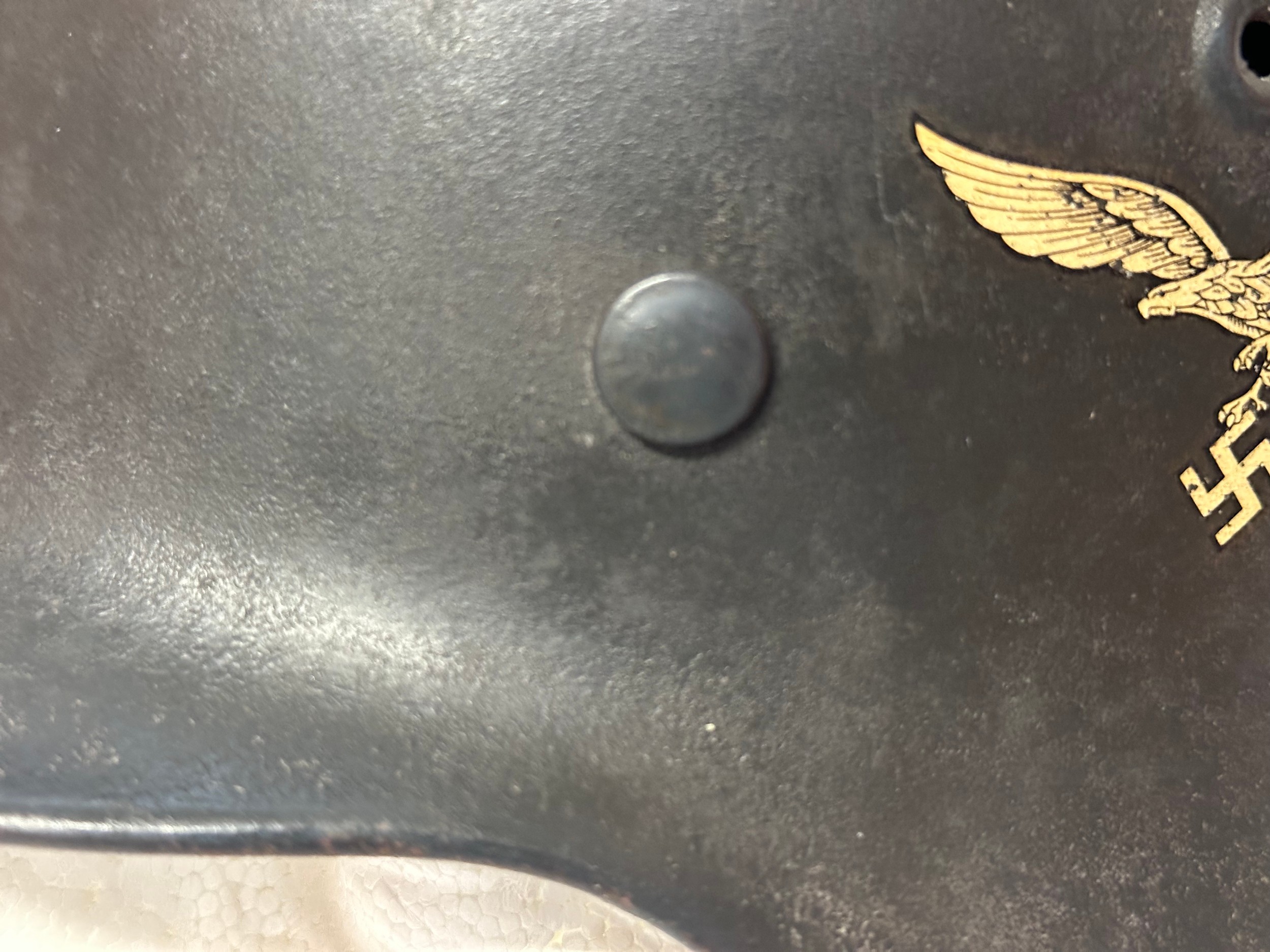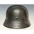 WW2 Third Reich Luftwaffe Single Decal M40 Steel Helmet. Shell is maker marked "ET64". Lot number marked 5157. Complete with liner size approx. 58. with original drawstring and with chinstrap. Original paint internally and externally. Decal 95% intact just with minor surface wear.