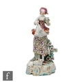 A late 18th to early 19th Century Derby type model of a flower seller, stood on a rococo scroll base holding aloft flowers in her apron, unmarked, height 24.5cm, S/D.