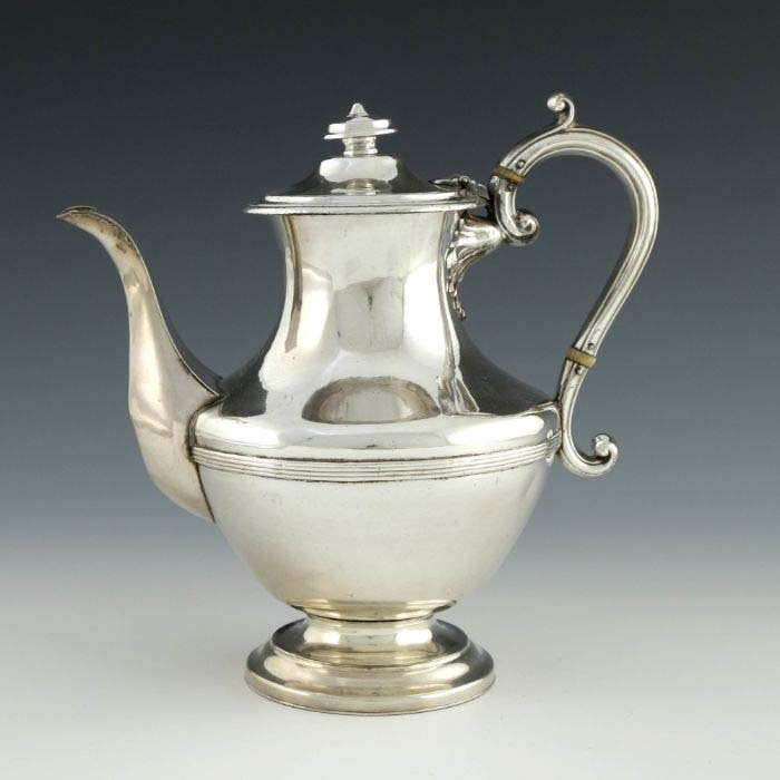 A George III Old Sheffield Plate coffee pot, Matthew Boulton, circa 1800, footed baluster form with reeded band, S scroll handle and disc finial, stamped marks, 24cm high