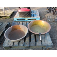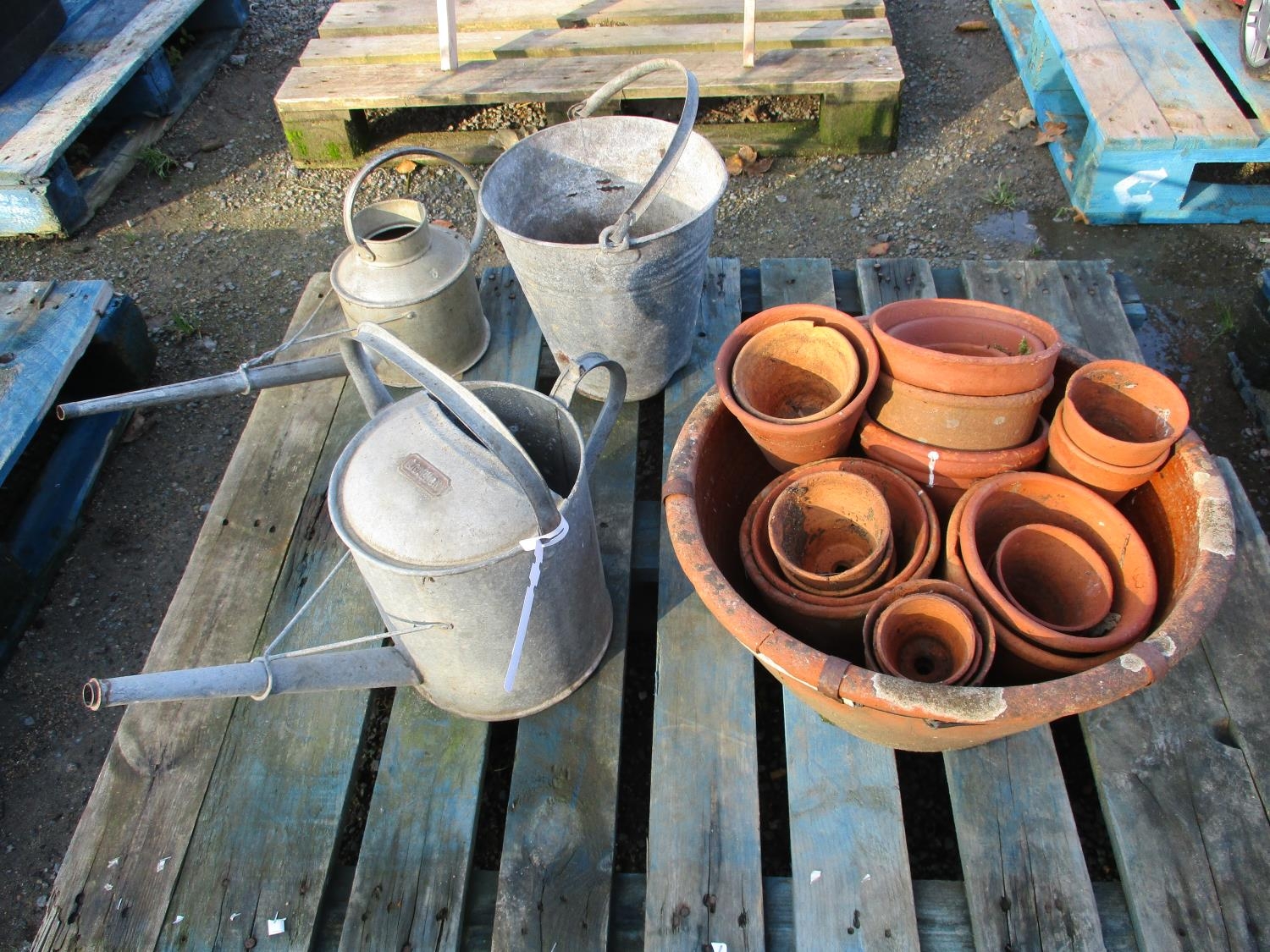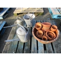 Two galvanised watering cans, a galvanised bucket and a quantity of terracotta pots