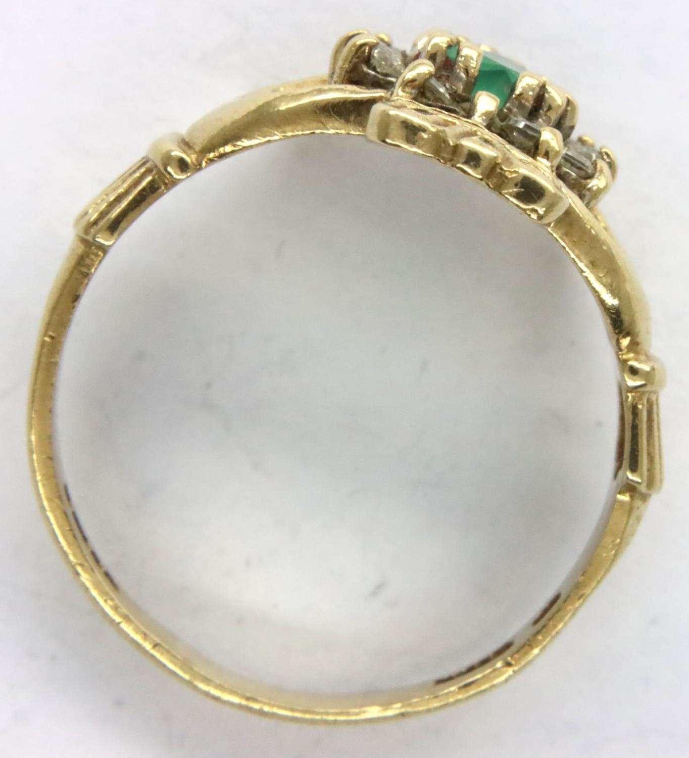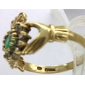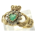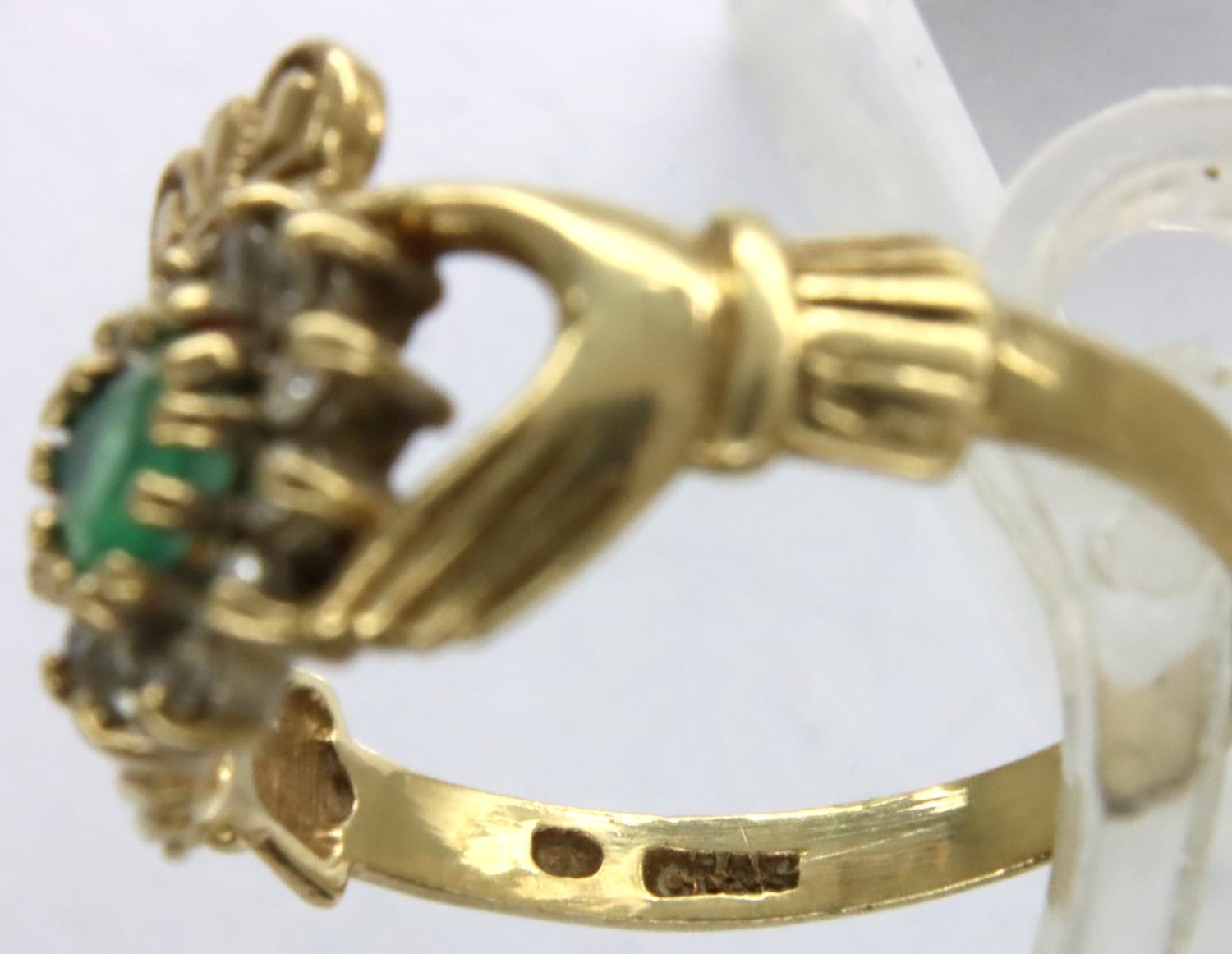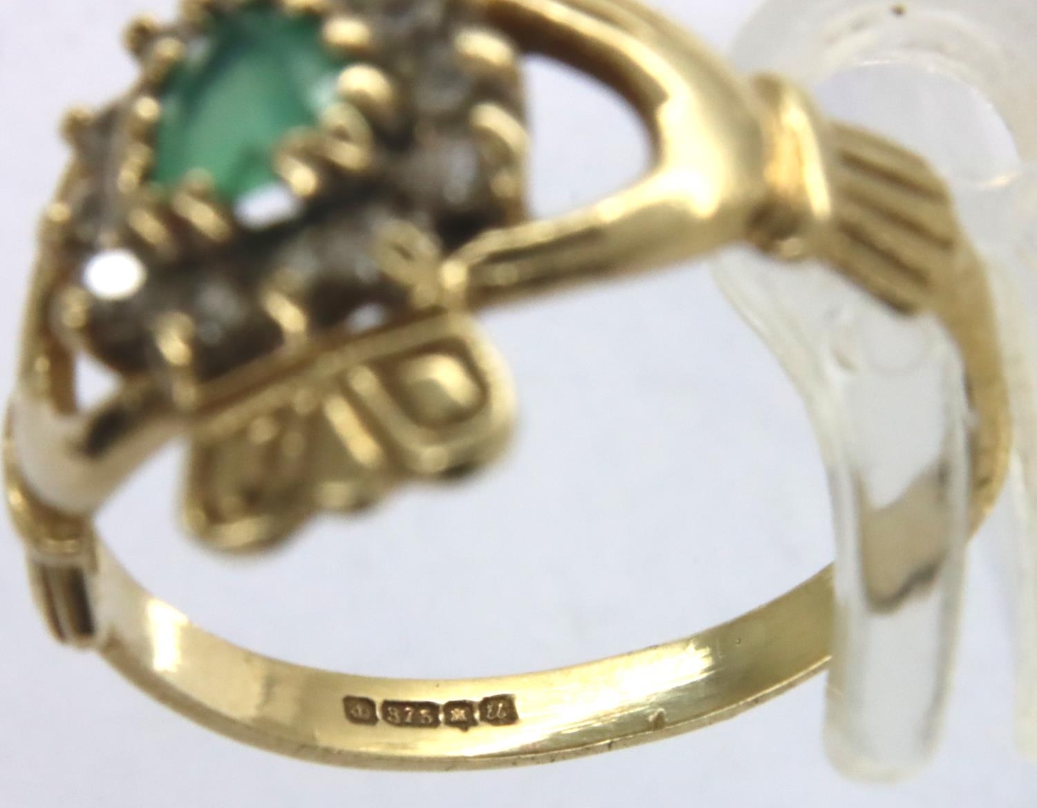 9ct gold emerald and white stone set Claddagh ring, size M/N, 2.2g. P&P Group 1 (£14+VAT for the first lot and £1+VAT for subsequent lots)