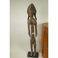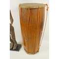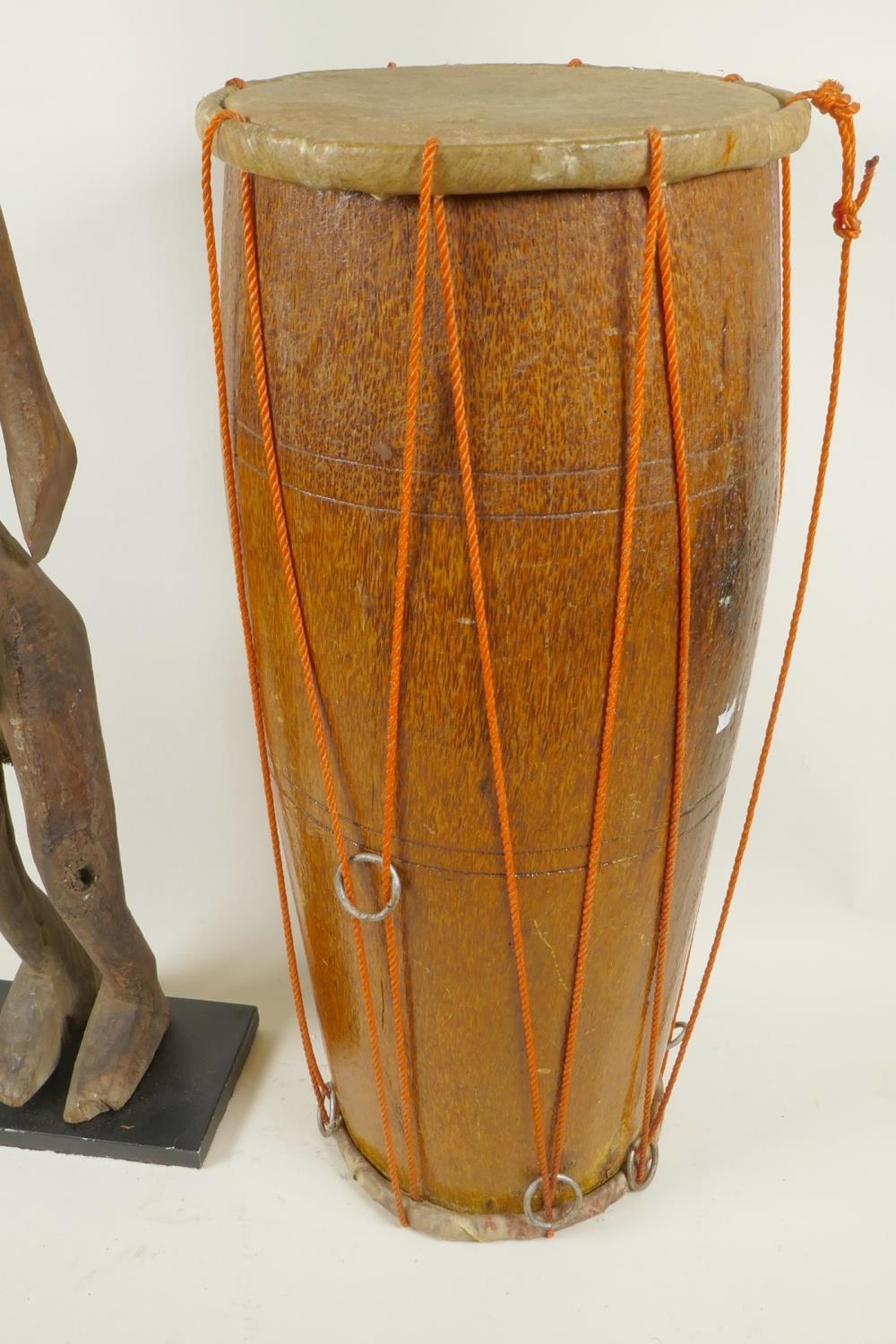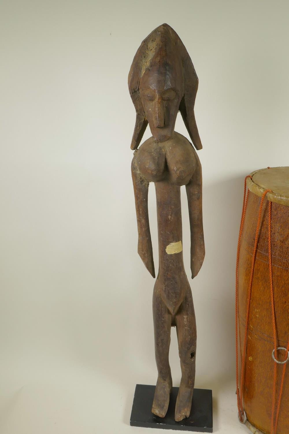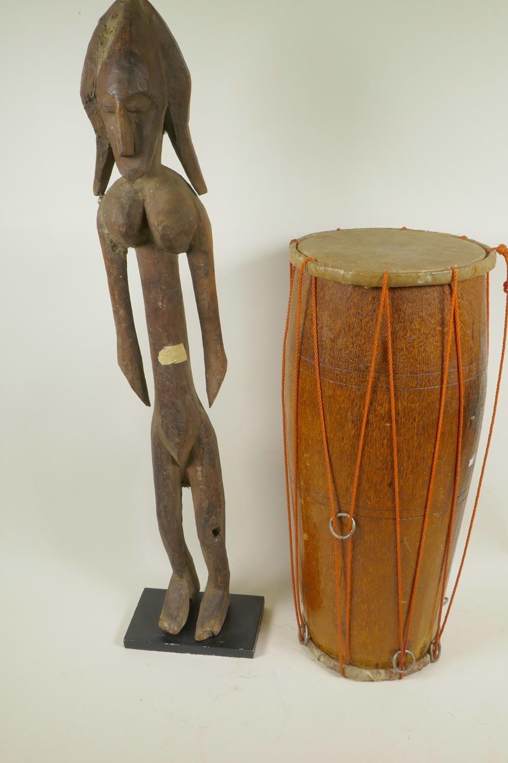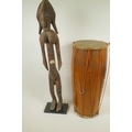 An African carved wood figure of a woman, 27½" high, together with a double skinned tribal drum