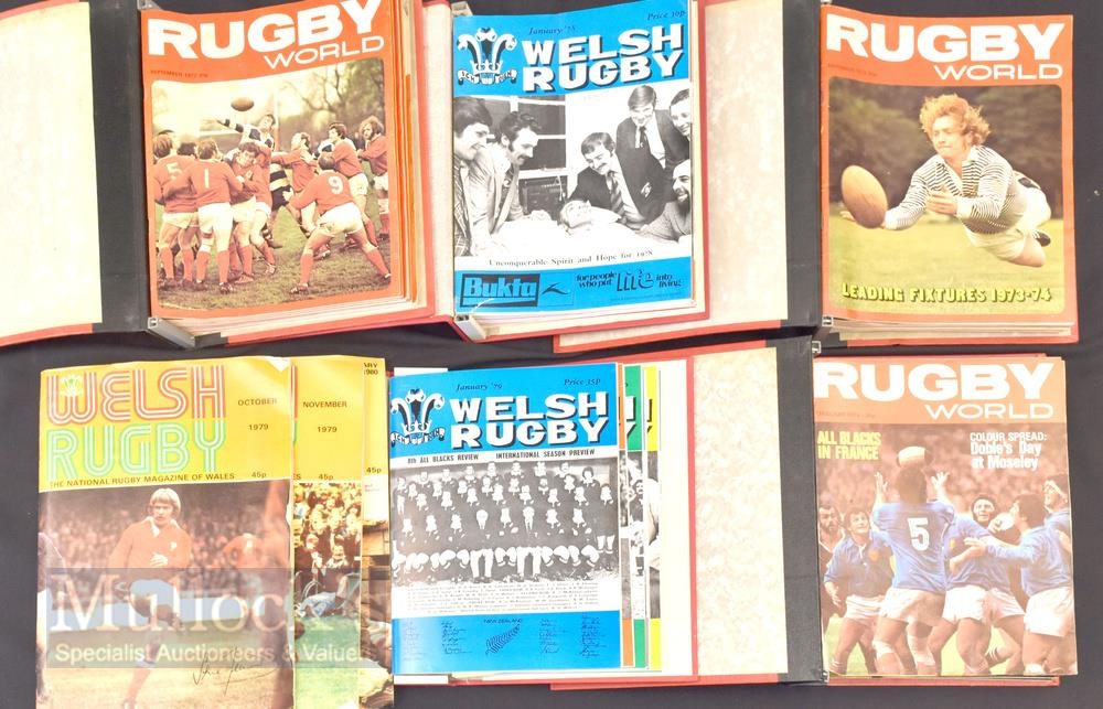 1972-79 Rugby World & Welsh Rugby Magazines Bound Vols (6): In the official red hard binders with gilt titles to spine, four bound vols of Rugby Worlds, Sept 1972-Aug 1973, Sept 1973-Aug 1974, & for the calendar years 1978 & 1979; and the same latter years for two volumes of Welsh Rugby. Really valuables archives of half-forgotten info and a great many pictures. Generally G/VG