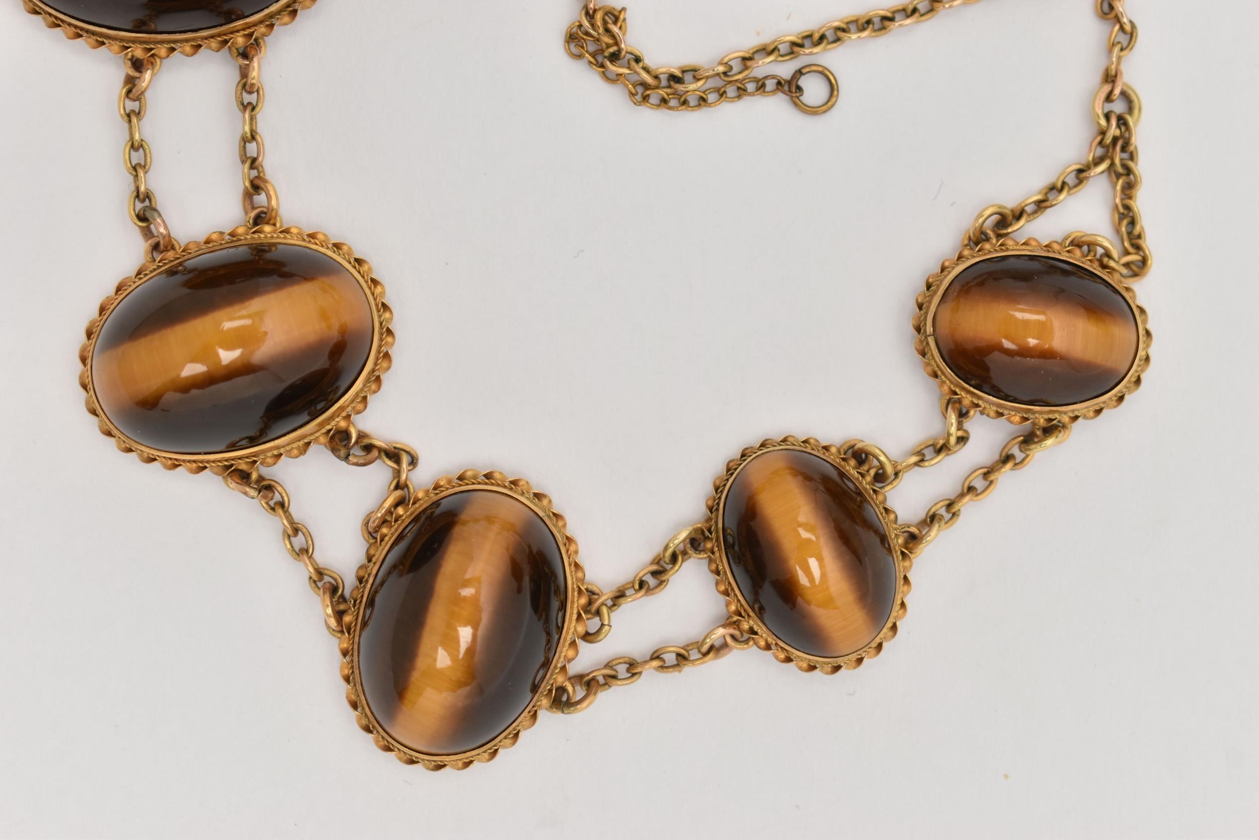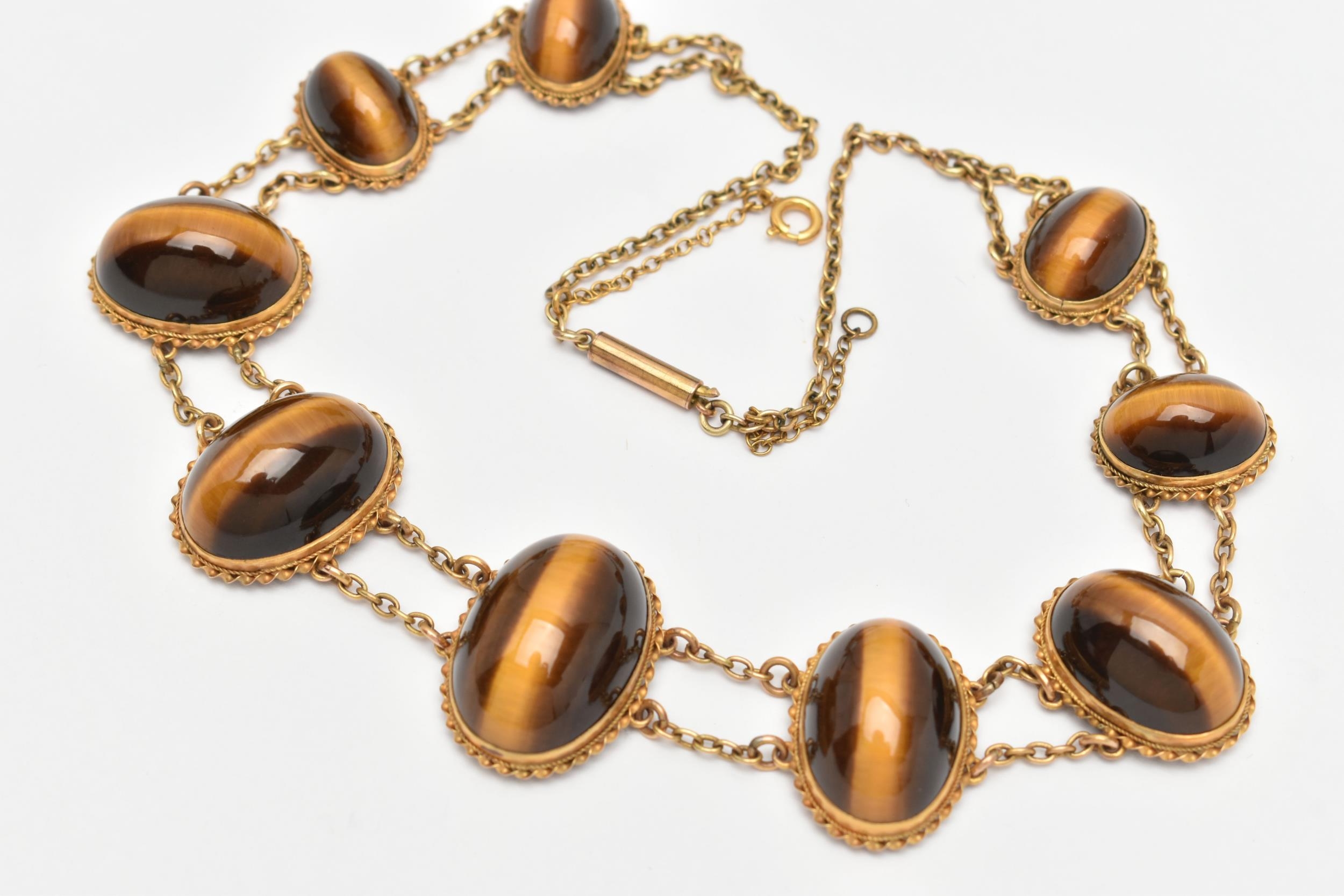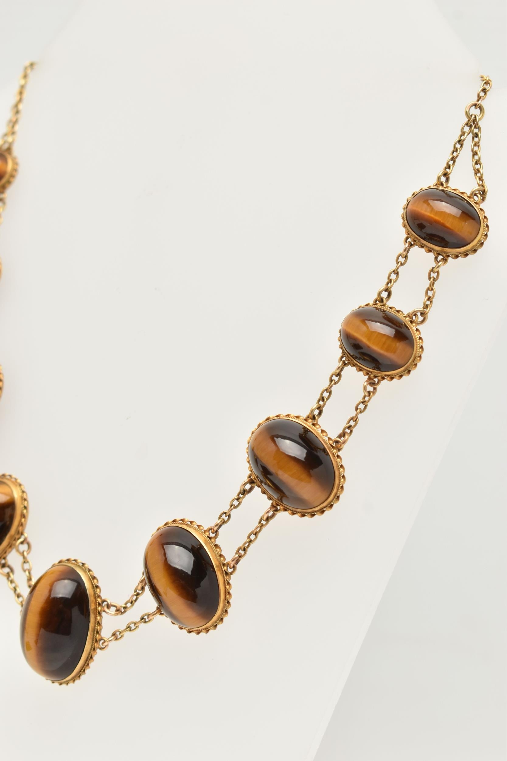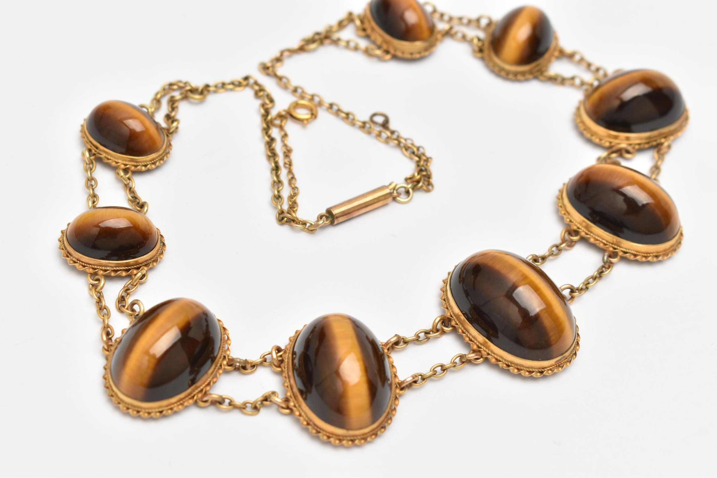 A YELLOW METAL TIGER EYE CABOCHON NECKLACE, designed as a series of nine graduated oval tiger eye cabochons, each collet set within a rope twist surround, each fitted to double trace chains, largest cabochon measuring approximately length 24.4mm x width 16.3mm, smallest 14.4mm x width 10.3mm, fitted with a barrel clasp rubbed unclear mark, with additional safety chain, length 380mm, approximate gross weight 43.0 grams (condition report: general light wear, clasp has a previous acid test mark)