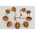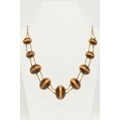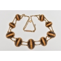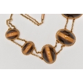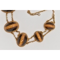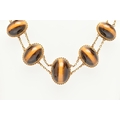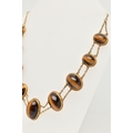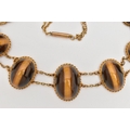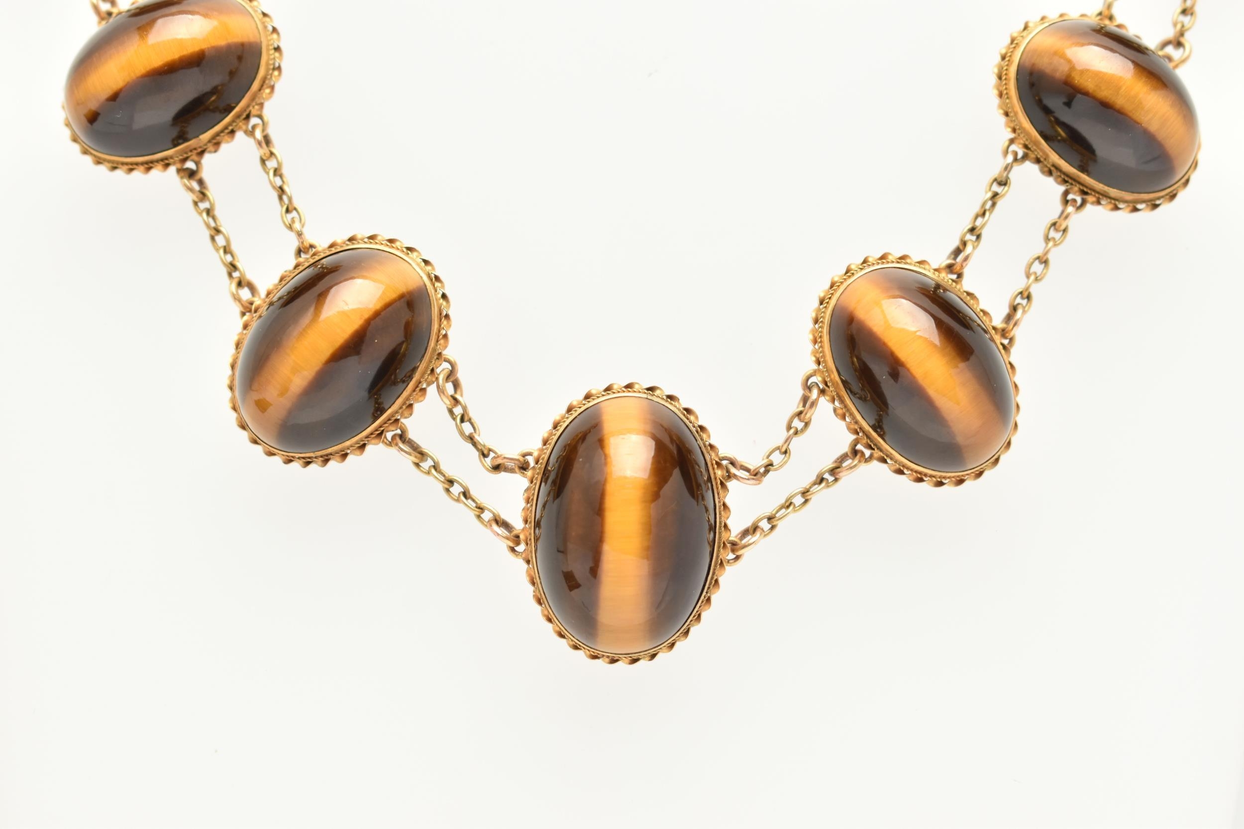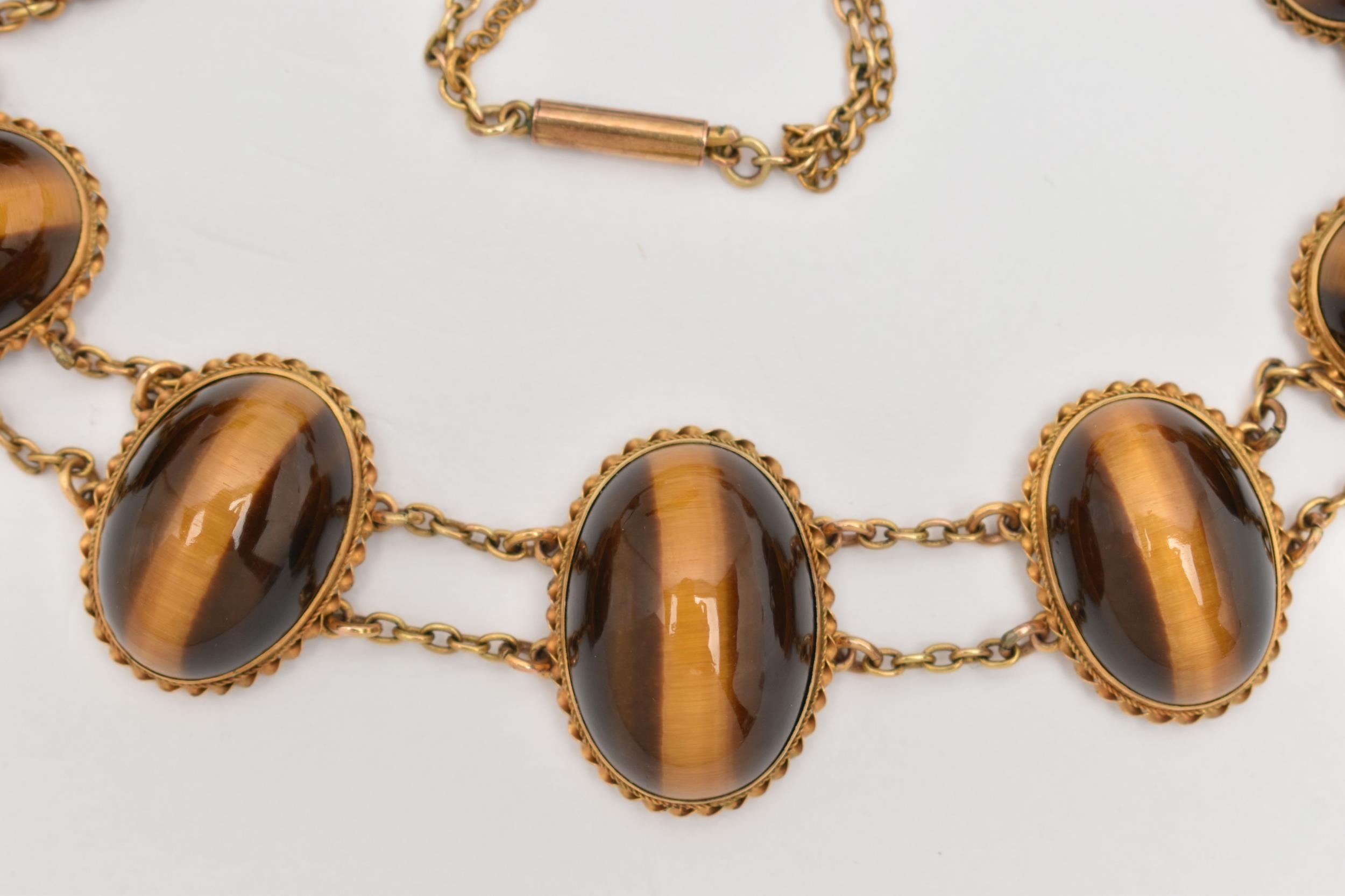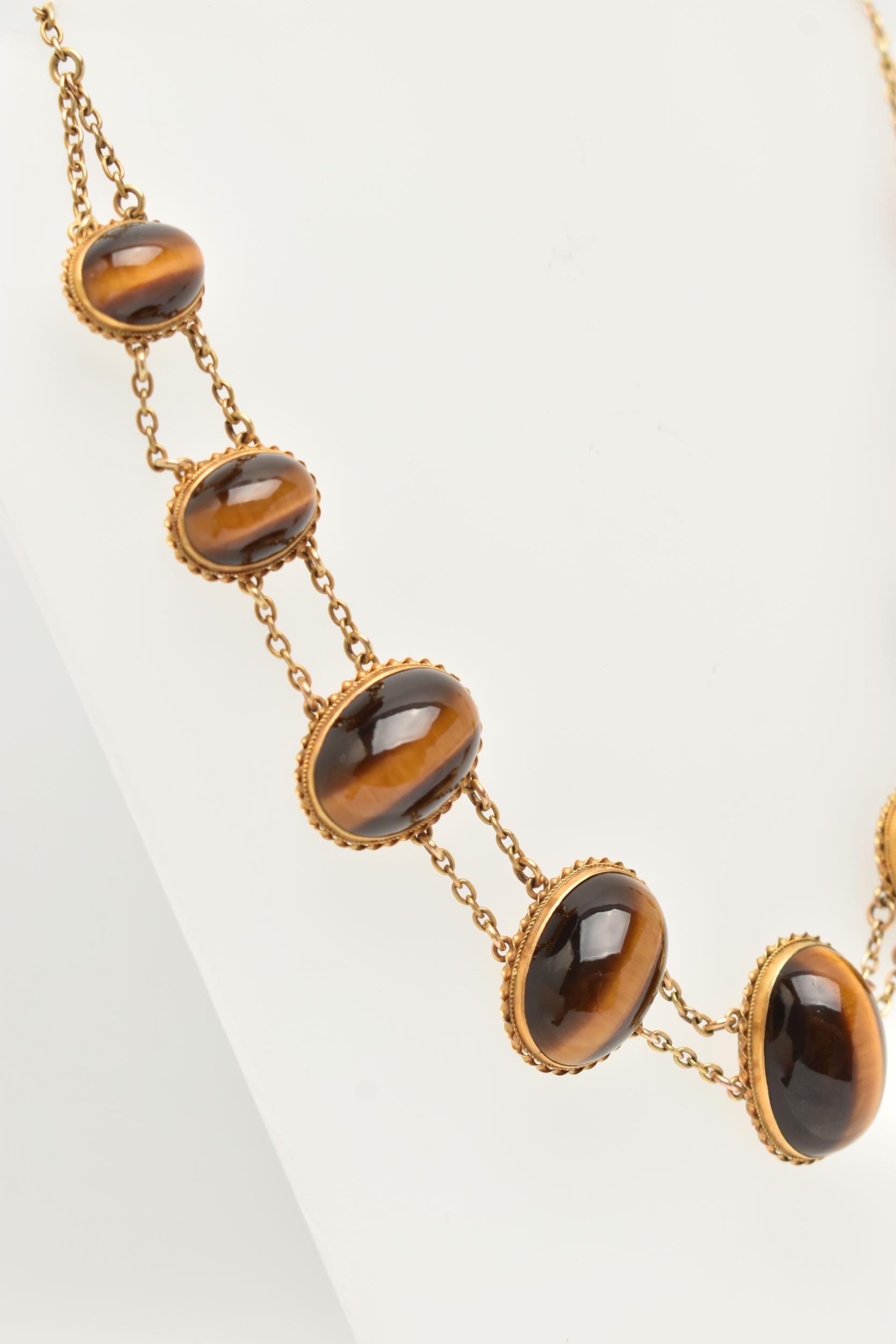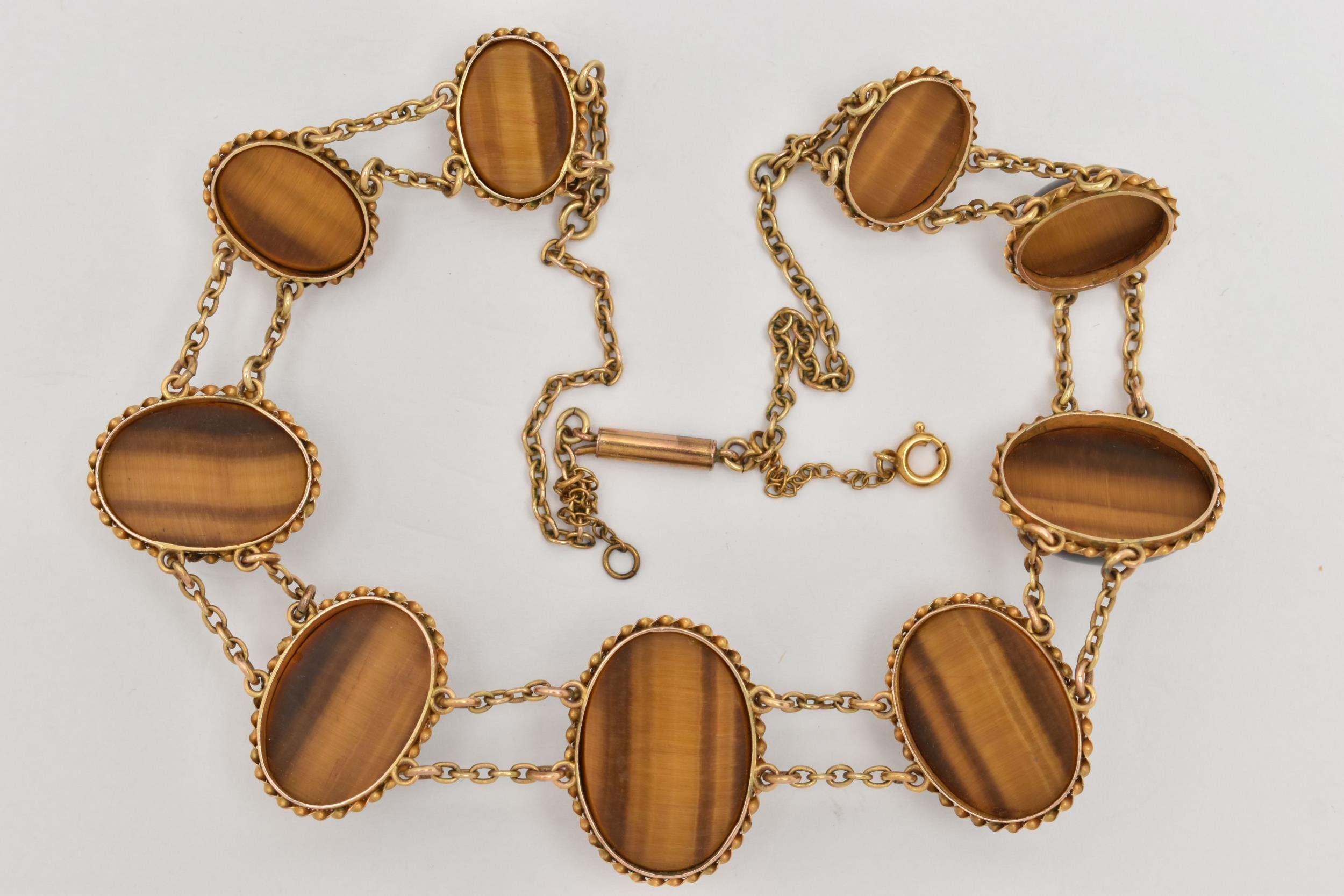 A YELLOW METAL TIGER EYE CABOCHON NECKLACE, designed as a series of nine graduated oval tiger eye cabochons, each collet set within a rope twist surround, each fitted to double trace chains, largest cabochon measuring approximately length 24.4mm x width 16.3mm, smallest 14.4mm x width 10.3mm, fitted with a barrel clasp rubbed unclear mark, with additional safety chain, length 380mm, approximate gross weight 43.0 grams (condition report: general light wear, clasp has a previous acid test mark)