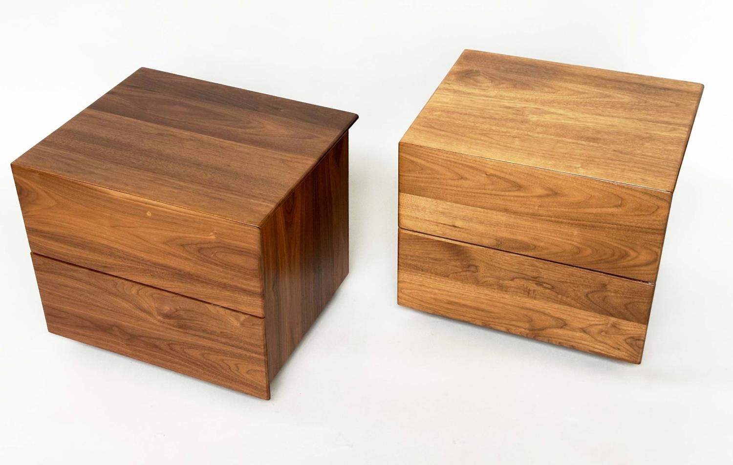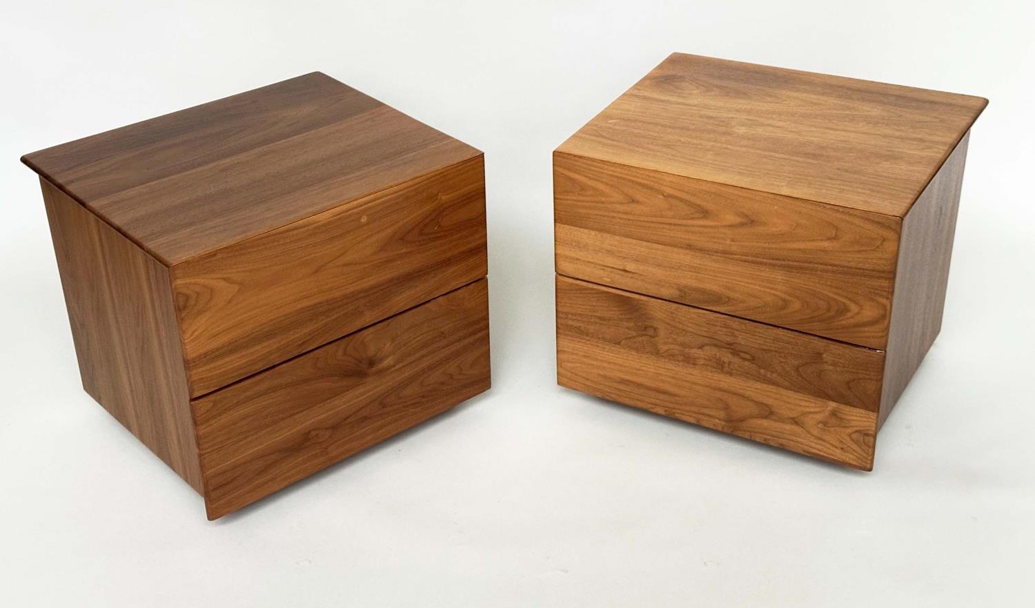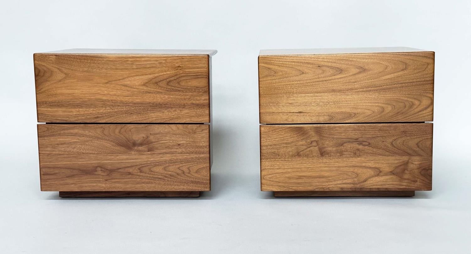 CORSINI BEDSIDE CHESTS BY ALEXANDER MILES, handmade figured walnut each with two drawers, 50cm x 43cm x 42cm H. (2)