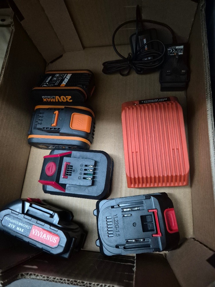 A box of 18v and 20v cordless batteries and chargers - 2 x Worx batteries plus 1 chargers; BMC lawnmower charger; Spear & Jackson 18v Li-ion battery; 2 Vivianus 21v batteries