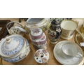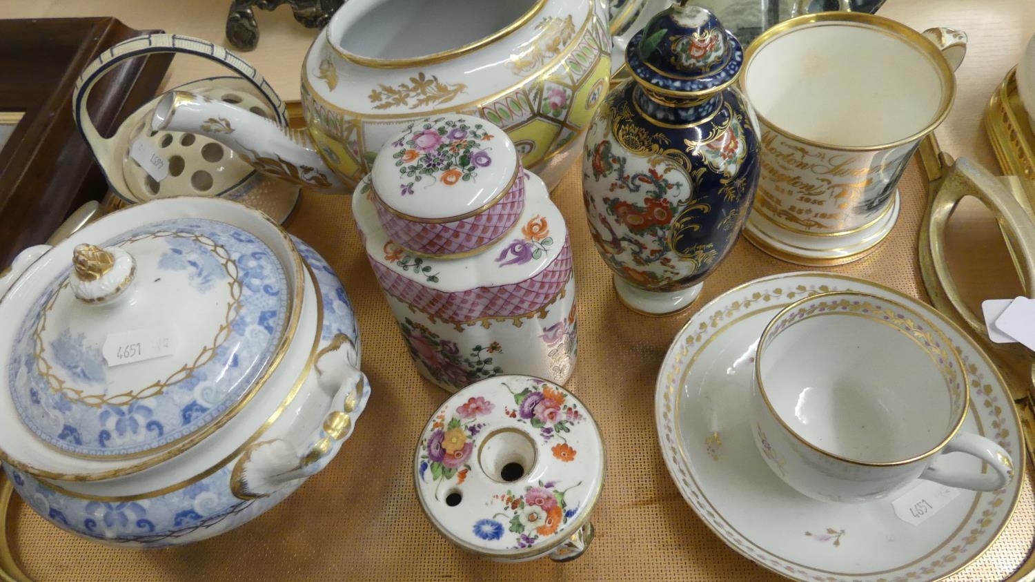 Tray Lot - Victorian Commemorative China Mug, Porcelain Tea Caddy, First Period Worcester China Tea Poy (extensive restoration), etc.