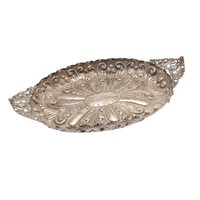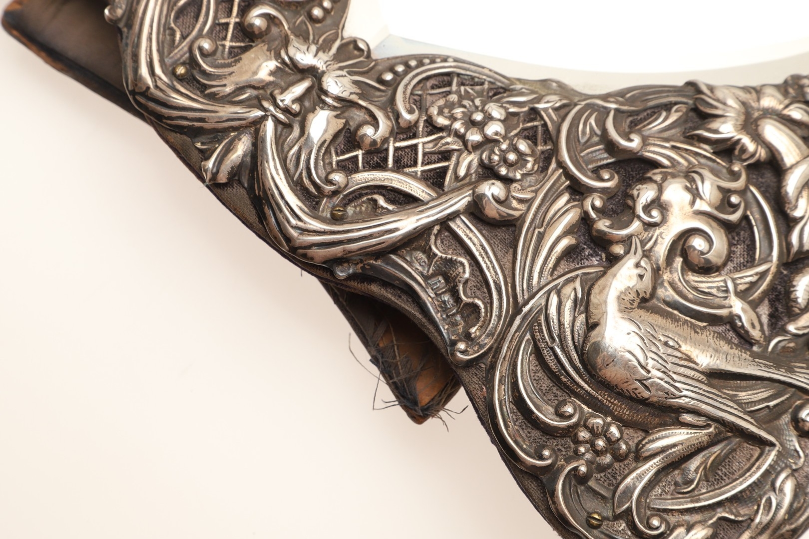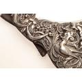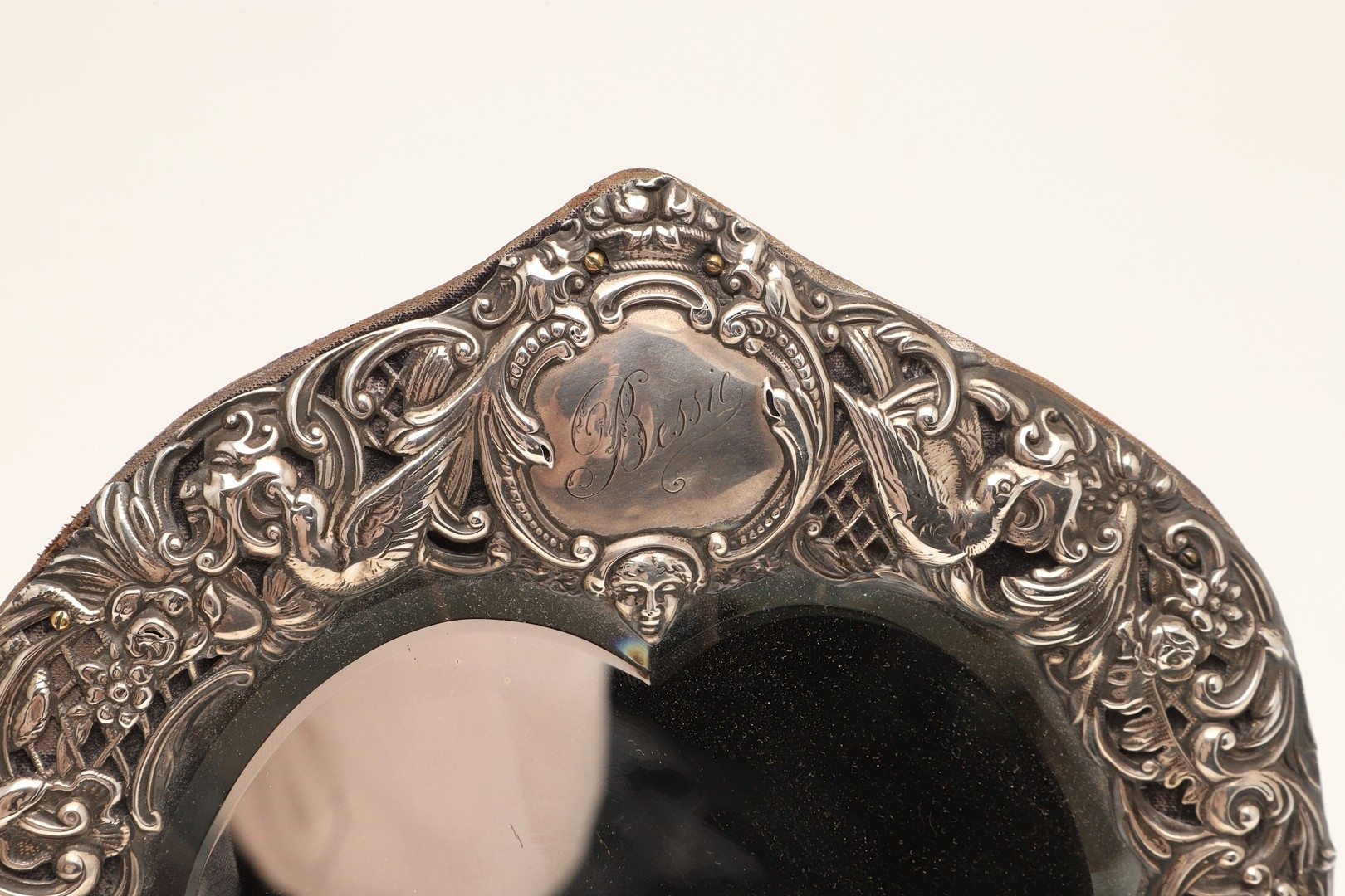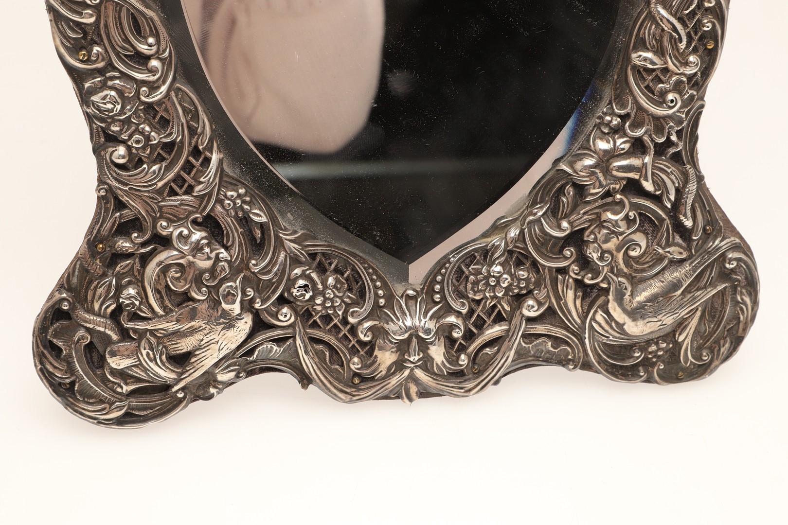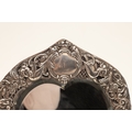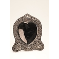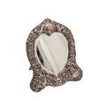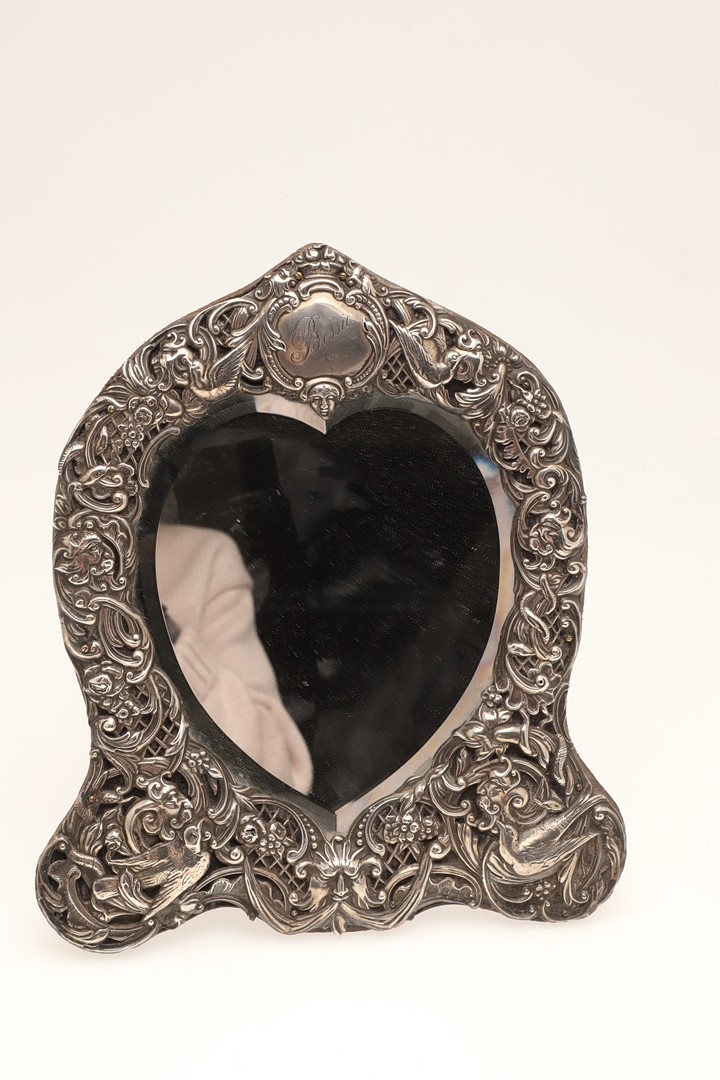 AN EDWARDIAN SILVER ART NOUVEAU STYLE TABLE MIRROR. Of shaped form, the bevelled edge heart shape mirror with a decorative art nouveau stye border, featuring a repousse pattern of mythical style masks, Birds, Flowers and Scrolls on a trellis background, a central cartouche to the top of the mirror, bearing the engraved name 'Bessie'. Supported by an easel back. Hallmarked William Comyns & Sons, London, 1903. Height 27.5cm x Width 24cm.