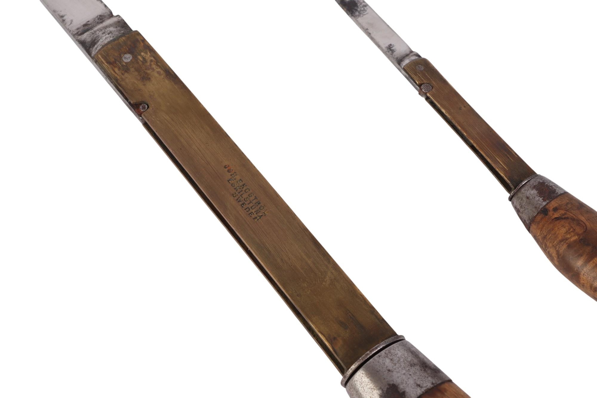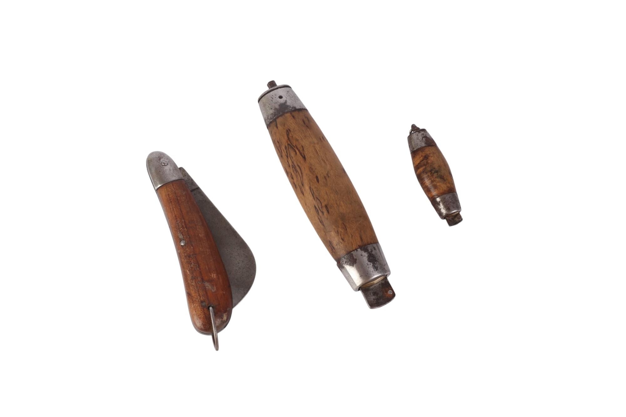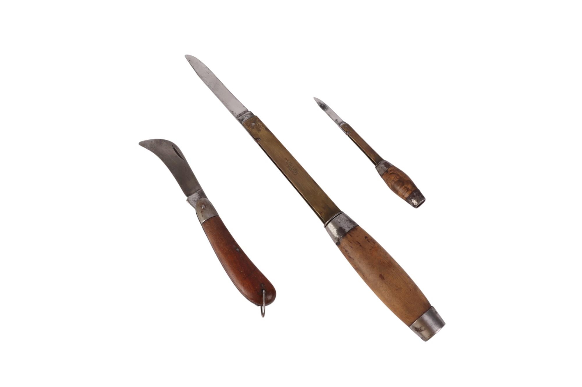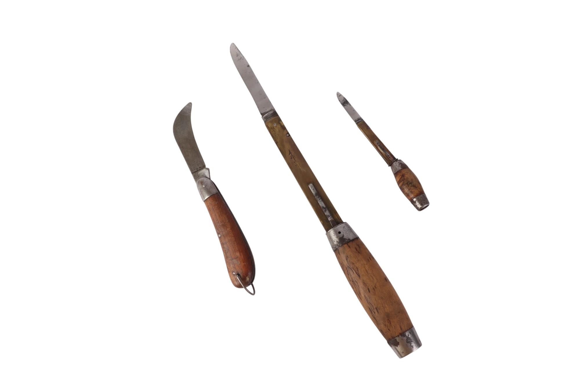 Three Swedish barrel knives with treen handles, the largest 14cms long (closed) (3).