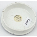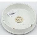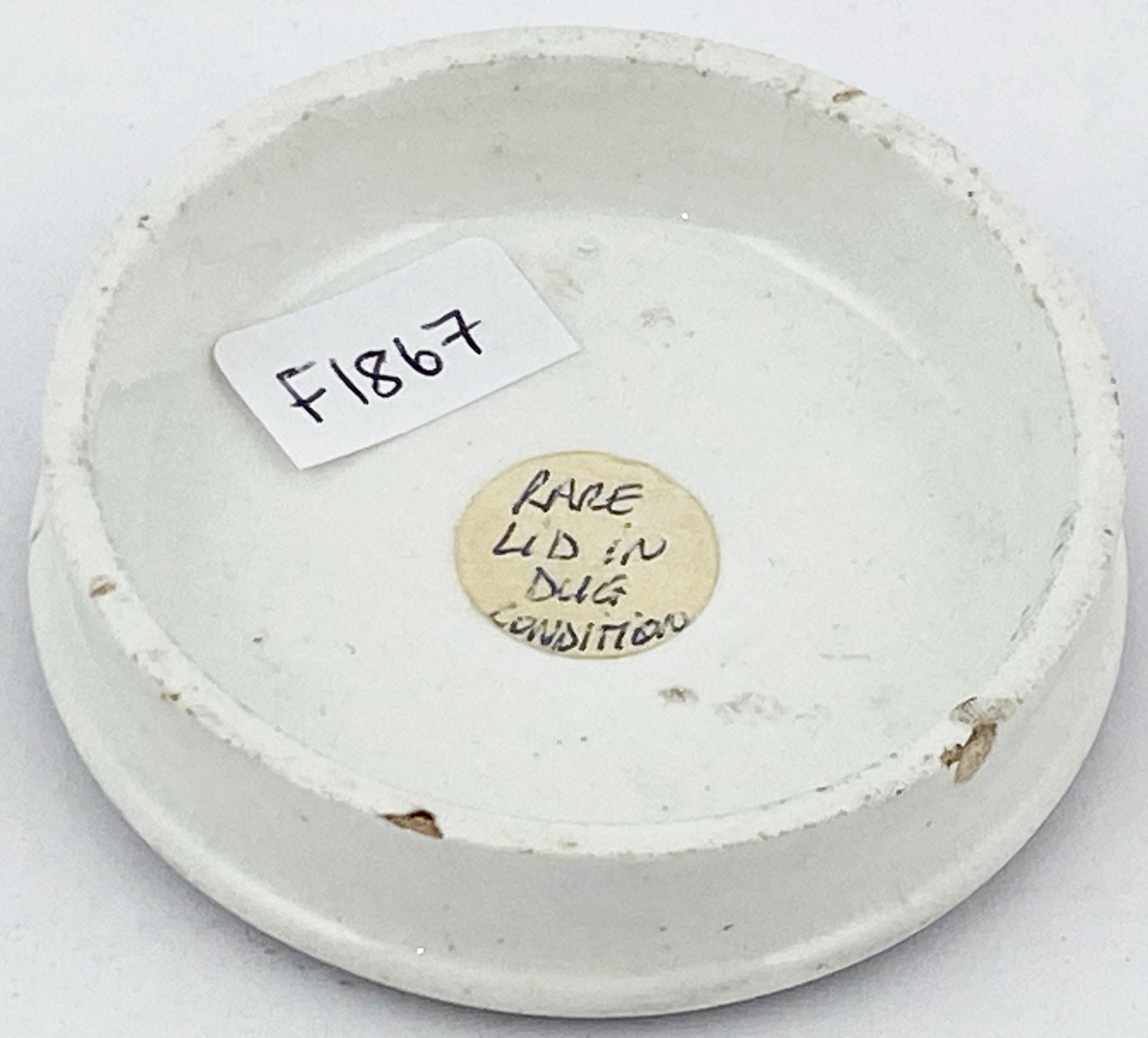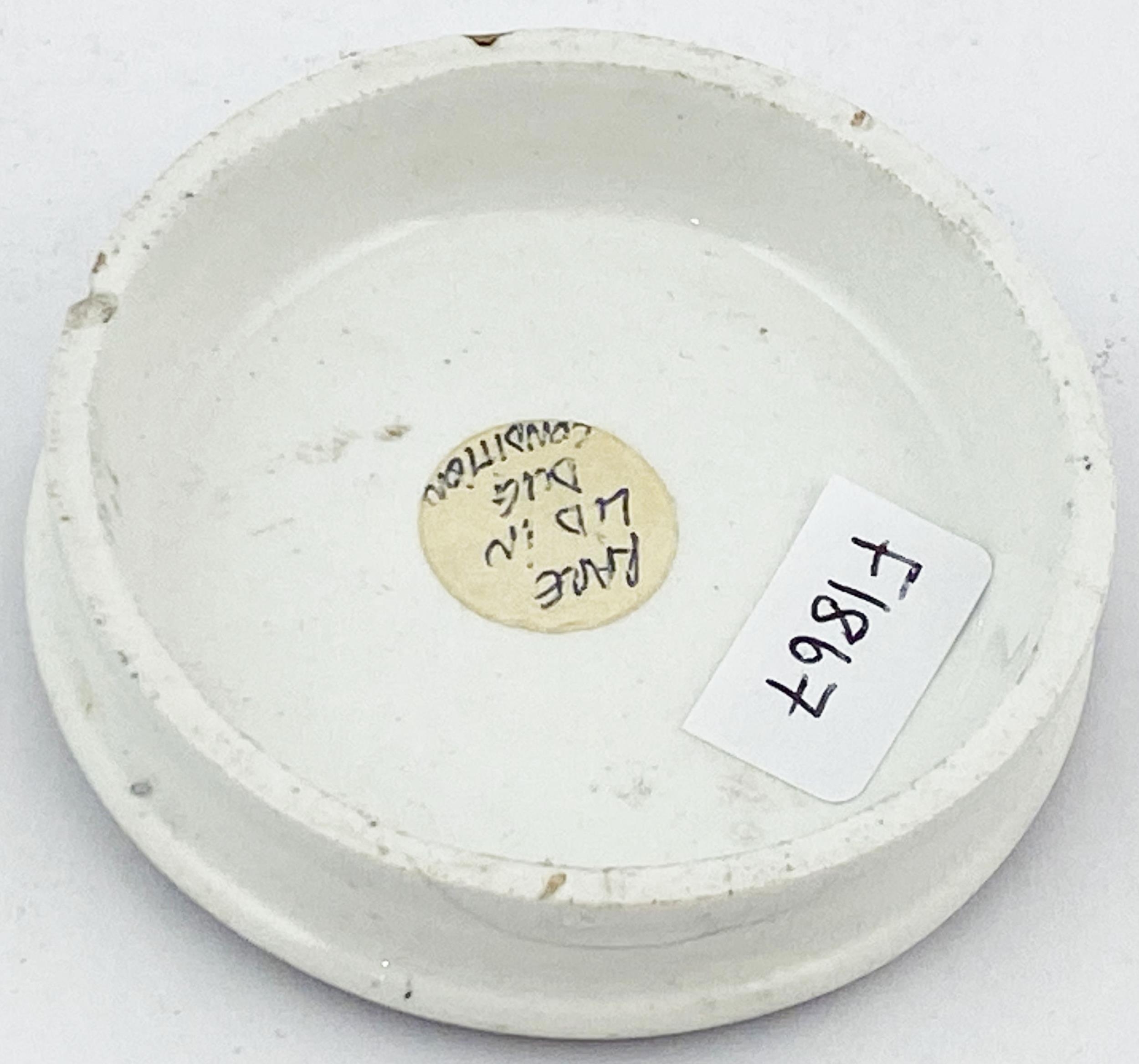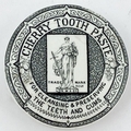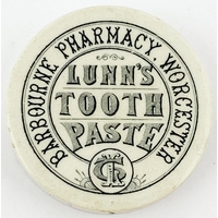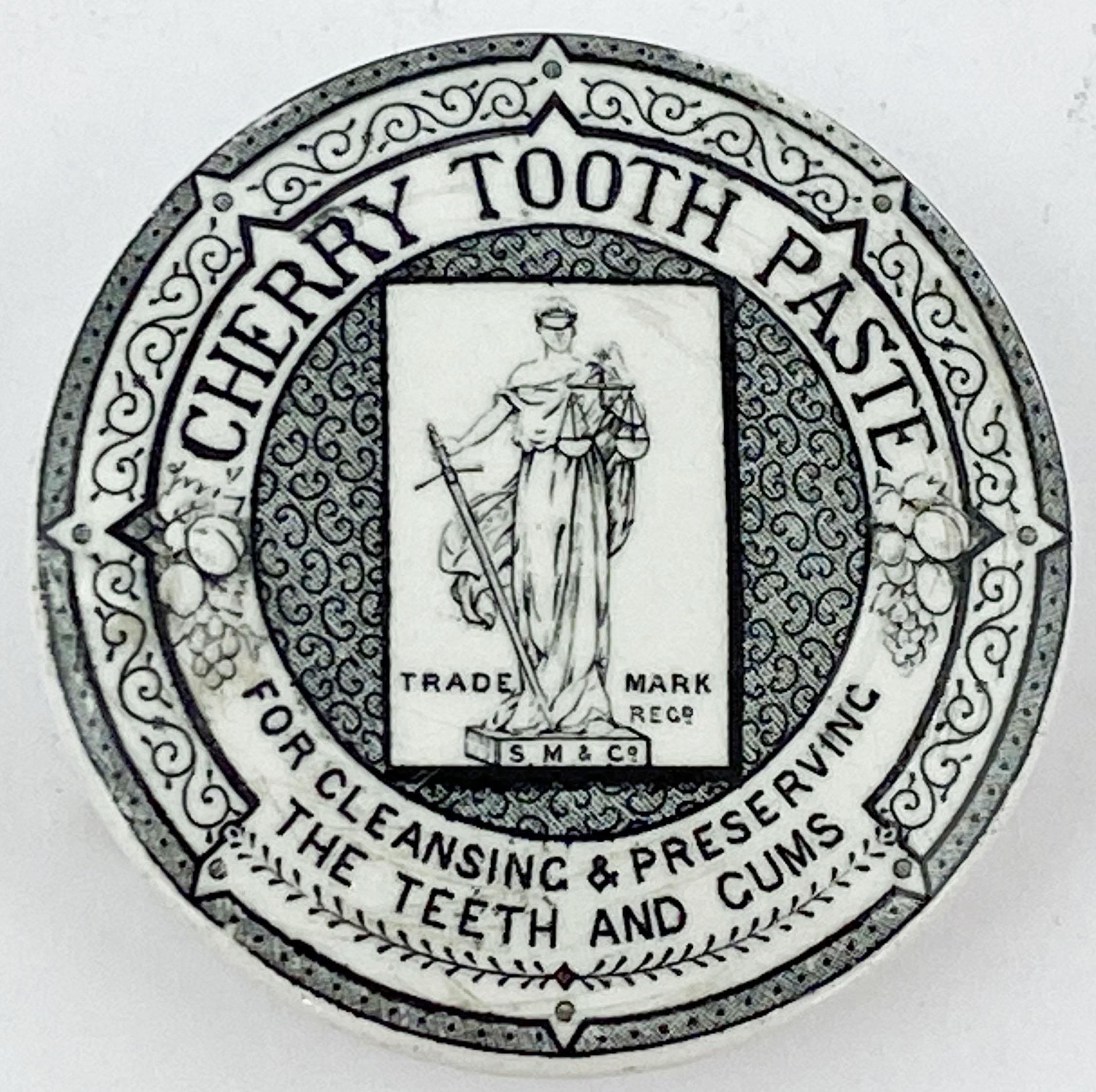 CHERRY TOOTH PASTE POT LID. 2.5ins diam. Black transfer. Scales of justice pict to centre within a fancy border with fruit to either side. Surface wear, under edge nibbles