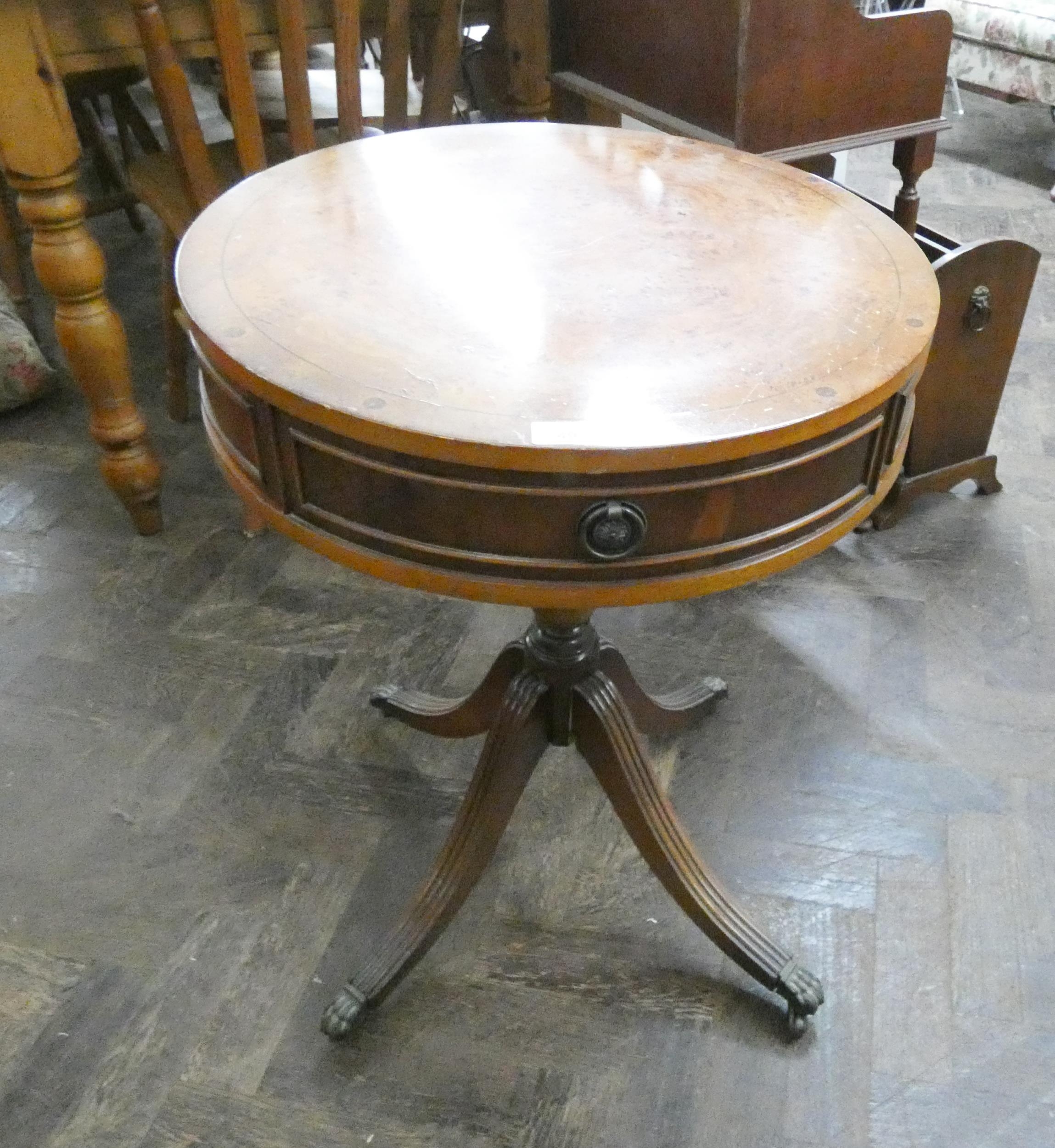 A Burr yew wood circular drum table style occasional table on quadruple base with brass feet