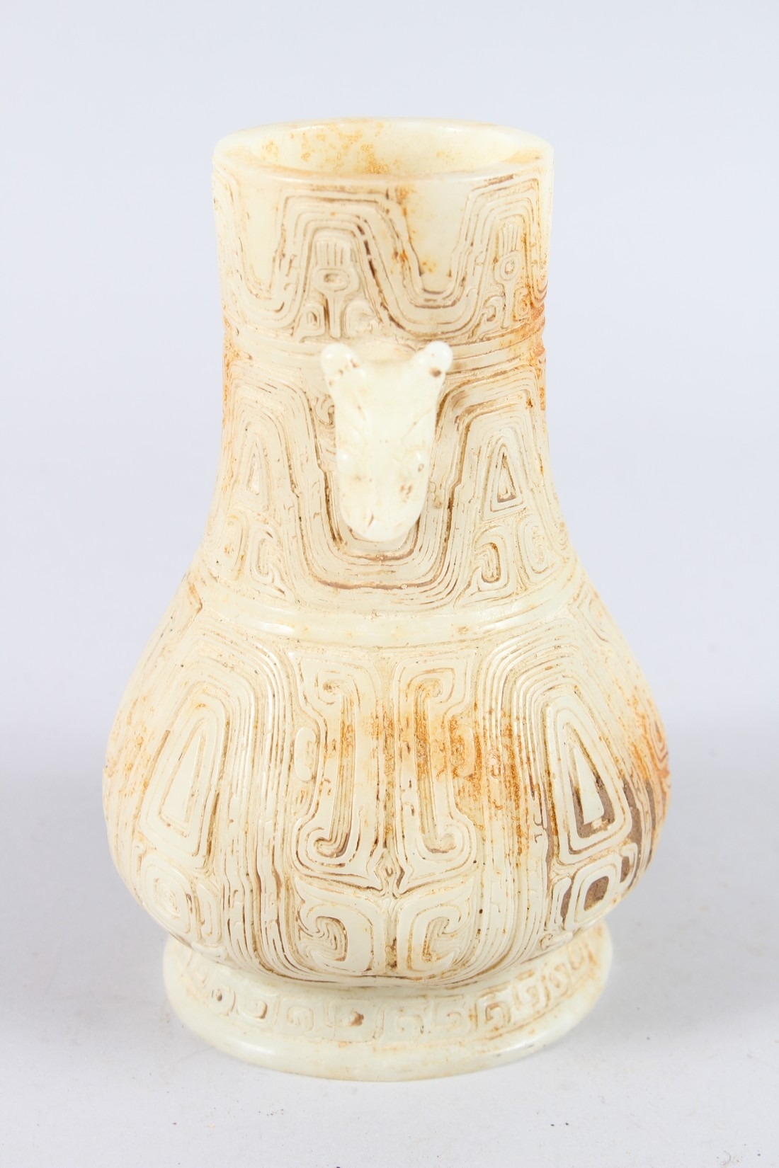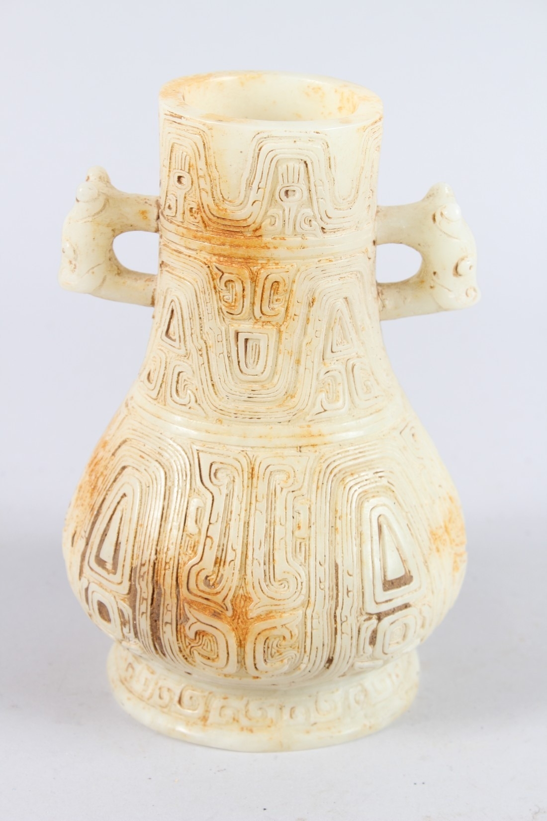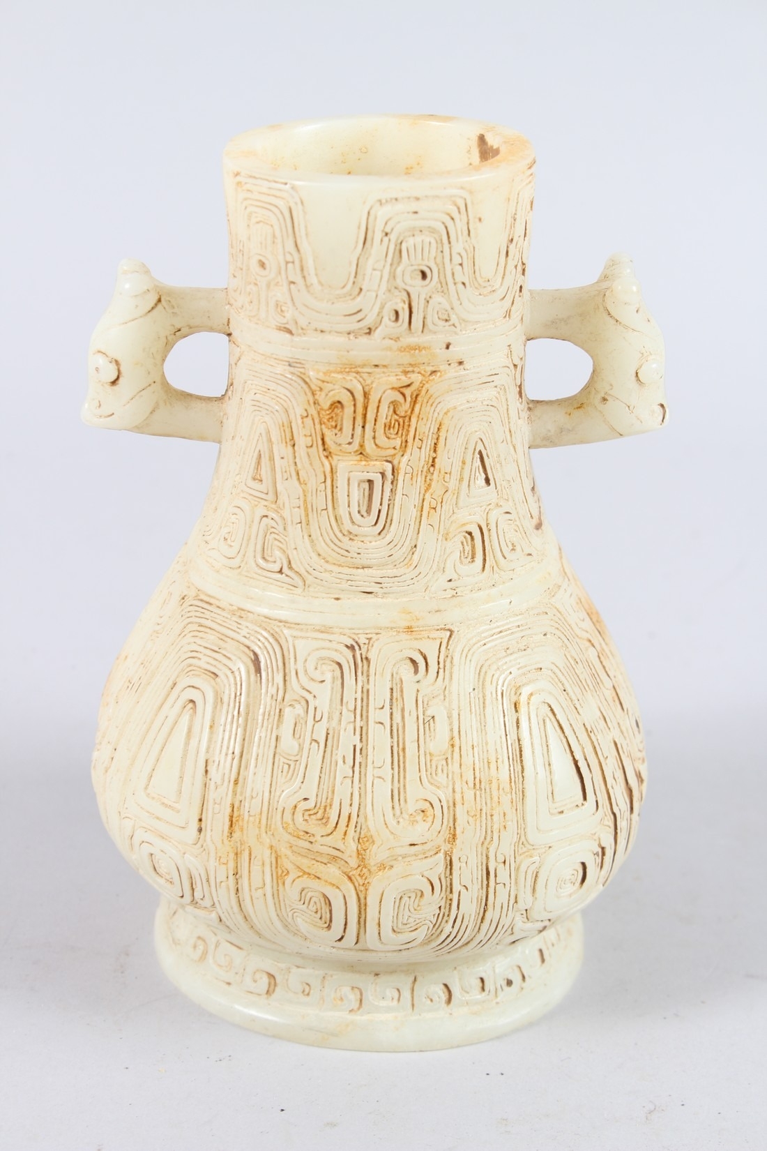 A CHINESE ARCHAIC FORM CARVED JADEITE TWIN HANDLED VASE. 21cms high.