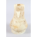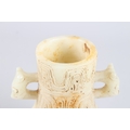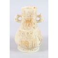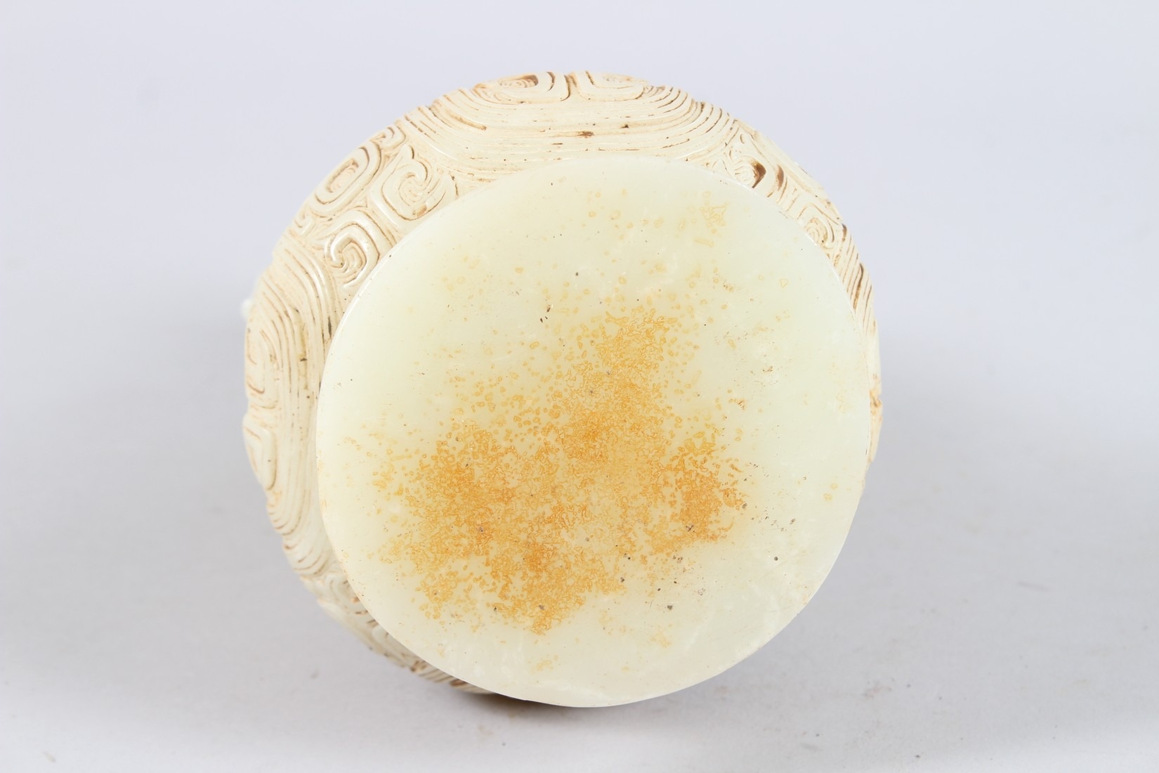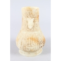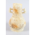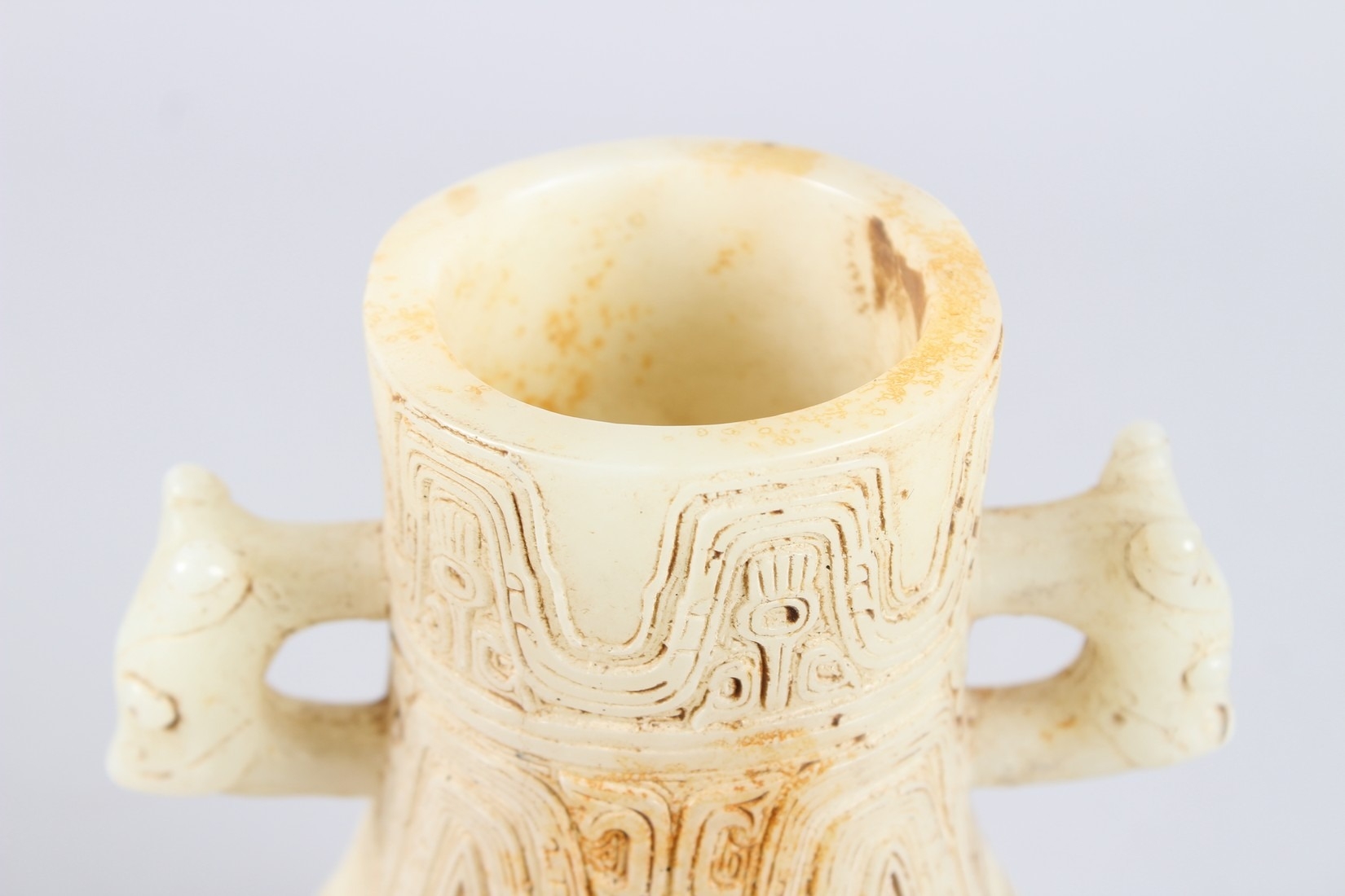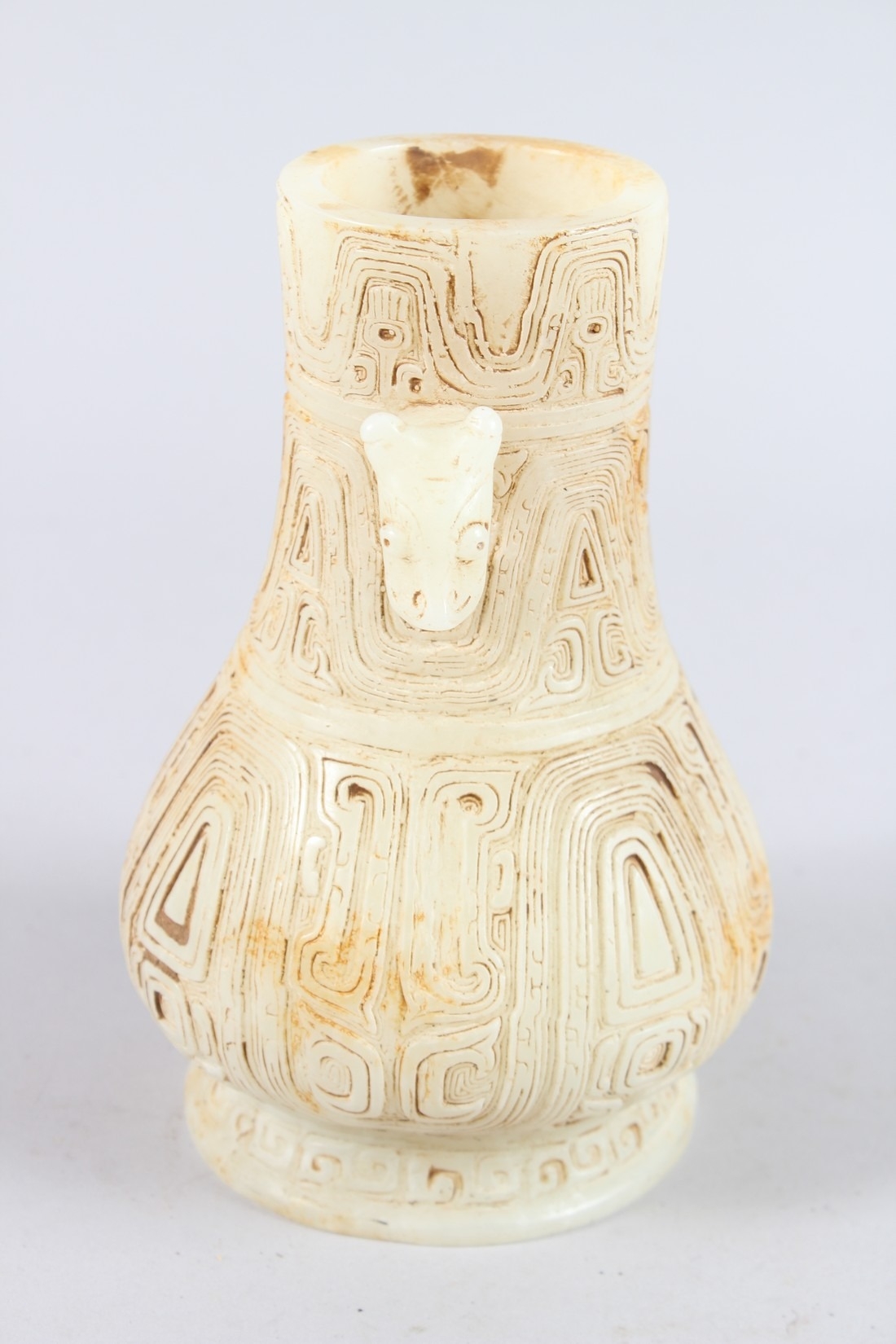 A CHINESE ARCHAIC FORM CARVED JADEITE TWIN HANDLED VASE. 21cms high.