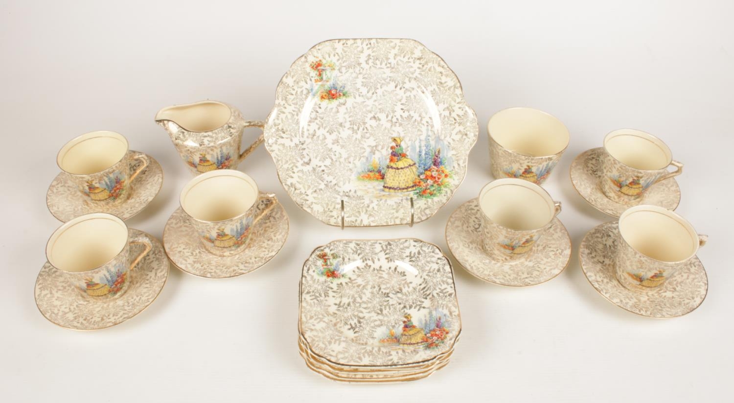 An Empire (Crinoline lady) tea set. Comprising of six cups and saucers, six side plates, sugar & cream jug & serving platter.