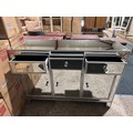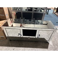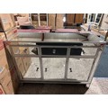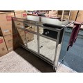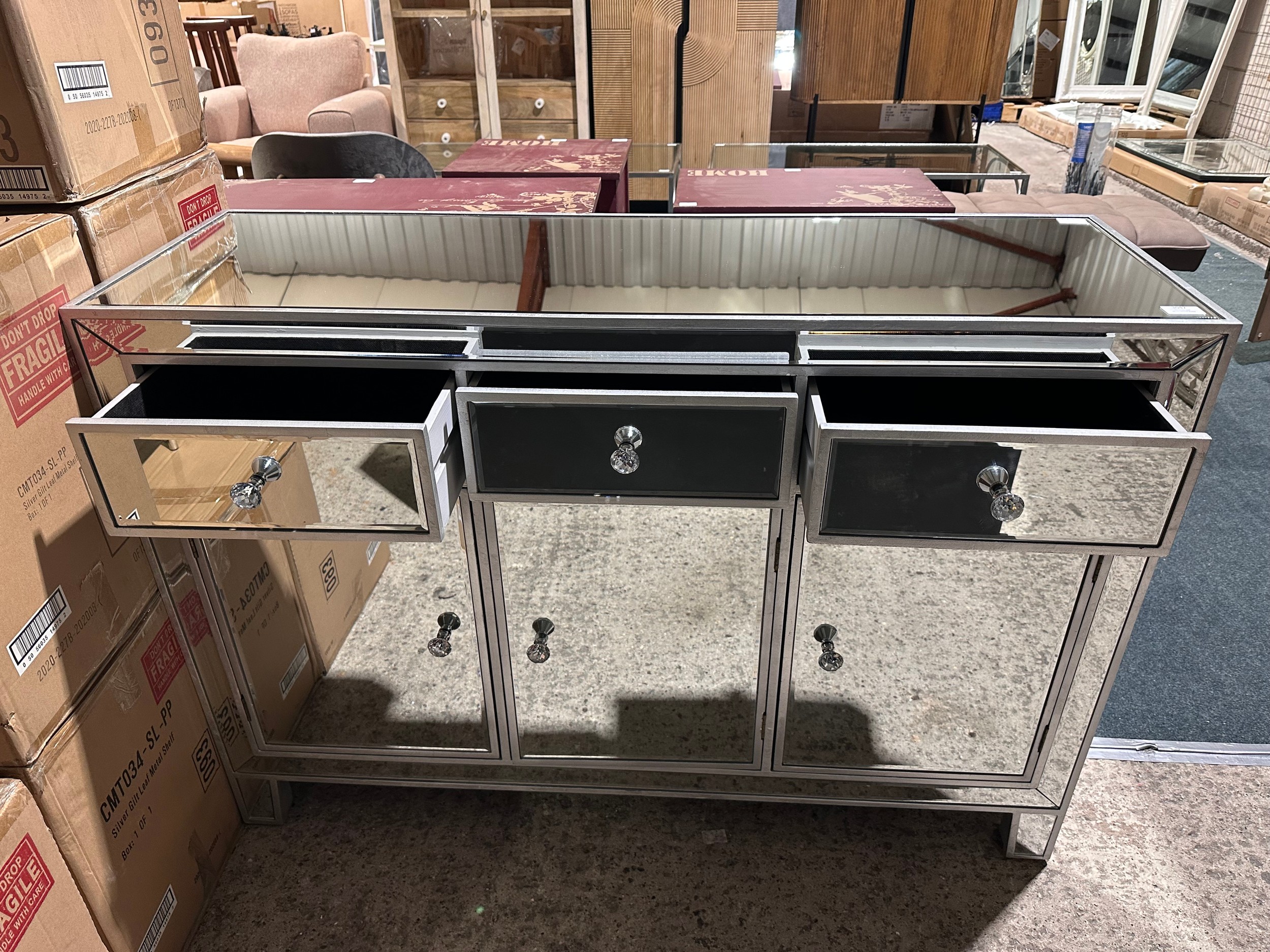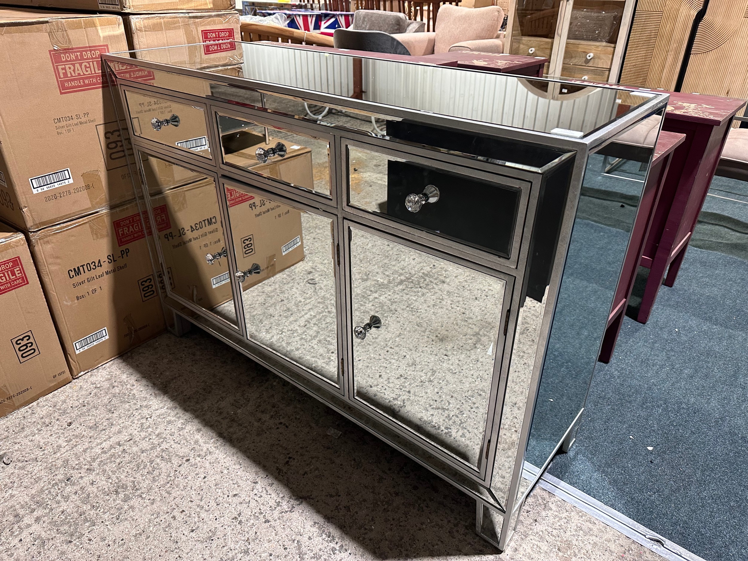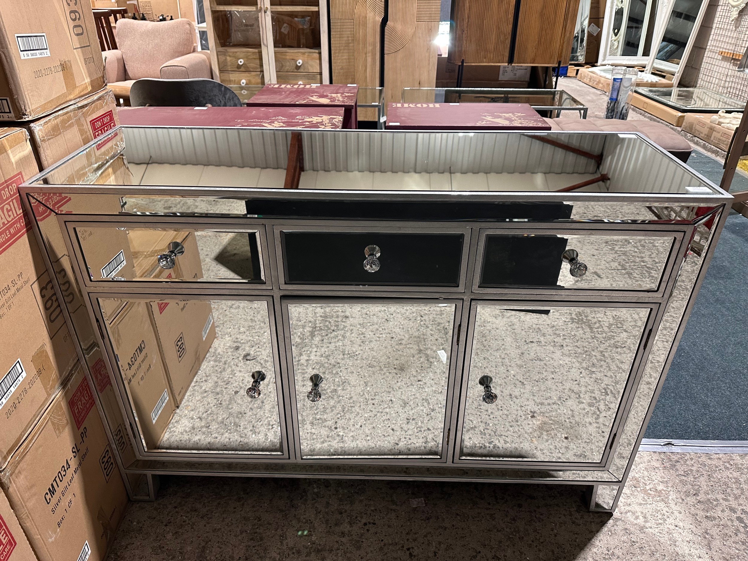 A mirrored three drawer three door sideboard (crack on doors)