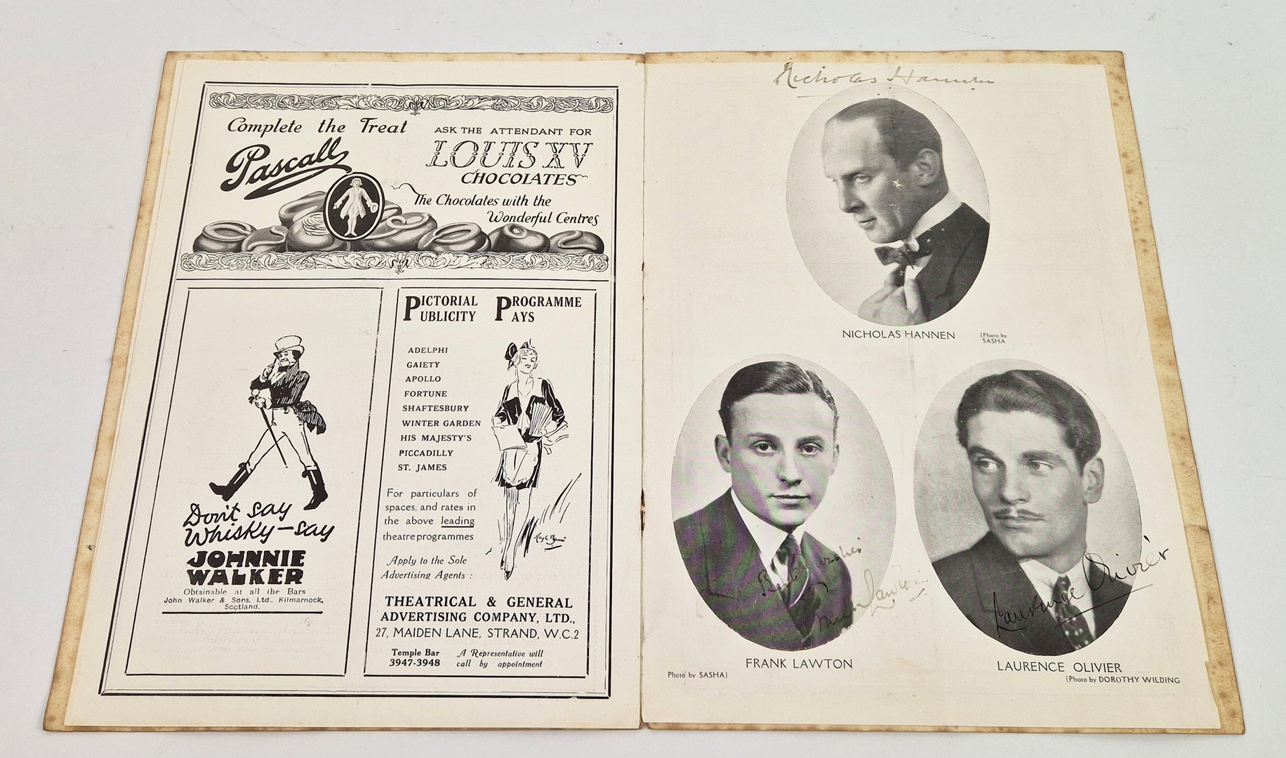 LAURENCE OLIVIER SIGNED FORTUNE THEATRE PROGRAMME, PLUS OTHERS (3). Two ca. 1930s theatre playbills. The first is a 1929 Fortune Theatre programme for THE LAST ENEMY, signed by cast members including Laurence Olivier, Athene Seyler, Nicholas Hannen, Frank Lawton, and Marjorie Mars. The second is the 1939 Lyceum Theatre farewell performance of John Gielgud's HAMLET, the final production prior to the theatre's closure.
