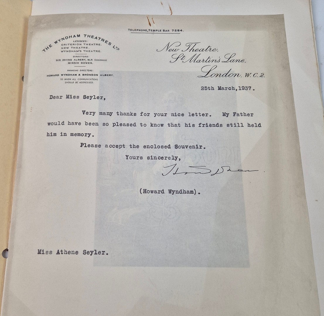 Also includes a programme for a centennial celebration for Sir Charles Wyndham, celebrated English actor and theatre proprietor. The programme contains a letter from his son Howard Wyndham to actress and friend Athene Seyler.