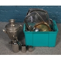 A box of metalwares, including Old Hall Stainless Steel trays, water jugs and coffee pots and a samovar.