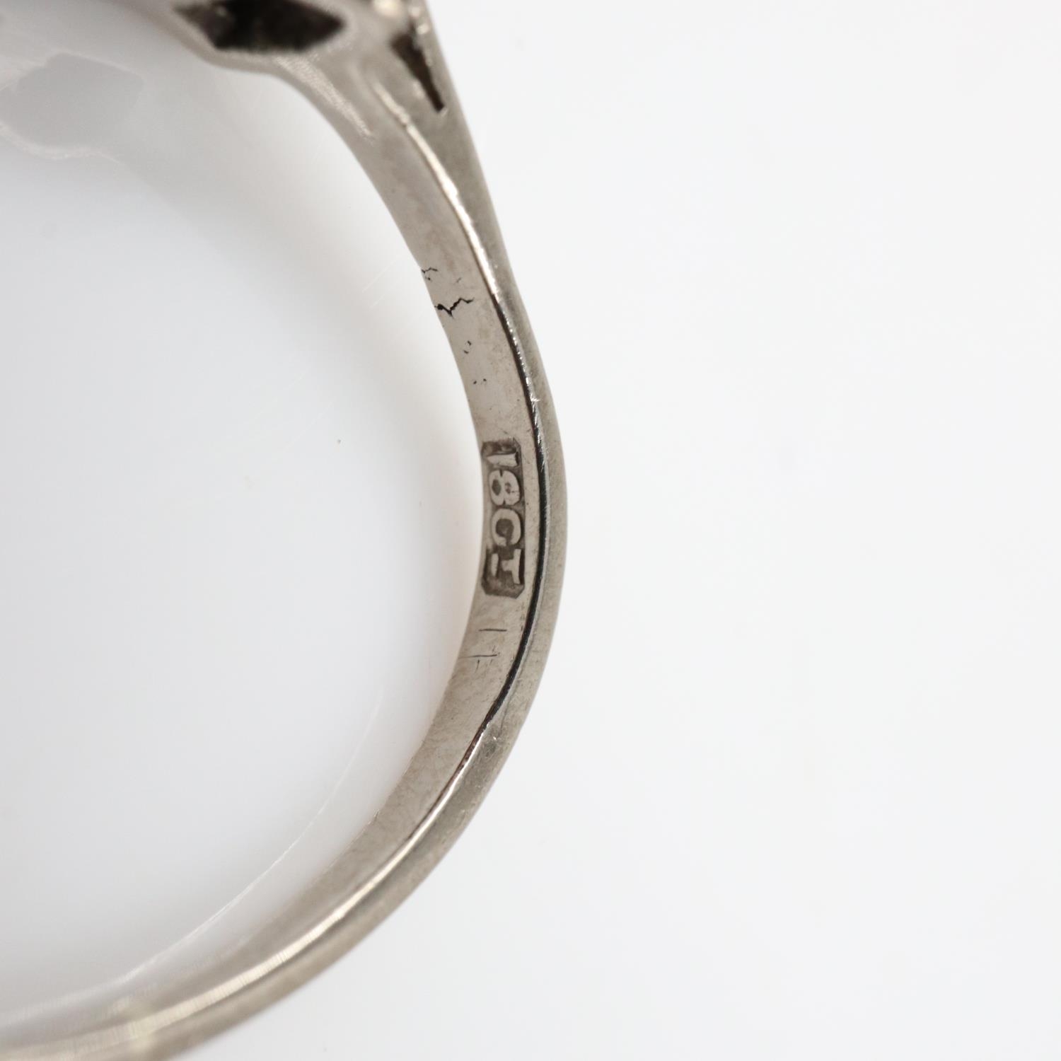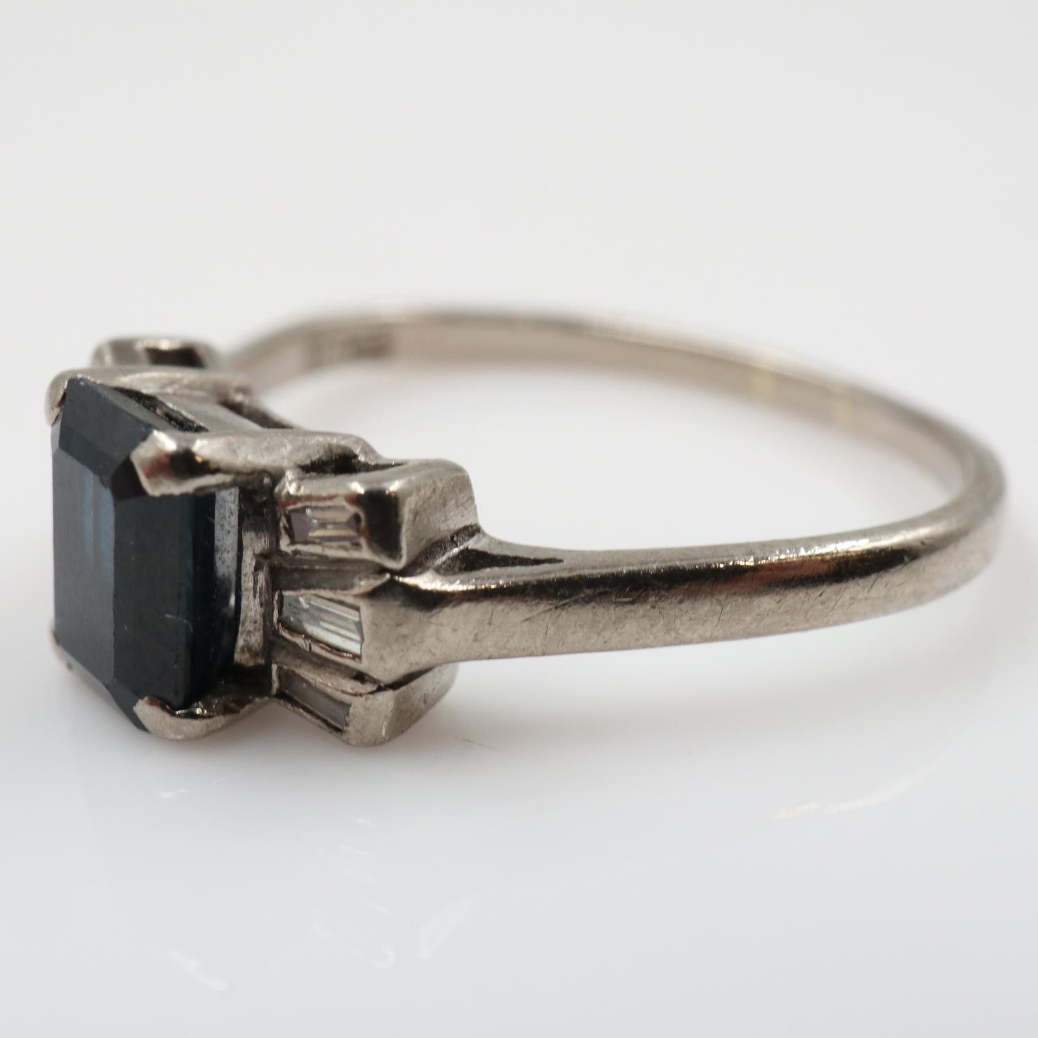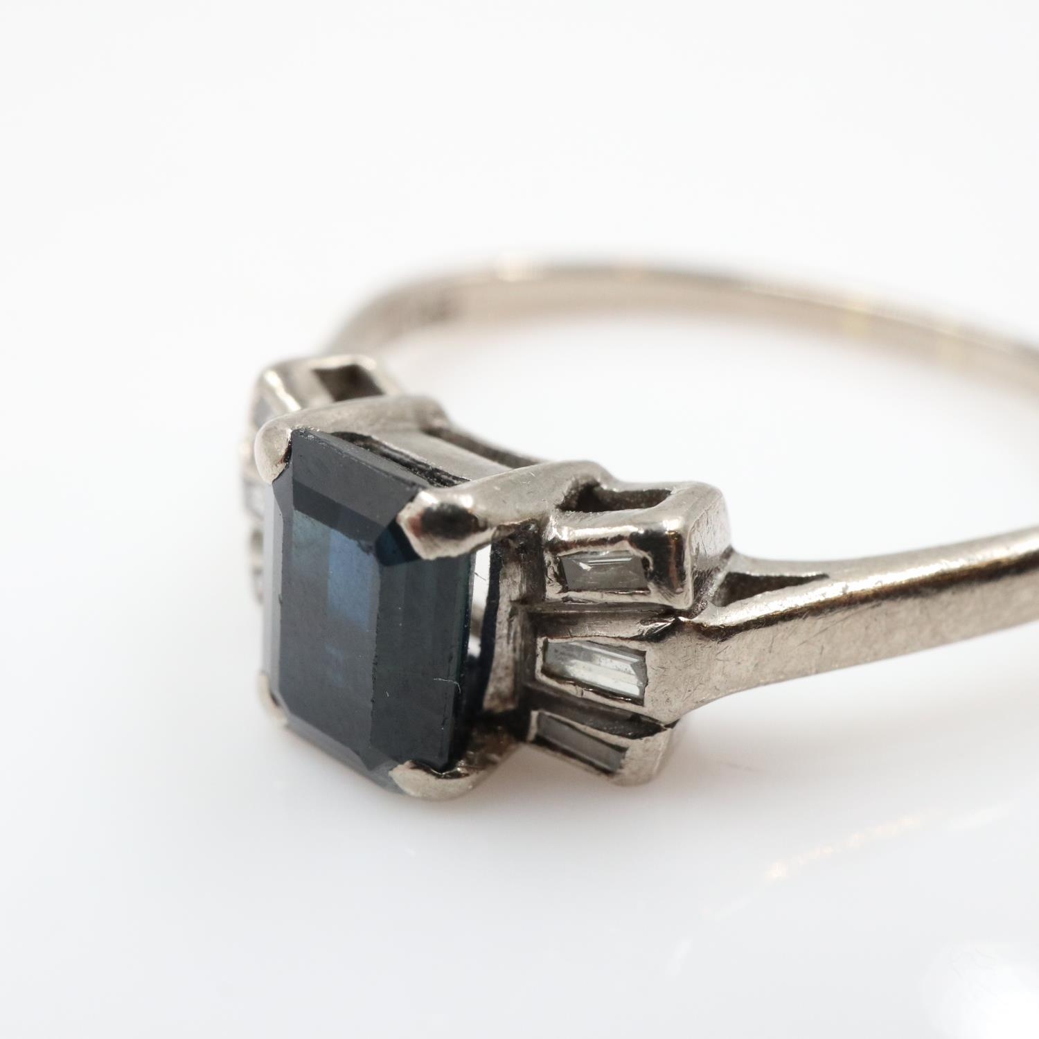 18ct white gold ring set with an emerald-cut sapphire flanked by six baguette cut diamonds, size N, 3.4g. UK P&P Group 0 (£7+VAT for the first lot and £1+VAT for subsequent lots)