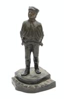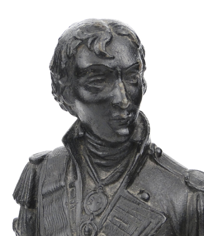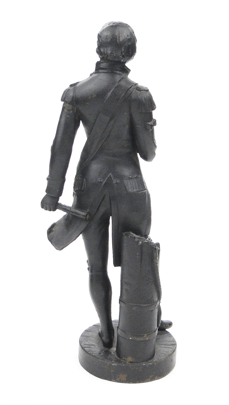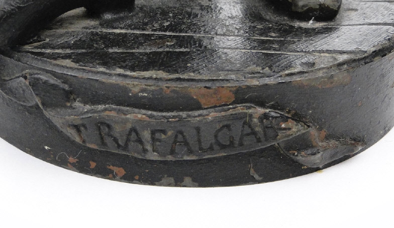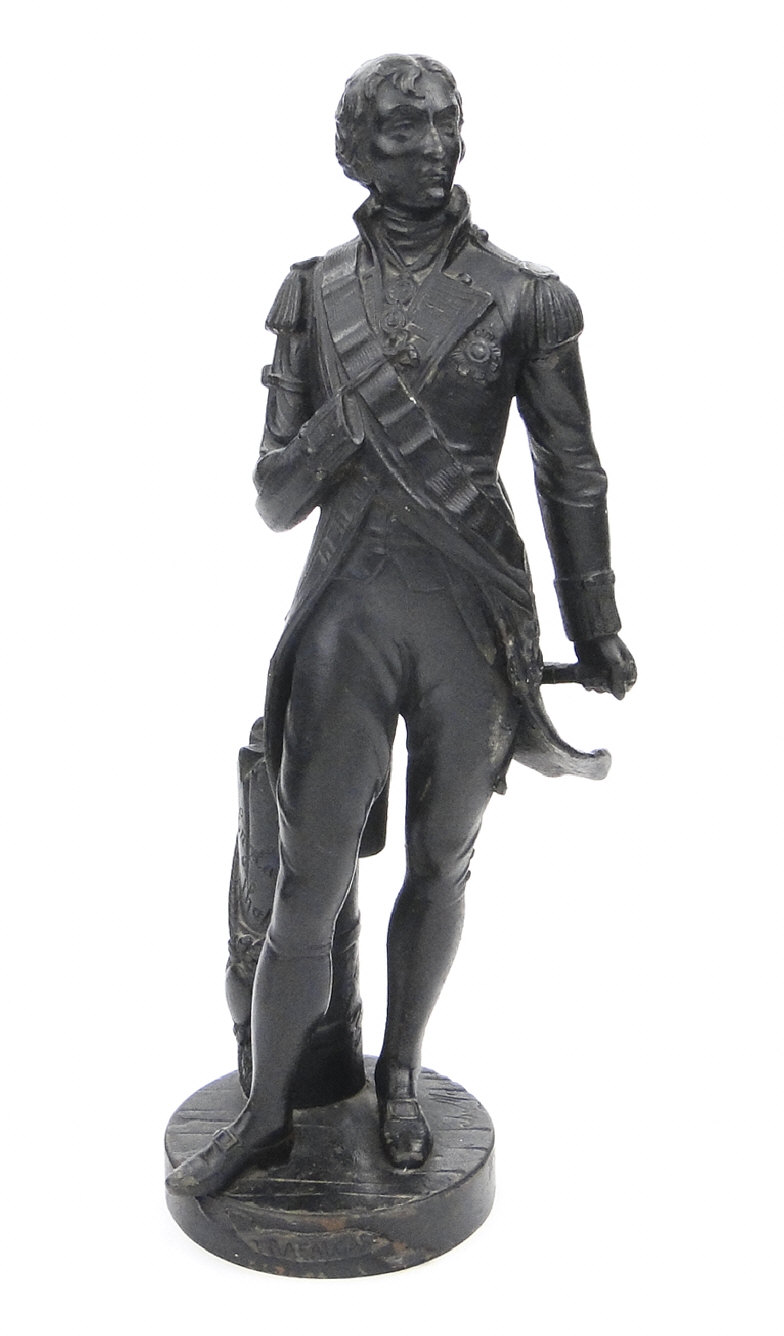 Spelter figure of Admiral Nelson titled 'Trafalgar' and indistinctly signed to the base, 43cm high