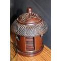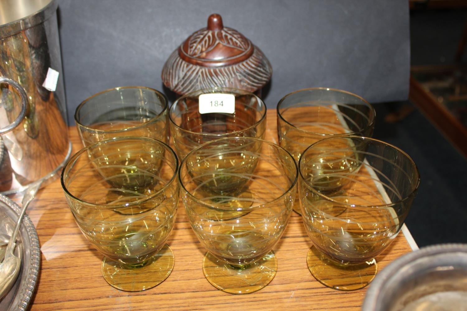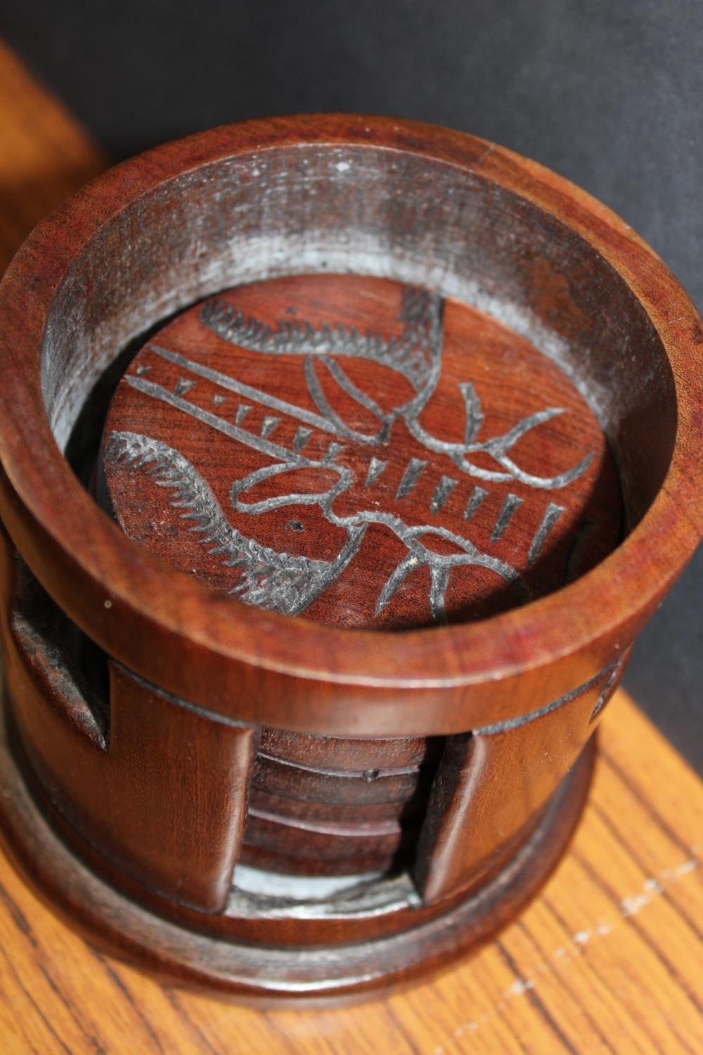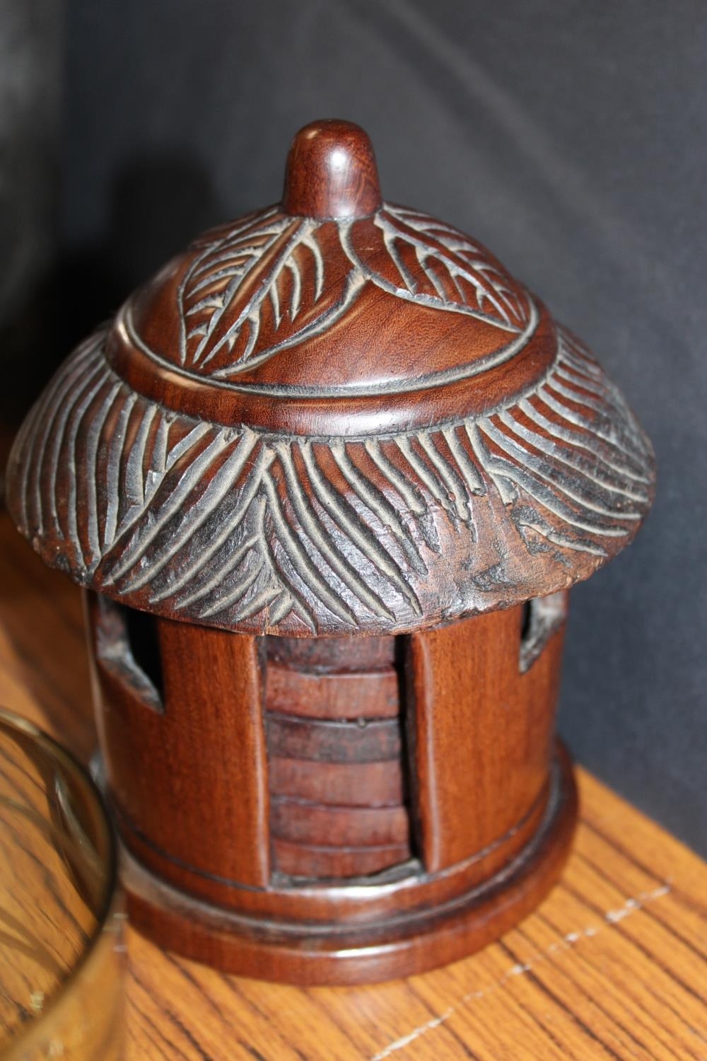 Carved hardwood set of six coasters held in hut shaped box and a set of green glass brandy glasses with swirl decoration.