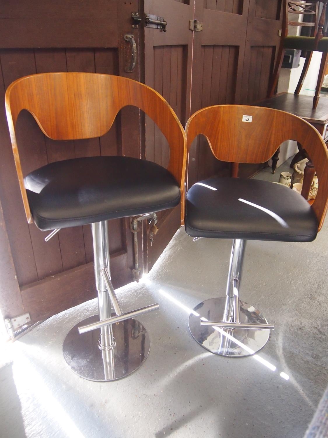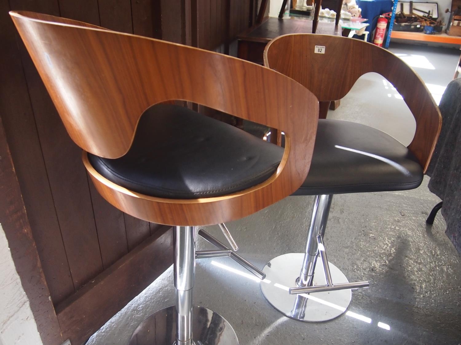 A pair of heavy swivel kitchen/bar stools in a Retro design - height adjustable on chrome base, black leather effect to seat and curved wooden backs