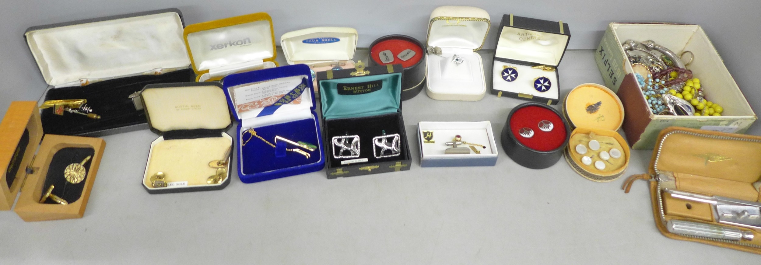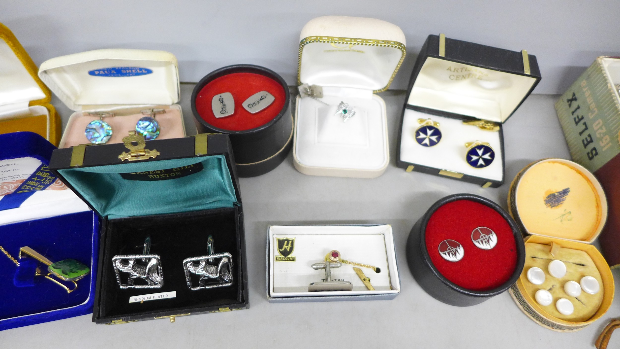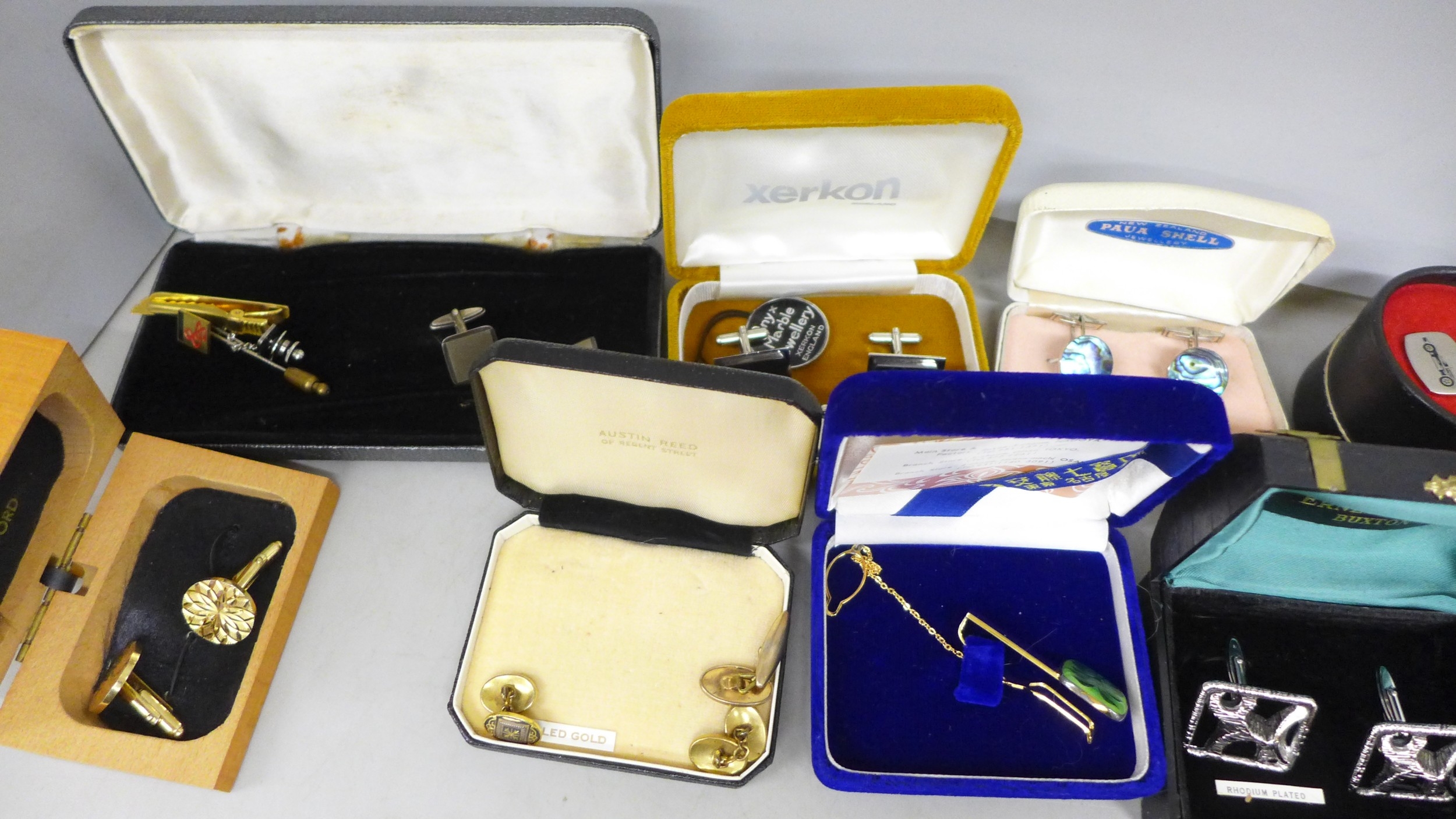 A collection of cufflinks and tie-pins