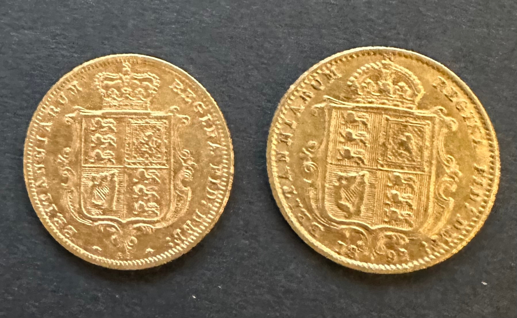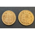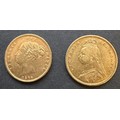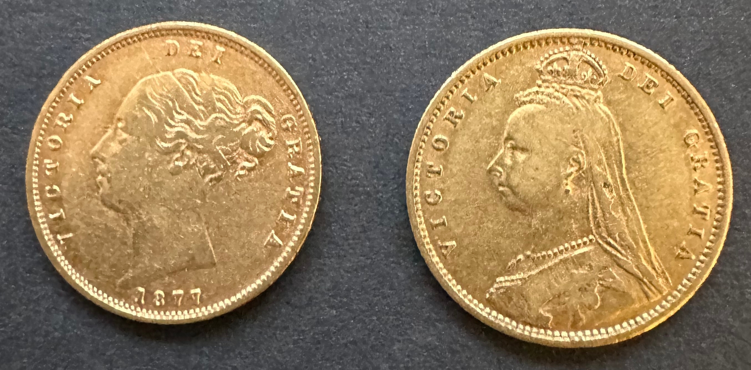 QV 1877 young head and 1892 jubilee head Victorian 22k gold shield back sovereign coins 8g